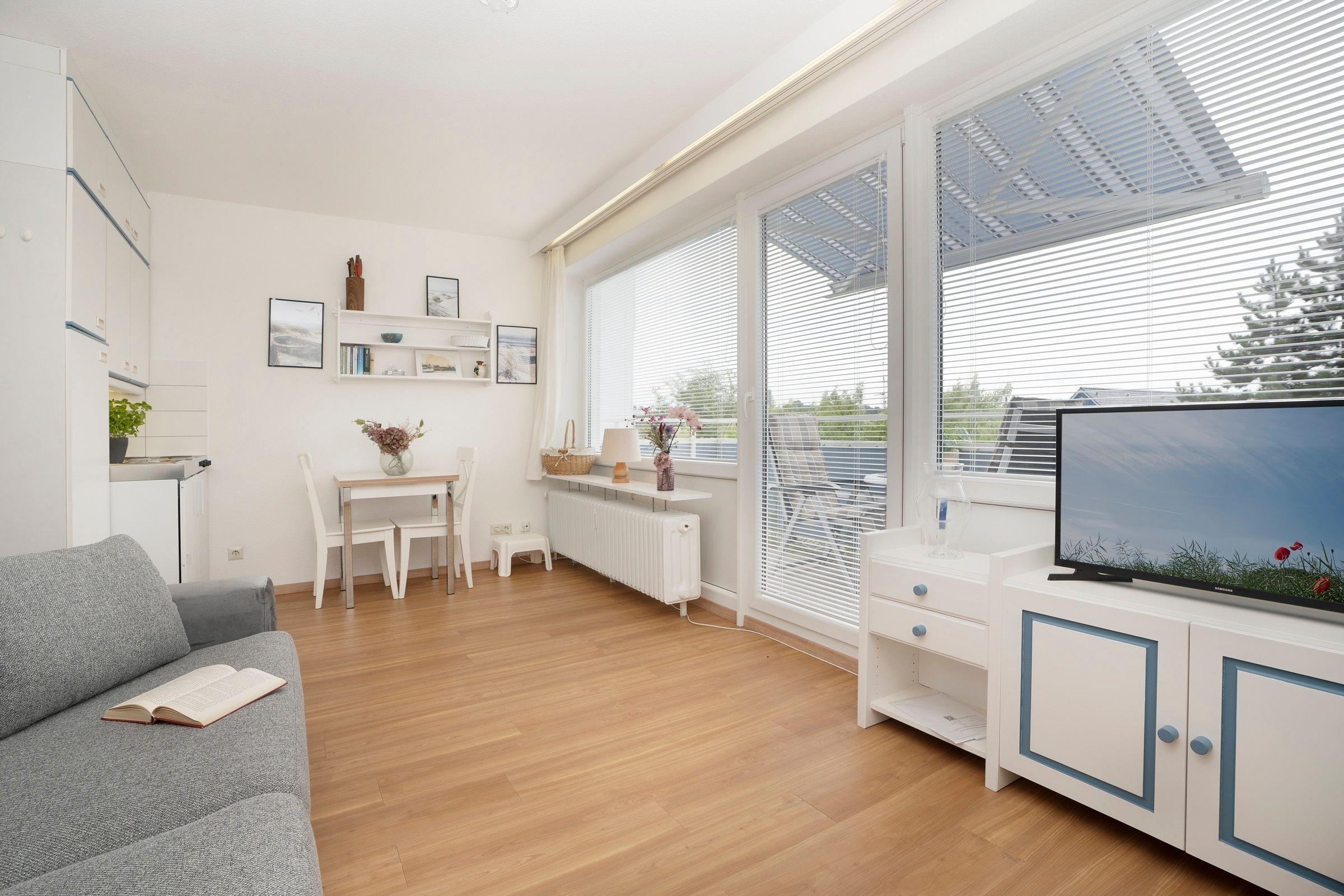Der kombinierte Wohn-Schlafraum ist mit einem gemütlichen Schlafsofa (160x200 cm) sowie einem Flachbildfernseher ausgestattet und grenzt an den Essbereich mit ausreichend Platz für alle Gäste. Von hier aus gelangen Sie auf den möblierten Balkon mit Markise und tollem Panoramablick über die Dächer von Scharbeutz. Die offene Küche ist mit einem Herd, Kühlschrank mit Gefrierfach und einer Kaffeemaschine ausgestattet. Das hell geflieste Badezimmer mit Dusche und beheizbarem Handtuchhalter rundet den Komfort dieser Ferienwohnung ab.