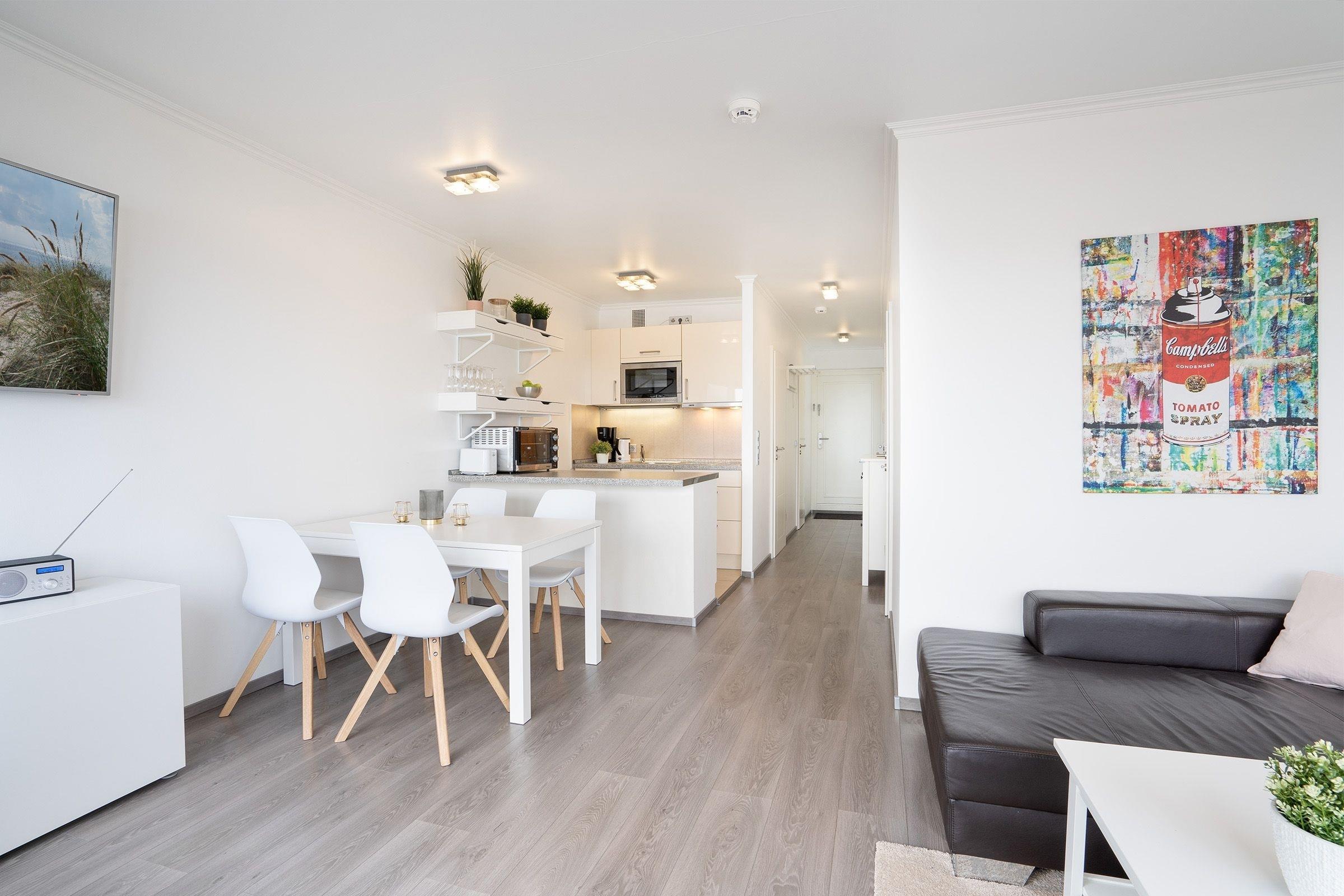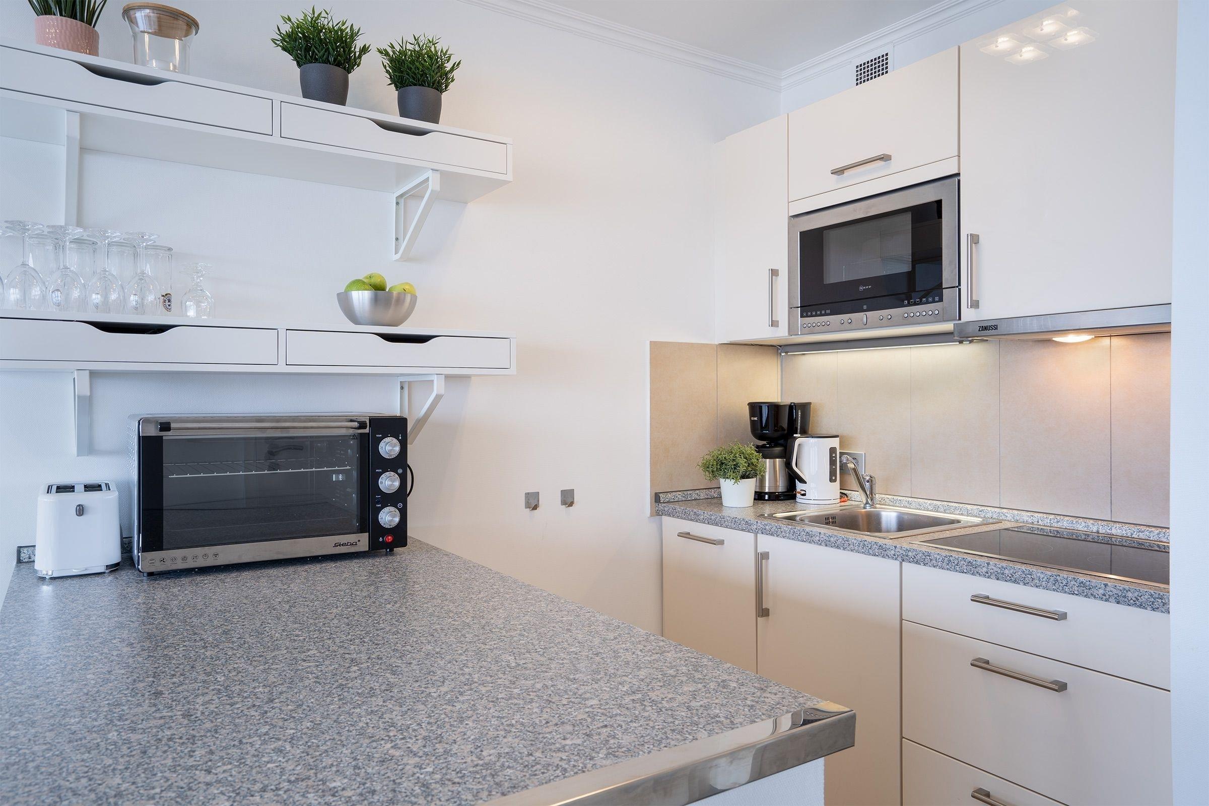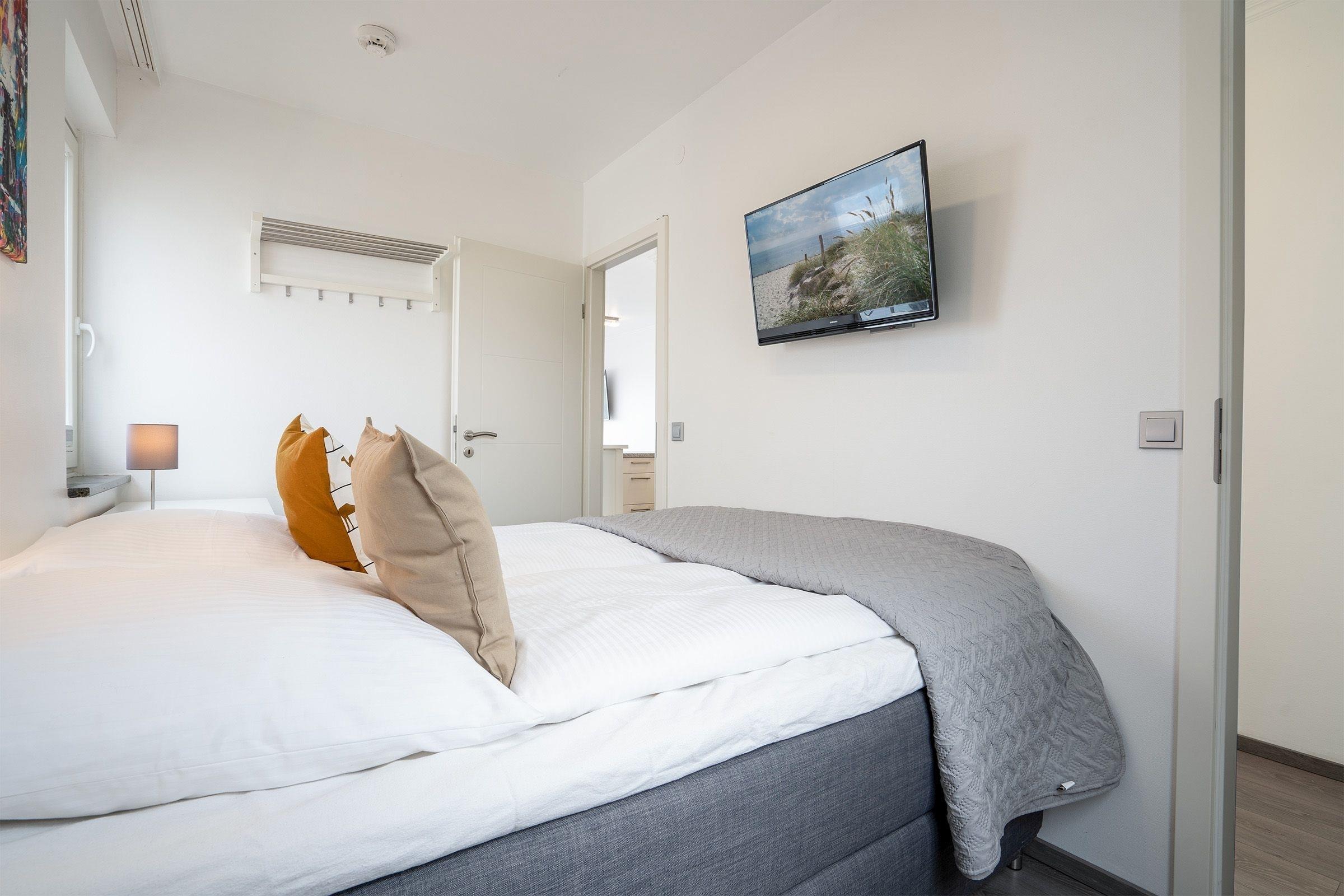 Das stilvoll eingerichtete Wohnzimmer begrüßt Sie mit einem großen Ecksofa, einem Flachbildfernseher und Zugang zum Balkon. Die offene Küche ist z. B. mit einem Herd, einem Backofen sowie einem Geschirrspüler gut ausgestattet und bietet am Esstisch ausreichend Platz für bis zu 4 Personen. Das kleinere Schlafzimmer ist mit einem Boxspring-Doppelbett (140x200 cm), einem Fernseher und einem Kleiderschrank ausgestattet. Das größere Schlafzimmer erwartet Sie ebenfalls mit einem Boxspring-Doppelbett (160x200 cm), einer Kommode und einem weiteren Fernseher. In beiden Schlafzimmern sorgen Plissees für Verdunkelung. Im Badezimmer mit Fenster, Dusche und WC sorgen ein Waschbeckenunterschrank und ein weiterer Hängeschrank für ausreichend Stauraum. Lassen Sie den Tag auf dem möblierten Balkon ausklingen und genießen Sie den Blick auf die Ostsee.