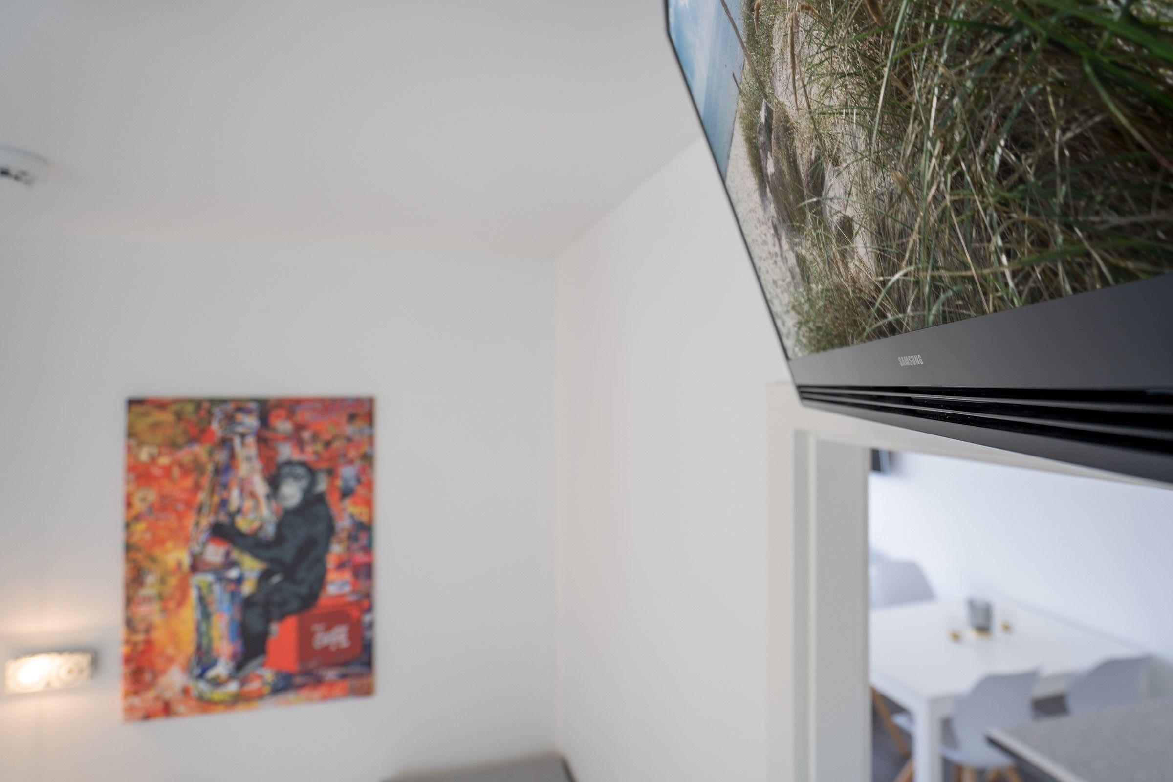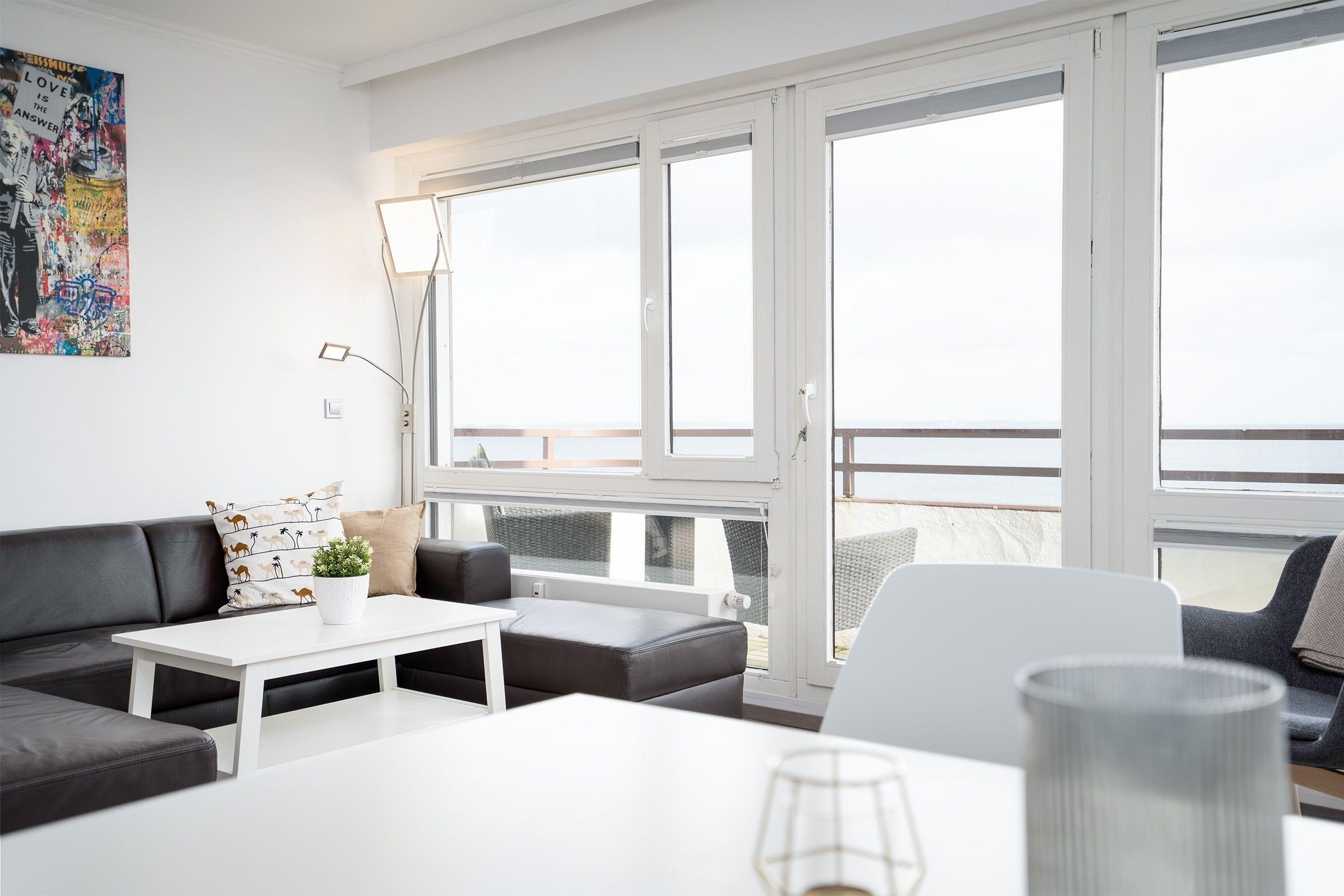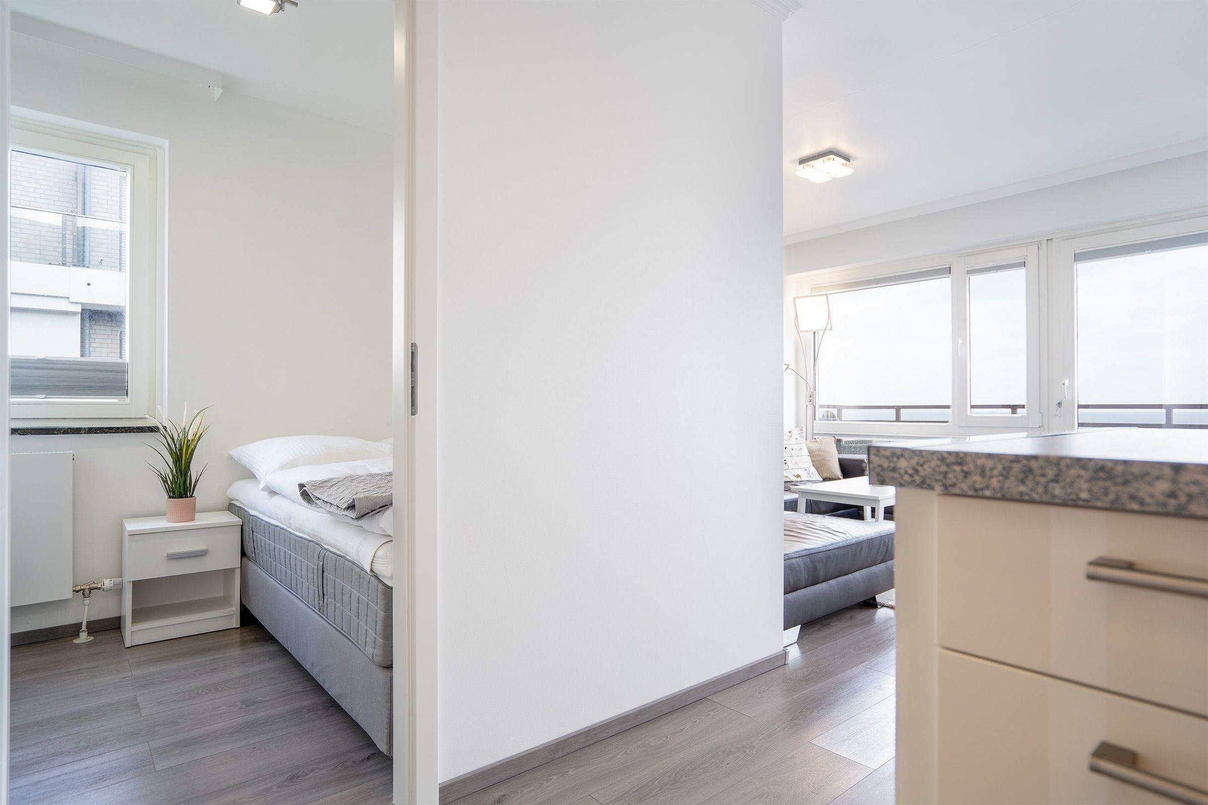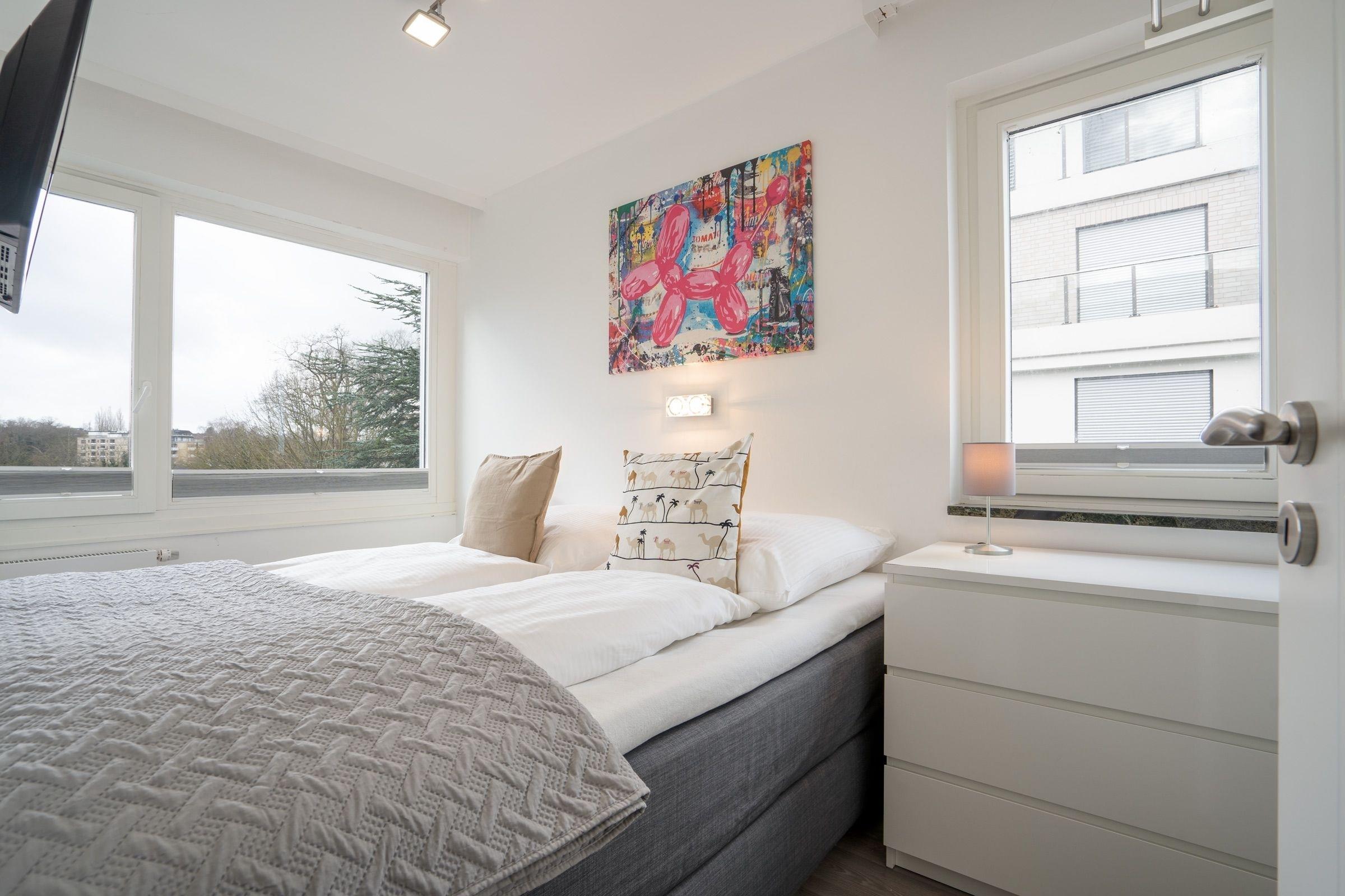 Das stilvoll eingerichtete Wohnzimmer begrüßt Sie mit einem großen Ecksofa, einem Flachbildfernseher und Zugang zum Balkon. Die offene Küche ist z. B. mit einem Herd, einem Backofen sowie einem Geschirrspüler gut ausgestattet und bietet am Esstisch ausreichend Platz für bis zu 4 Personen. Das kleinere Schlafzimmer ist mit einem Boxspring-Doppelbett (140x200 cm), einem Fernseher und einem Kleiderschrank ausgestattet. Das größere Schlafzimmer erwartet Sie ebenfalls mit einem Boxspring-Doppelbett (160x200 cm), einer Kommode und einem weiteren Fernseher. In beiden Schlafzimmern sorgen Plissees für Verdunkelung. Im Badezimmer mit Fenster, Dusche und WC sorgen ein Waschbeckenunterschrank und ein weiterer Hängeschrank für ausreichend Stauraum. Lassen Sie den Tag auf dem möblierten Balkon ausklingen und genießen Sie den Blick auf die Ostsee.