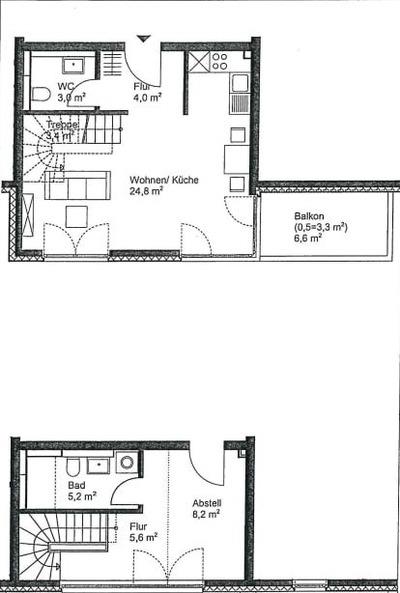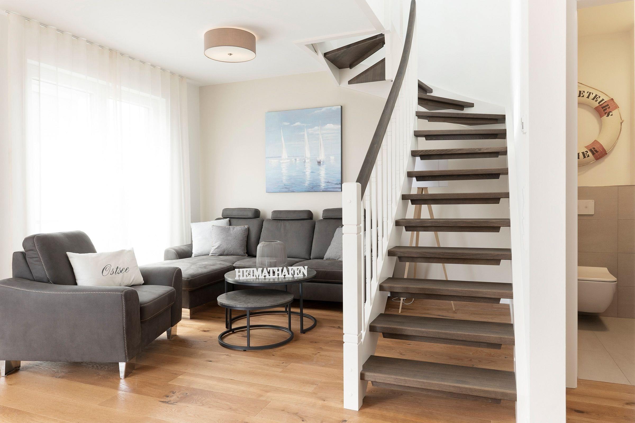 Ein modern eingerichteter Wohnraum empfängt Sie und bietet mit einem Schlafsofa (120x200 cm), sowie einer offenen und voll ausgestatteten Küchenzeile einen schönen Mittelpunkt in Ihrem Feriendomizil. Auf dieser Wohnebene haben Sie auch einen direkten Zugang zum möblierten Balkon mit uneingeschränktem Meerblick. In der oberen Etage finden Sie das Schlafzimmer, das mit einem TV, einem gemütlichen Boxspringbett (180x200 cm) und genügend Platz für ein Kinderbett keine Wünsche offen lässt. Das Bad en Suite verspricht u.a. durch die bodengleiche Dusche, sowie die angenehme Fußbodenheizung einen Urlaub mit Komfort.