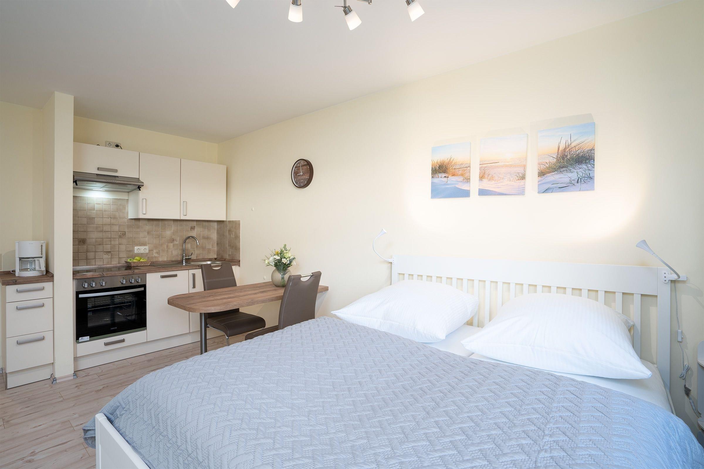 Der Wohn-/Schlafbereich lädt mit einem bequemen Doppelbett (2x 80x200 cm), einem TV und zwei Sesseln zur Erholung ein. Die offene Küche fügt sich optimal in den Wohnraum ein und ist mit vielen Annehmlichkeiten, wie z.B. Backofen, Cerankochfeld, Kühlschrank, und Kaffeemaschine ausgestattet. Das helle Duschbad mit WC und Dusche rundet dieses Wohlfühldomizil ab.
