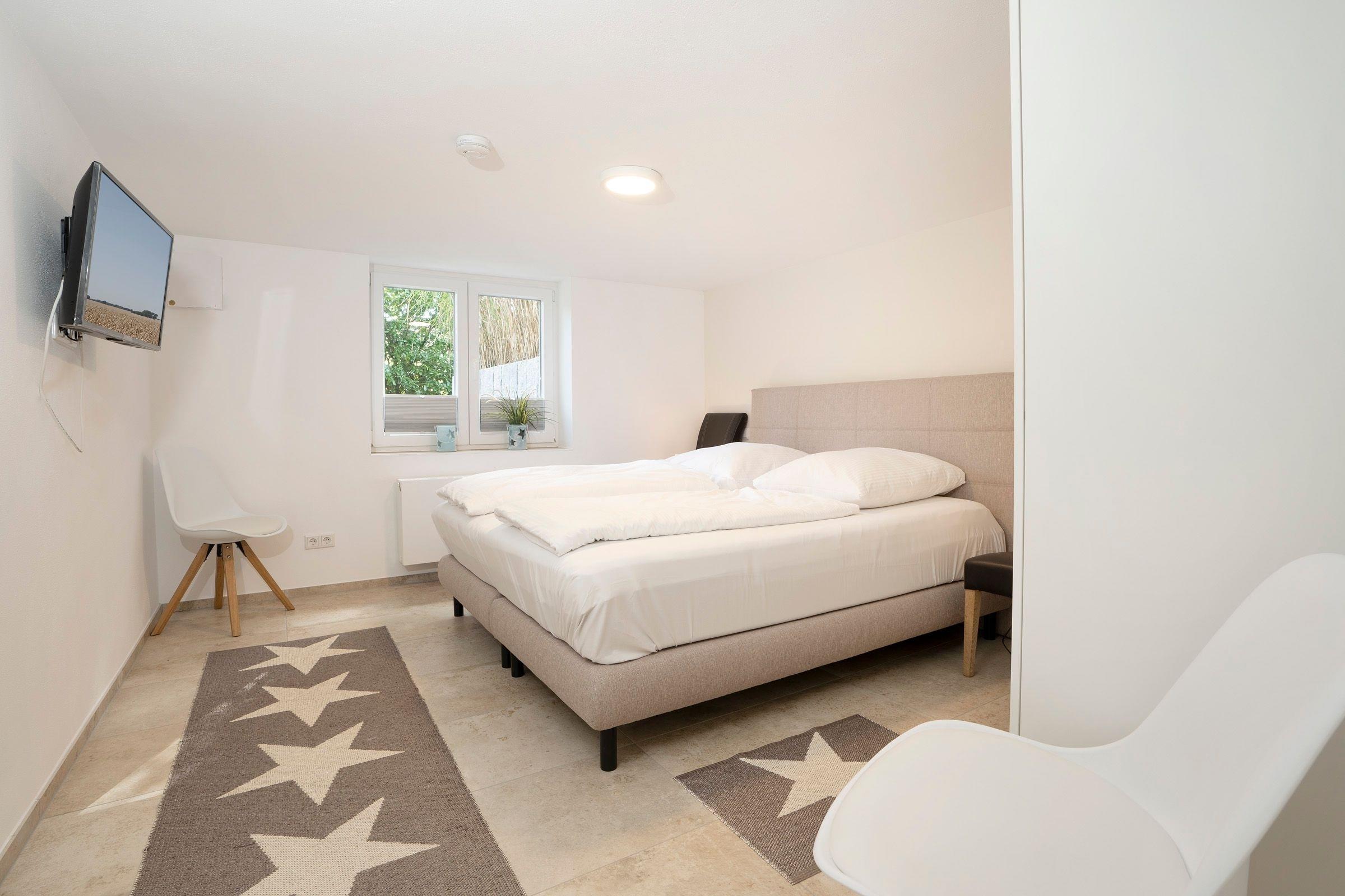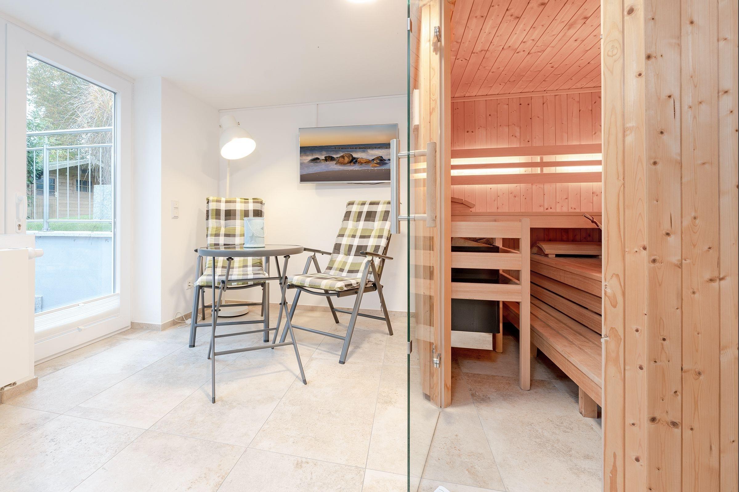 Die Wohnung empfängt Sie im Erdgeschoss mit einem gemütlichen Wohnzimmer sowie angrenzender offener Küche. Hier bereiten Sie Kaffeespezialitäten mit der Nespresso-Kapselmaschine zu, die Sie anschließend an der frischen Ostseeluft auf der Terrasse unter einem Sonnenschirm genießen können. Im Erdgeschoss befindet sich das erste Schlafzimmer mit gemütlichem Boxspring-Doppelbett (180x200 cm) und ein voll ausgestattetes Badezimmer mit bodengleicher Walk-In-Dusche und angenehmer Fußbodenheizung. Über eine Treppe gelangen Sie in die untere Etage mit eigener Sauna für kalte Winterabende. Hier gibt es außerdem ein zweites Bad mit Badewanne und bodengleicher Dusche sowie ein weiteres Schlafzimmer - ebenso mit einem Boxspring-Doppelbett (180x200 cm) ausgestattet. Der WLAN-Anschluss ist inklusive.