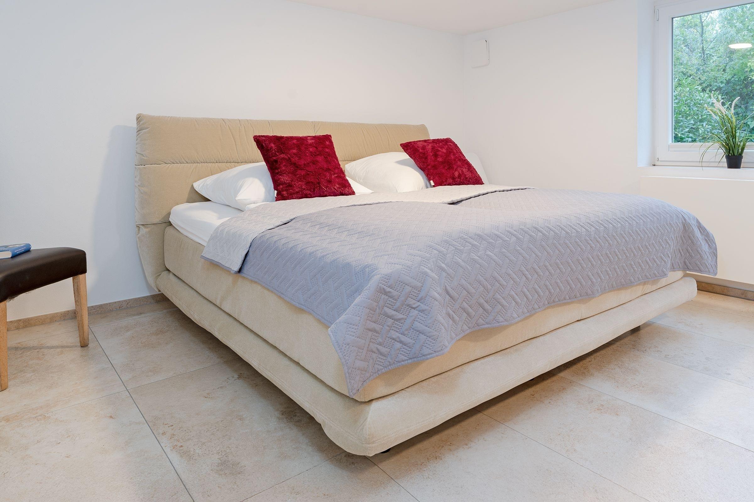 Schlafzimmer 2: Boxspringdoppelbett (180x200 cm, durchgehender Topper), Kleiderschrank, keine Verdunkelung, kein Platz für Kinderreisebett