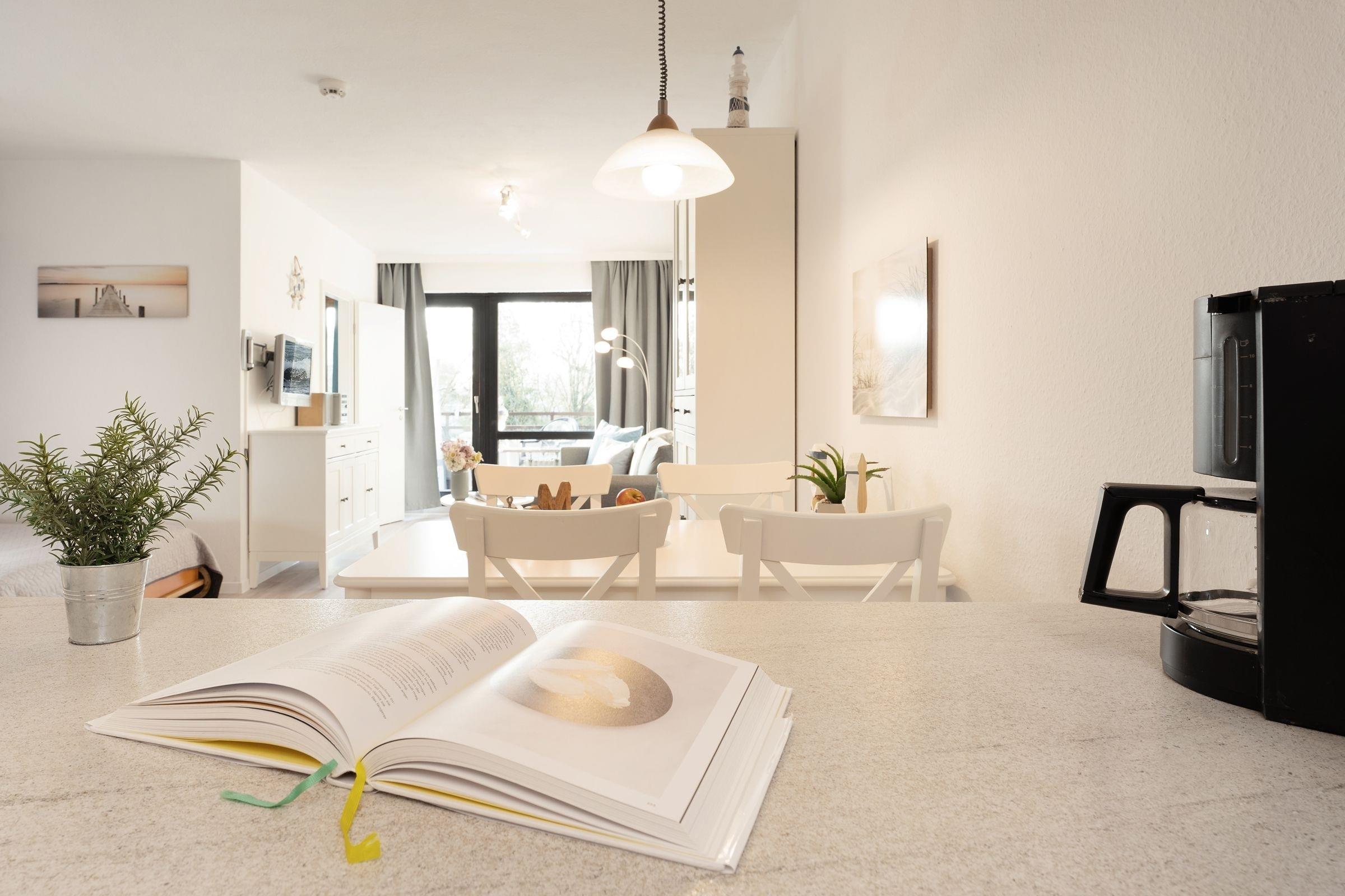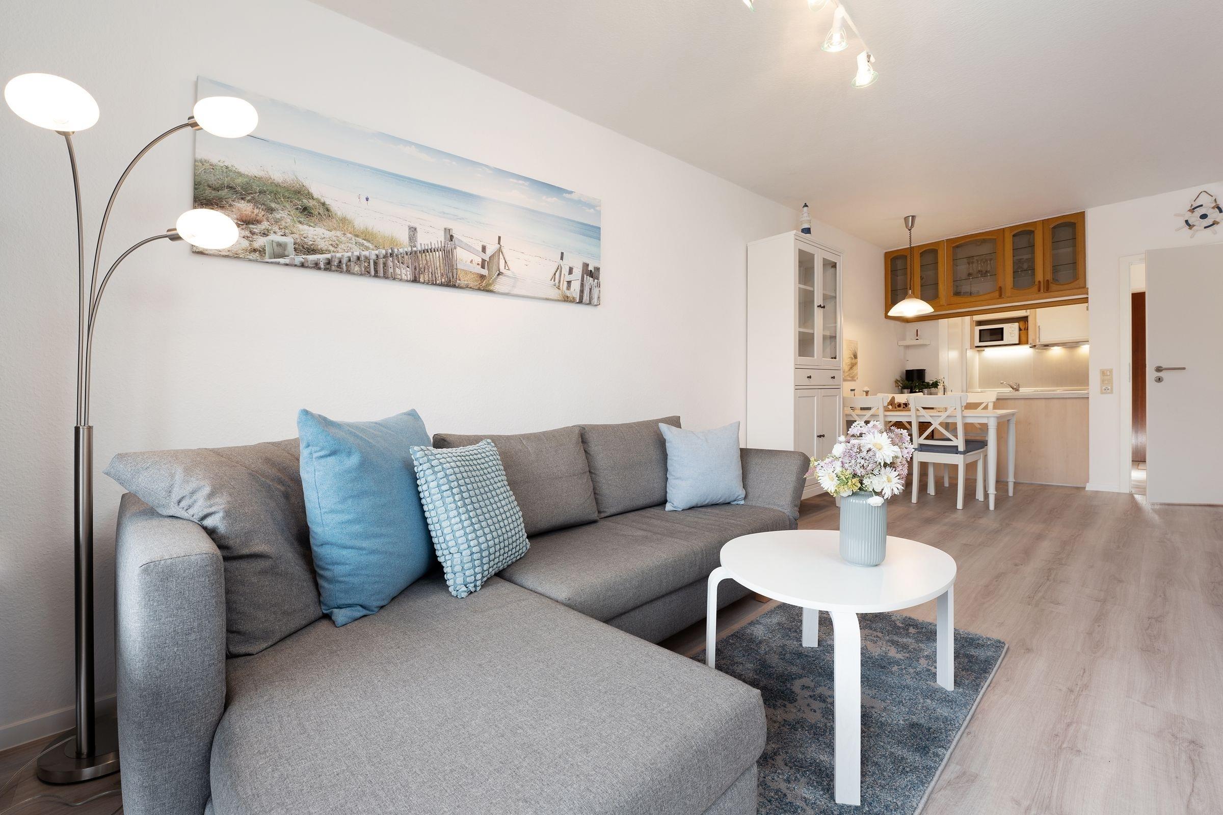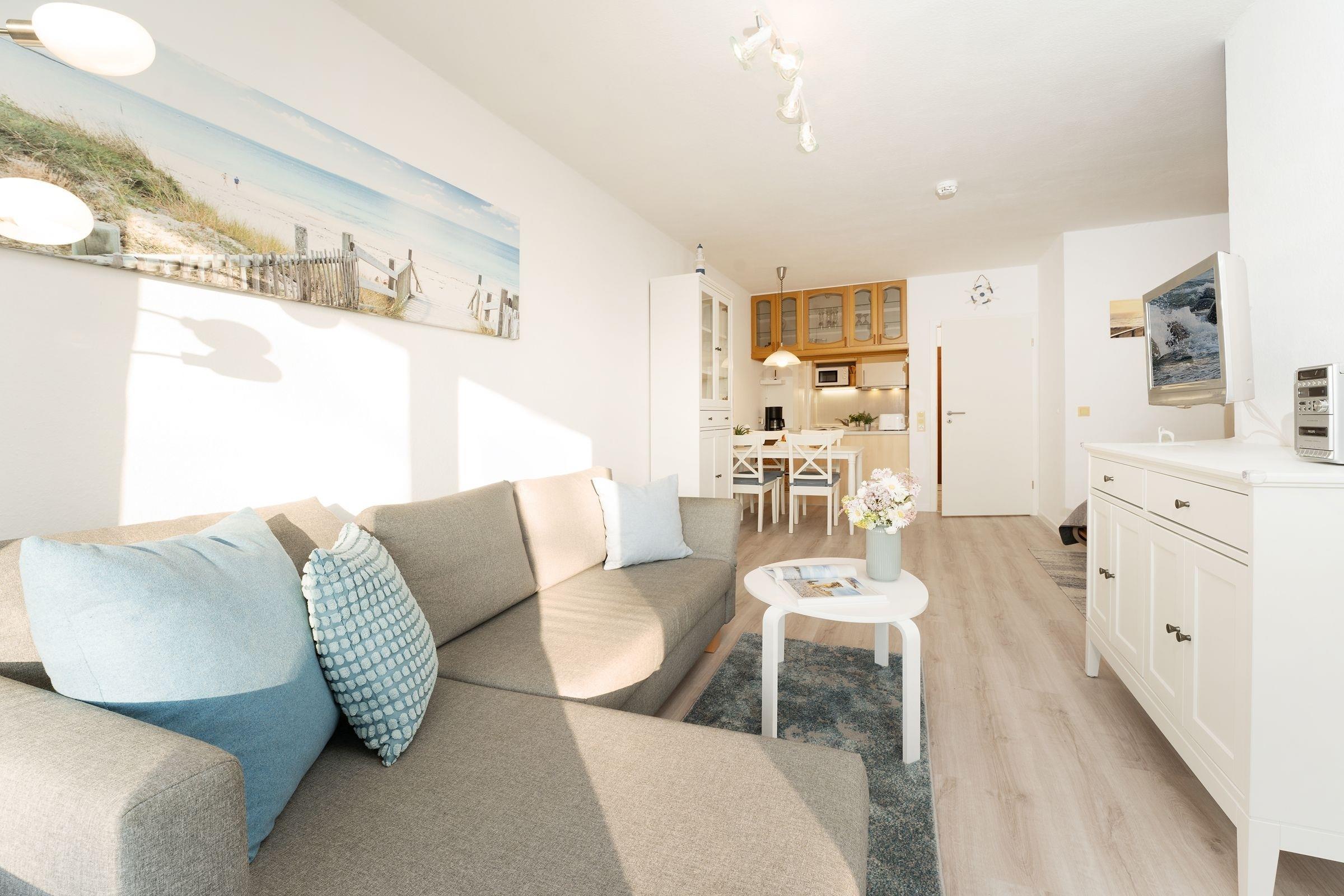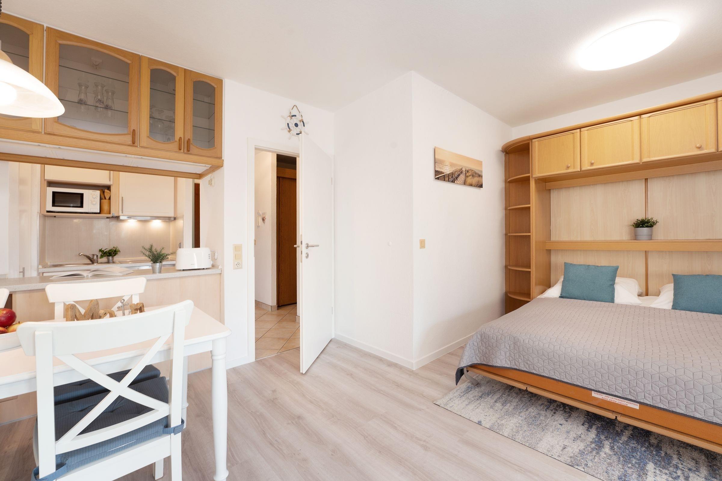 Im hellen und geräumigen Wohnbereich fühlt man sich gleich wie zu Hause: machen Sie es sich auf der Couch bequem, der Fernseher mit DVD-Player, eine Hifi-Anlage sowie der vorhandene WLAN-Anschluss sorgen für hier ausreichend Unterhaltung. Zur Nacht können Sie die Couch in einen weiteren Schlafplatz (ca. 140x200 cm) verwandeln oder das Schrankbett (2x 80x190cm) aufklappen und es sich dort gemütlich machen. Auf dem möblierten Südbalkon können Sie ihren ersten Morgenkaffee sowie Ihr Frühstück genießen, dass in der offenen, gut ausgestatteten Küche zubereitet werden kann. Zusätzlich steht Ihnen als Rückzugsort ein weiteres kleines Schlafzimmer mit einer Sofa-Liege (ca. 160x190 cm) zur Verfügung. Das moderne Bad mit Dusche und Waschtisch rundet das Angebot in dieser Ferienwohnung ab.