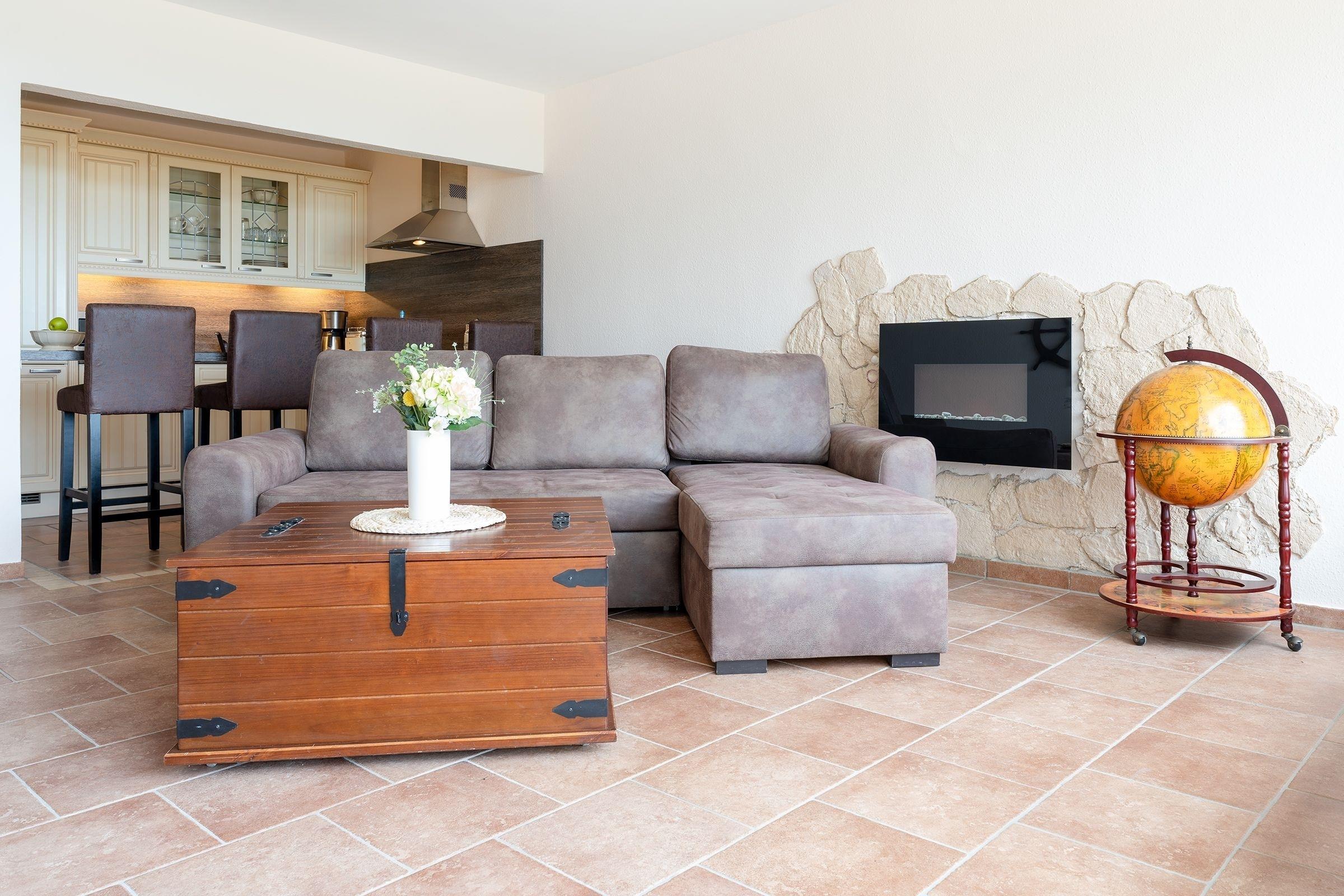 Wohnzimmer: 1 Schlafsofa (140x200 cm), TV, Verdunkelung: Gardinen, Platz für Babybett vorhanden