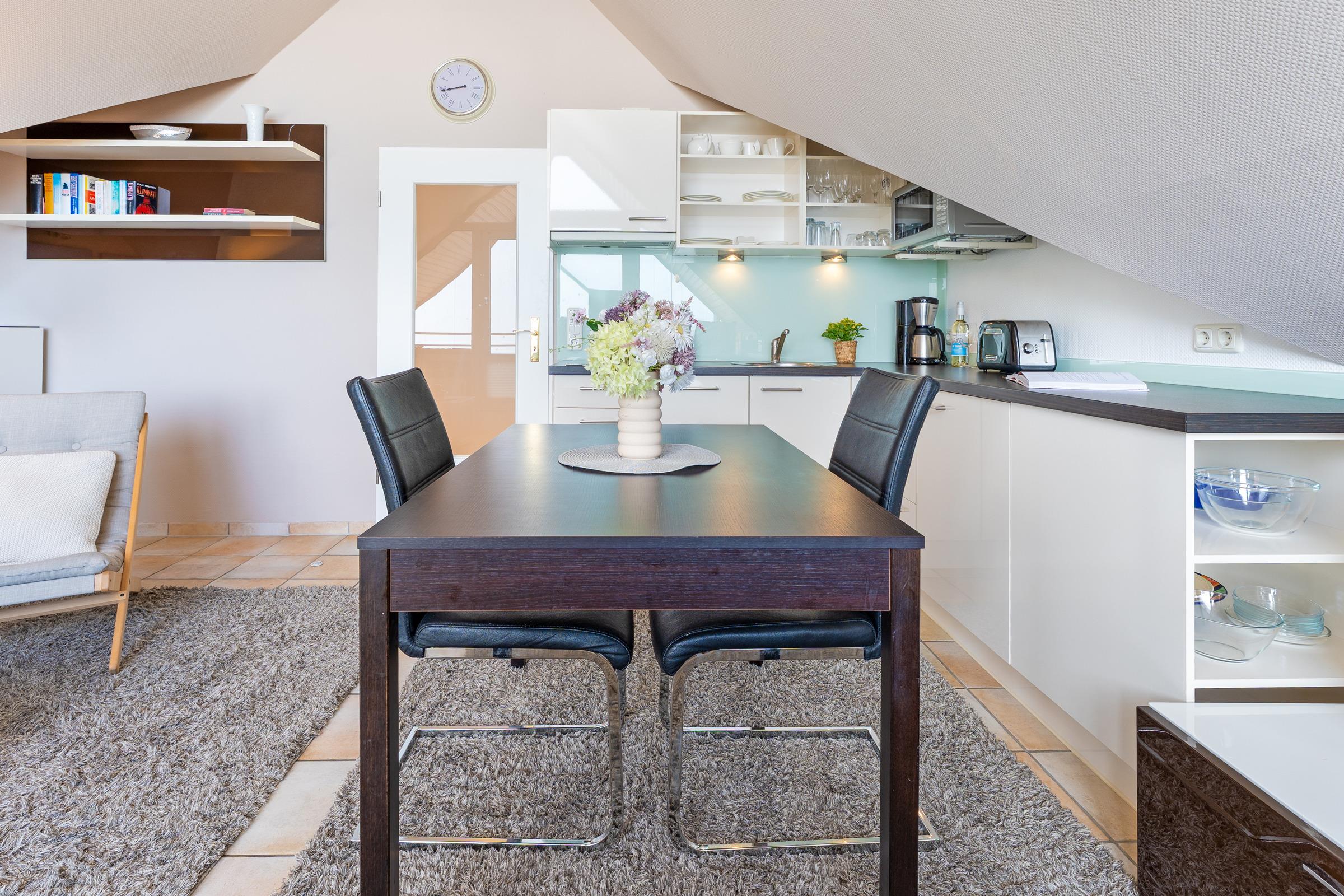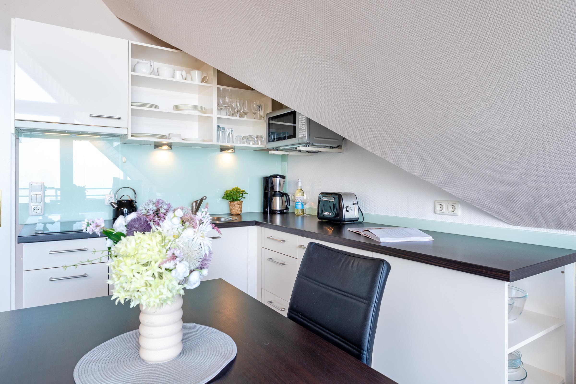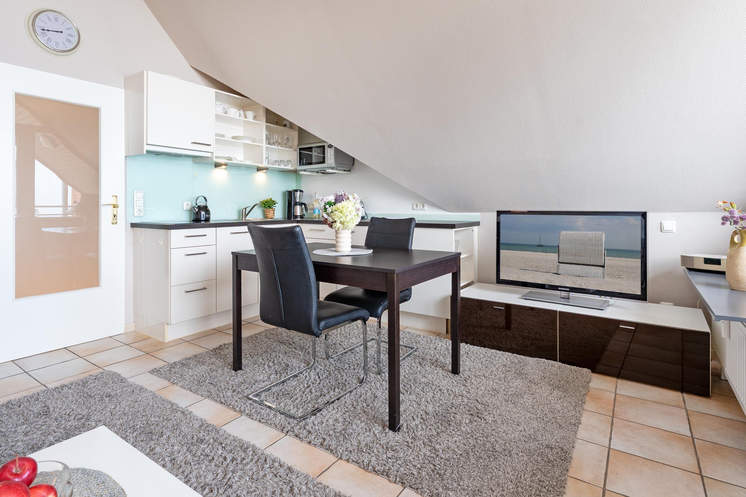 Ihre Ferienwohnung befindet sich im 3. OG der Anlage Strandburg, unmittelbar an der Scharbeutzer Strandpromenade. Über einen kleine Flur gelangen Sie in den offenen Wohn- und Essbereich. Die Küchenzeile ist in den Wohnbereich integriert und hält alle Annehmlichkeiten wie eine Mikro-Back-Kombi, ein 2-Platten-Cerankochfeld und Co. bereit, um nach einem Strandtag die wohlverdiente Mahlzeit zuzubereiten. Die zwei bequemen Relaxsessel sind nicht weit entfernt - von hier aus, oder auch vom lauschigen Ost-Balkon, kann nach dem Essen den Blick über die tiefblaue Ostsee schweifen lassen. Für musikalische Untermalung sorgt ein Bose-Radio. Das Schlafzimmer besticht mit einem bequemen Boxspringbett (180 x 200cm), einem Kleiderschrank und der Möglichkeit, das Zimmer bei Nacht angenehm mithilfe von Plissees abzudunkeln. Der nächste Ostseetag kann im Duschbad mit beheizbarem Handtuchhalter entspannt losgehen.