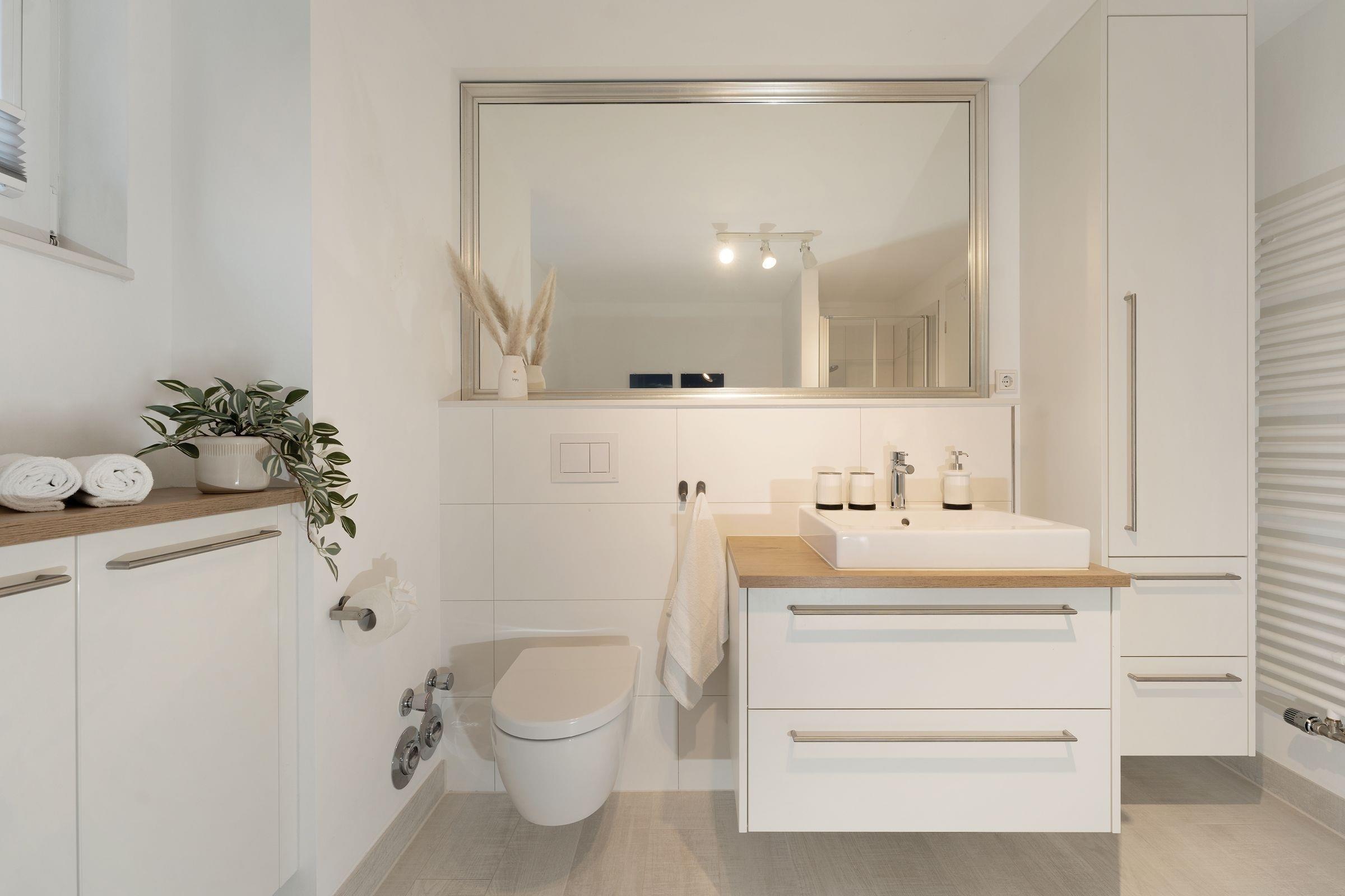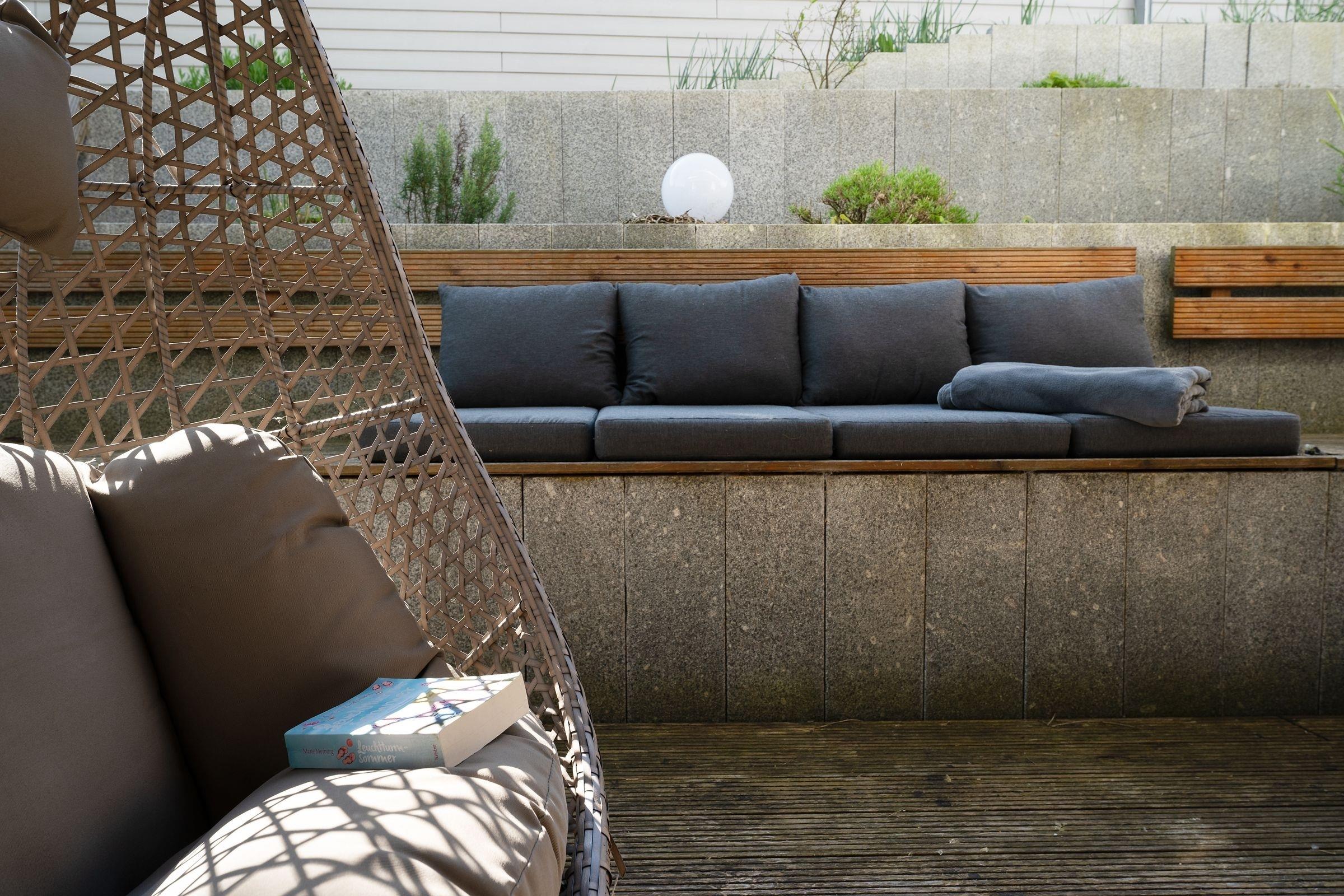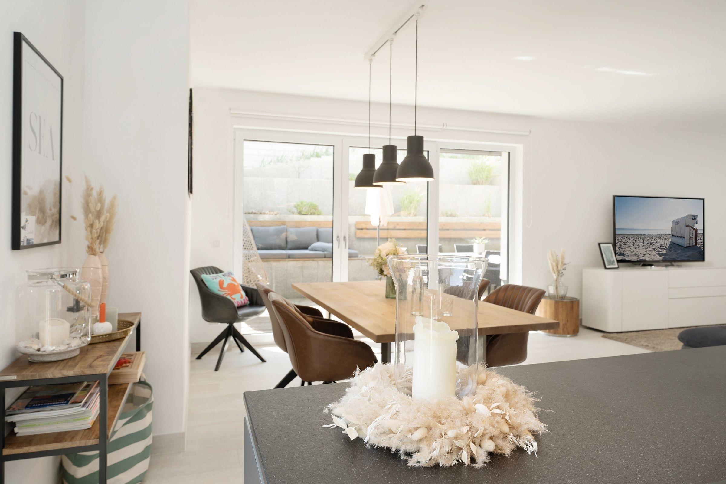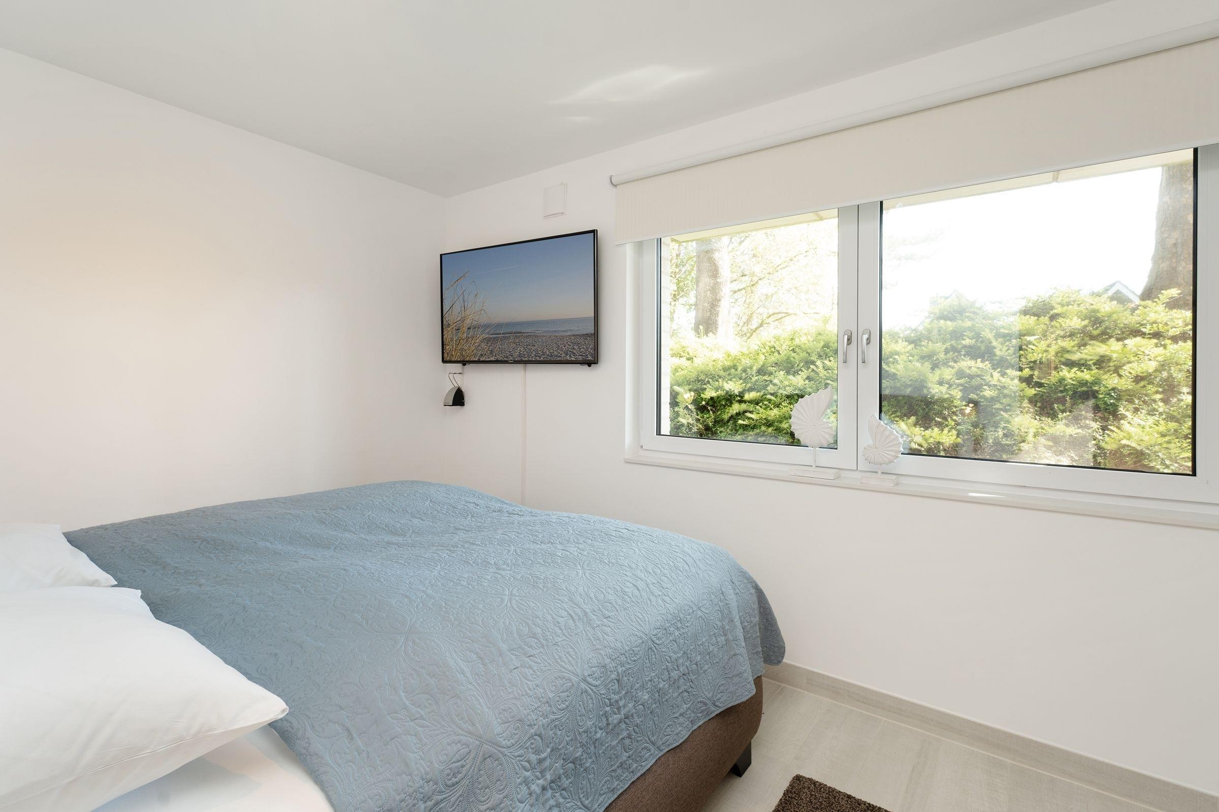 Geschmackvoll, hell und stilsicher eingerichtet präsentiert sich die Ferienwohnung Ostsee Koje 45. Wie wäre es mit einem Drink auf der überdachten Terrasse? Oder machen Sie es sich auf der großzügigen Sofalandschaft vor dem TV gemütlich - und auch die edle Essecke lädt zum Verweilen ein. Die offene Küche mit schickem Küchenblock ist modern ausgestattet und bietet Extras wie Induktionsherd, Espresso-Maschine (Senseo) und Geschirrspüler. Nach einem wundervollen Tag am Strand träumen Sie himmlisch im Boxspring-Doppelbett (200x220 cm) im Schlafzimmer. Hier befindet sich ein weiteres TV-Gerät. Das zweite Schlafzimmer ist mit einem Etagenbett (je 140x200 cm) möbliert. Auch die Couch im Wohnzimmer bietet einen Schlafplatz (136x280 cm). Das komfortable, tageslichthelle Bad punktet mit bodengleicher Dusche, Fußbodenheizung und Handtuchwärmer. Dazu gibt es ein Gäste-WC. Ein Kinderhochstuhl steht für die kleinen Gäste bereit.