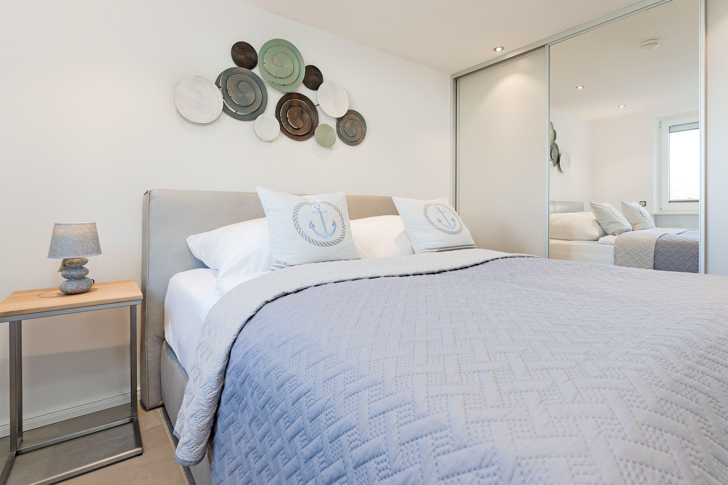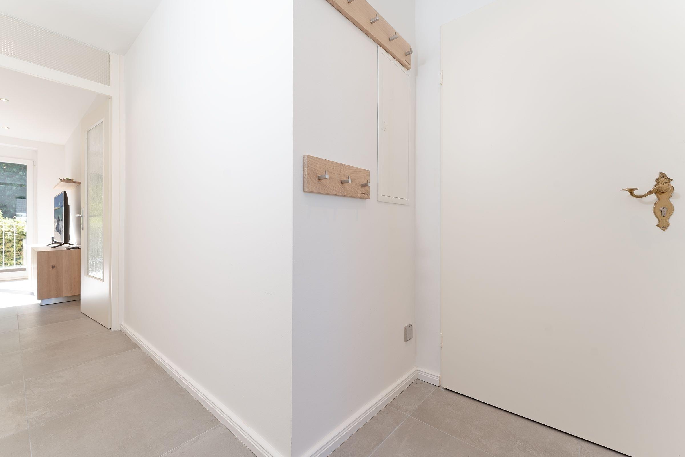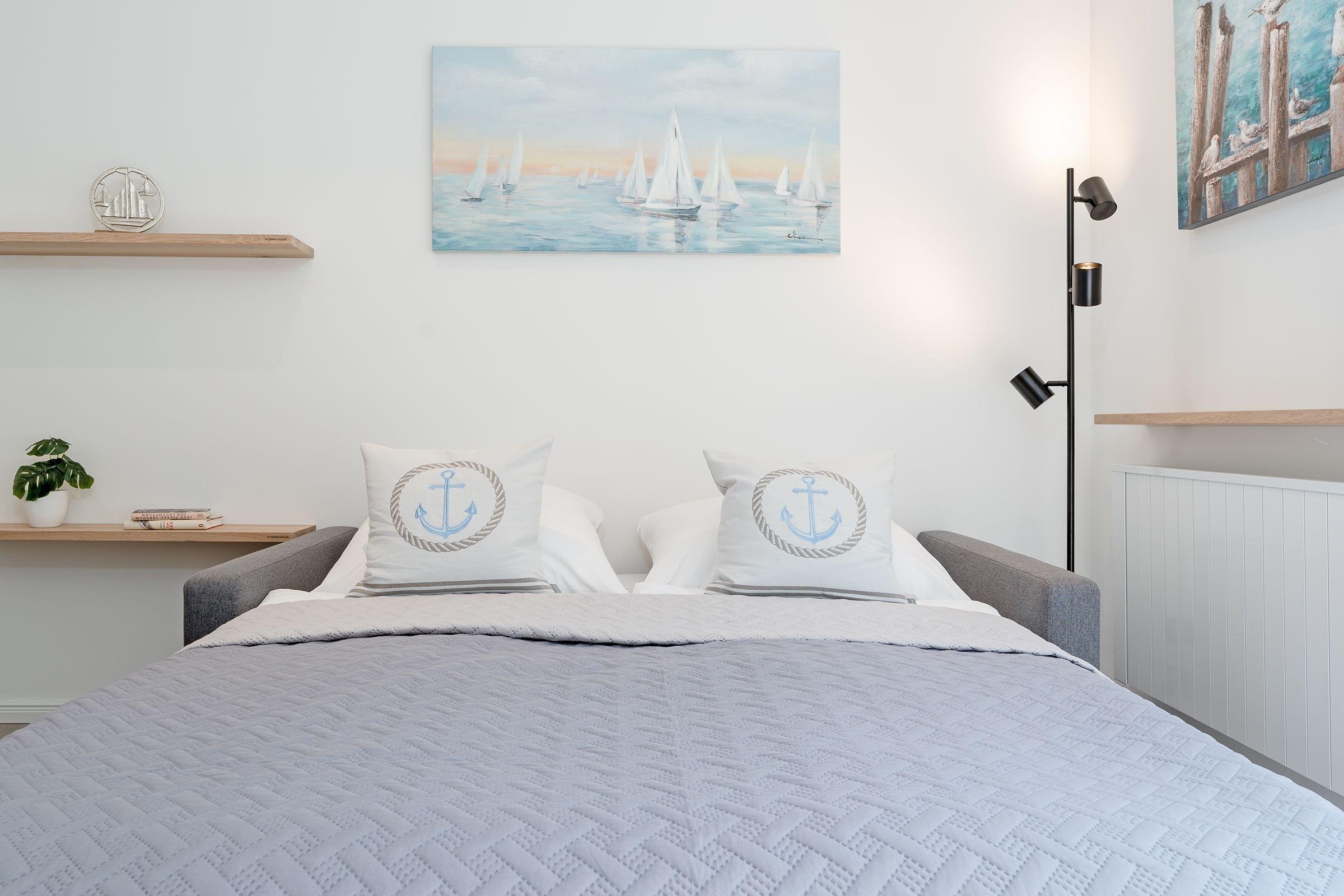 Der moderne und hochwertige Einrichtungsstil zieht sich durch die gesamte Wohnung. Die Küche besticht durch ihre erstklassige Ausstattung inklusive Induktionskochfeld, Backofen (Miele), Spülmaschine, Kaffeefiltermaschine und Kühlschrank mit integriertem Gefrierfach. Der angeschlossene Wohn- und Essbereich bietet Platz für gemütliche Stunden mit Freunden und Familie. Auf dem Smart-TV können Sie sich bequem bei einem Streamingdienst Ihrer Wahl einloggen und nahtlos Ihre Lieblingsfilme und -serien von Zuhause weitergucken. Das Sofa im Wohnbereich kann mit wenigen Handgriffen zu einer Schlafmöglichkeit (ca. 140x200 cm) für zwei Personen umgebaut werden. In einem separaten Schlafzimmer finden zudem zwei weitere Personen in einem gemütlichen Boxspringbett (140x200 cm) Platz. Das Schlafzimmer wird ergänzt durch einen großen Kleiderschrank. Die Erholung, die diese Ferienwohnung verspricht, wird abgerundet von einem modern gestalteten Bad mit bodengleicher Dusche, Fußboden- und Handtuchheizung.