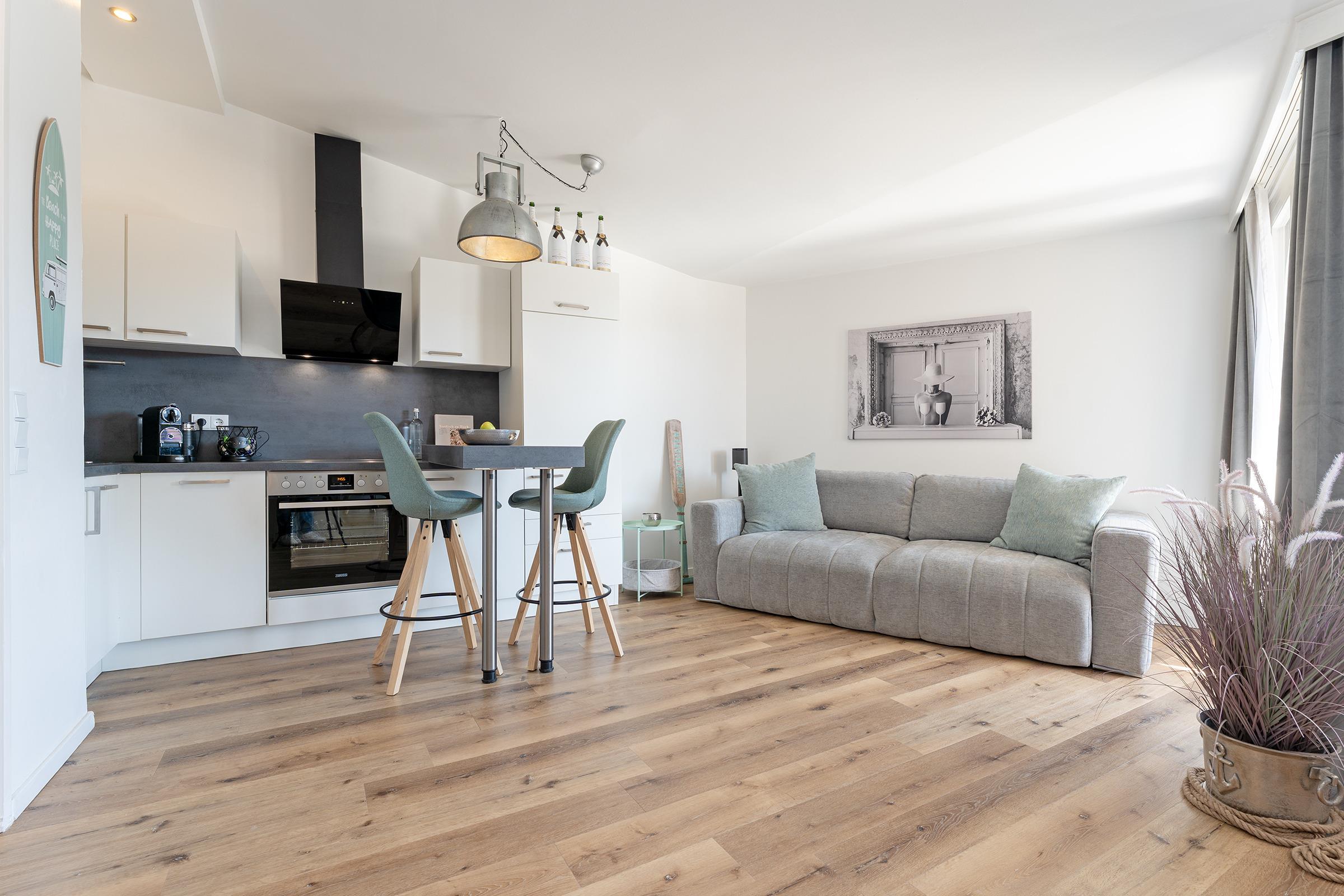 Diese stilvolle Ferienwohnung in Scharbeutz bietet modernen Komfort in bester Lage. Der helle Wohnbereich verfügt über eine gemütliche Sofaecke und einen Fernseher für entspannte Abende. Große Fenster sorgen für viel Tageslicht und eine angenehme Atmosphäre. Vom Wohnzimmer aus gelangen Sie auf den überdachten Balkon mit Gartenmöbeln, ideal für ein Frühstück an der klaren Meeresluft.