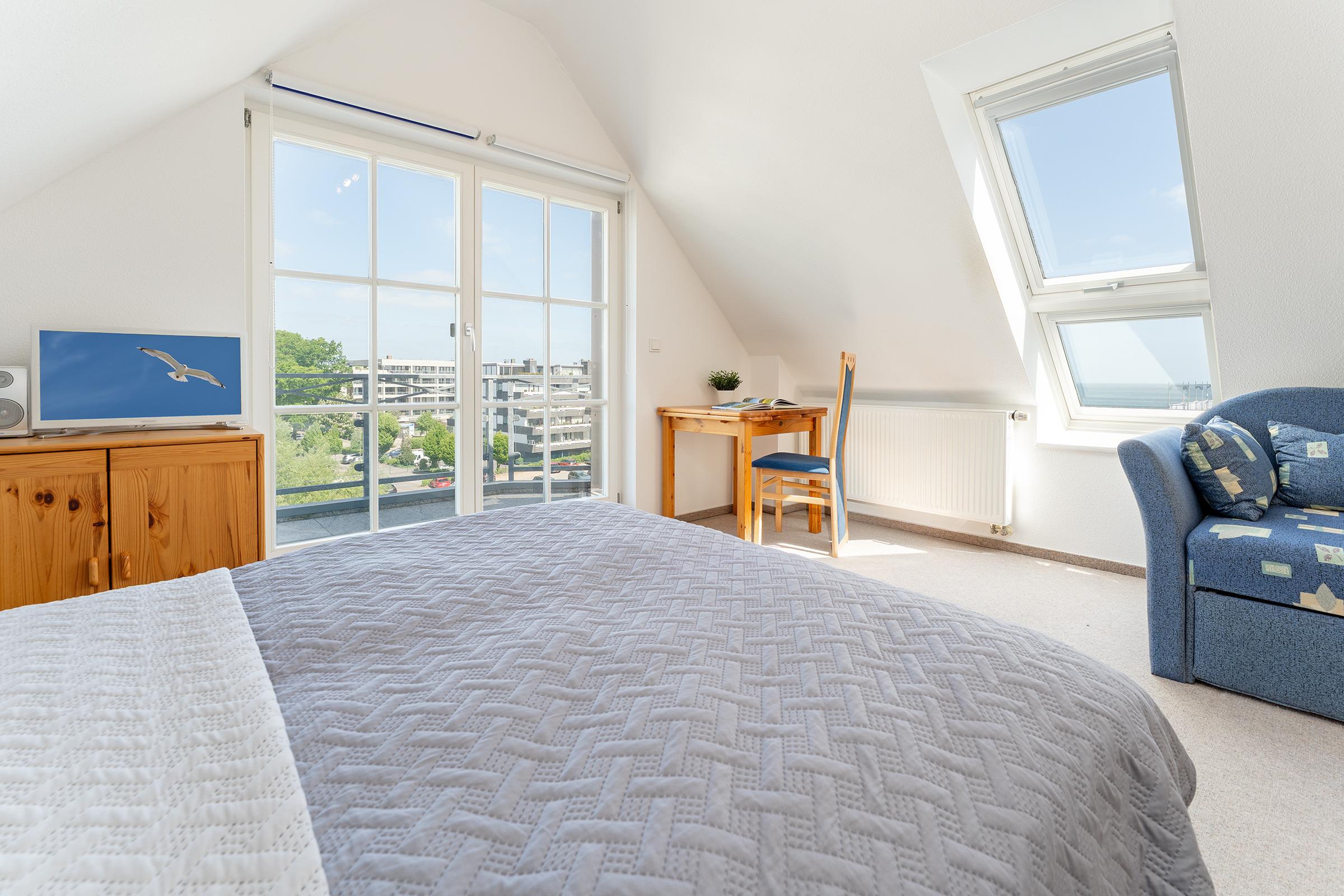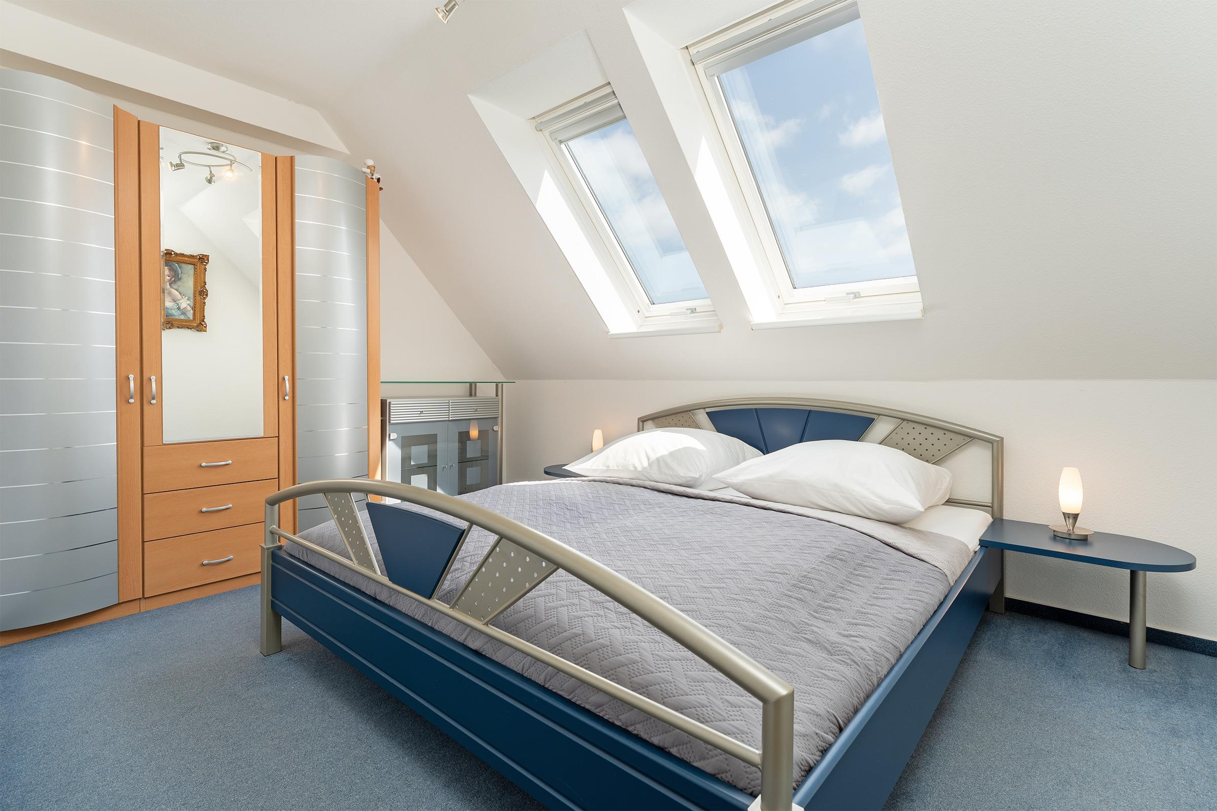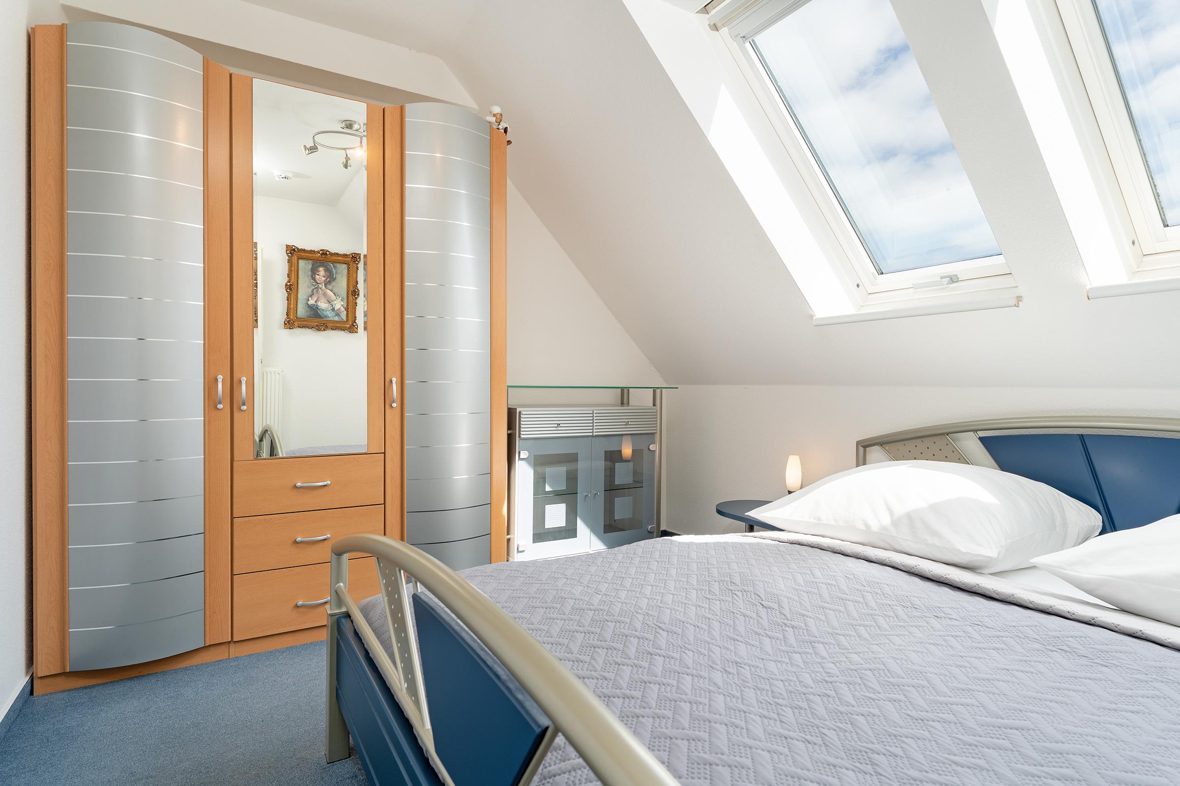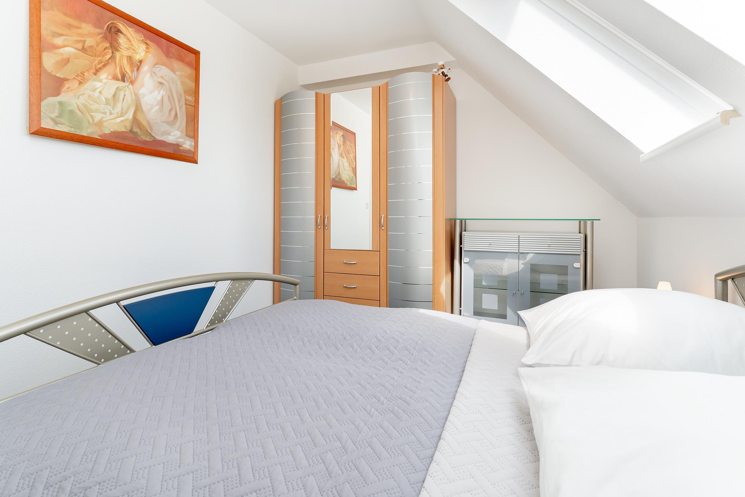 Schlafzimmer 1 (3. OG): 1 Doppelbett (140x200 cm), Kleiderschrank, TV, Verdunkelung: Rollo, kein Platz für ein Babybett vorhanden