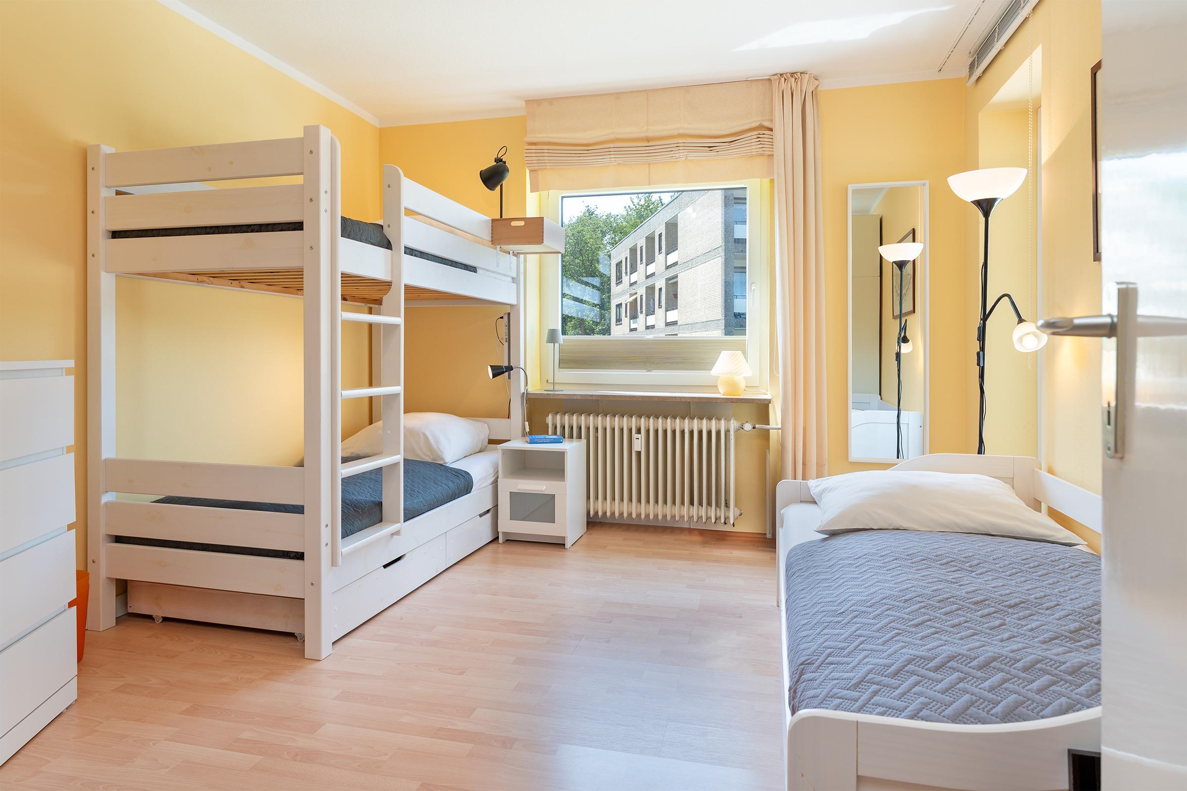 Schlafzimmer: 1 Einzelbett (90x200cm) + 1 Etagenbett (je 90x200 cm), 2 Kleiderschränke, Verdunkelung: Plissees, Platz für ein Babybett vorhanden