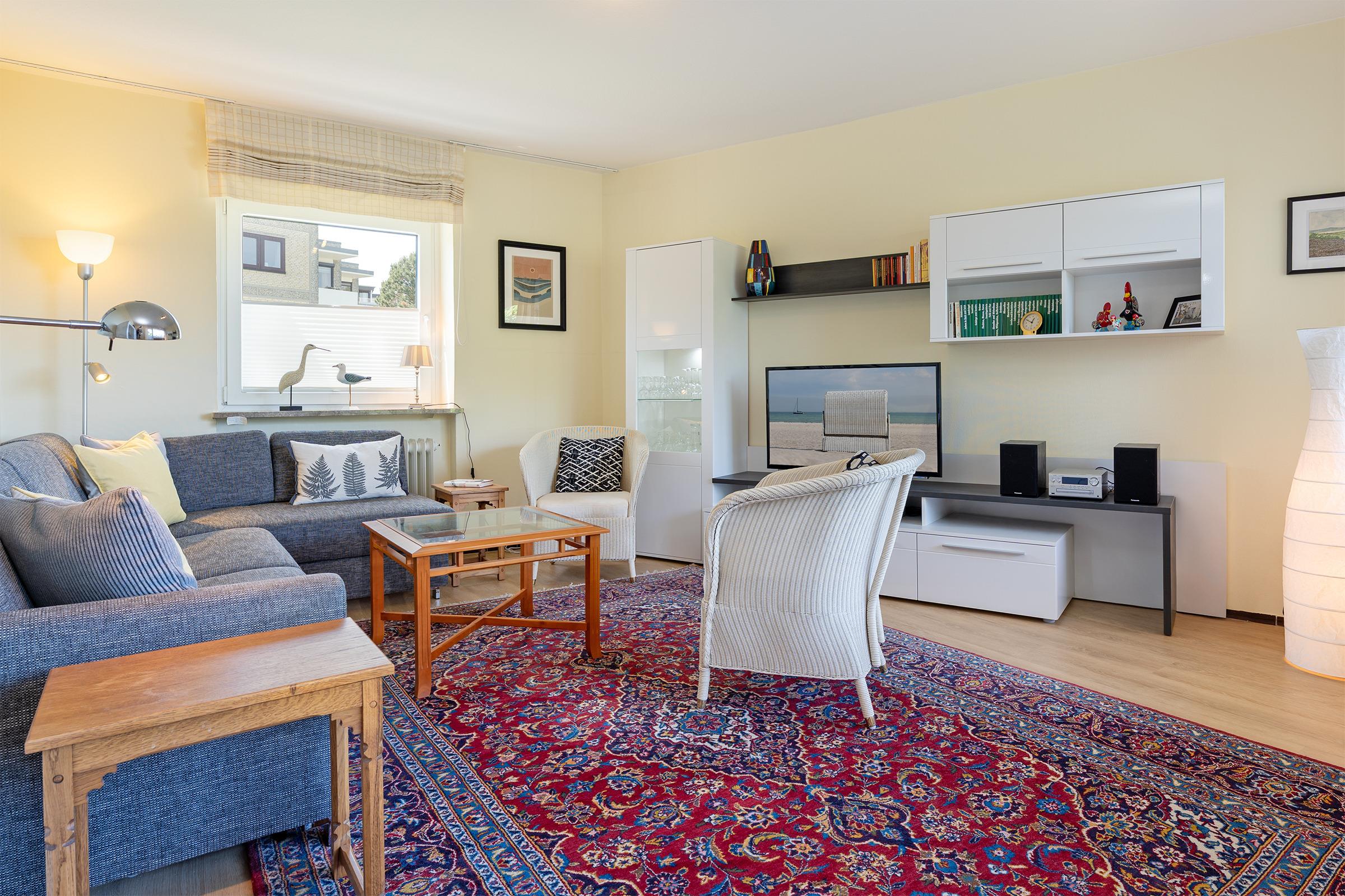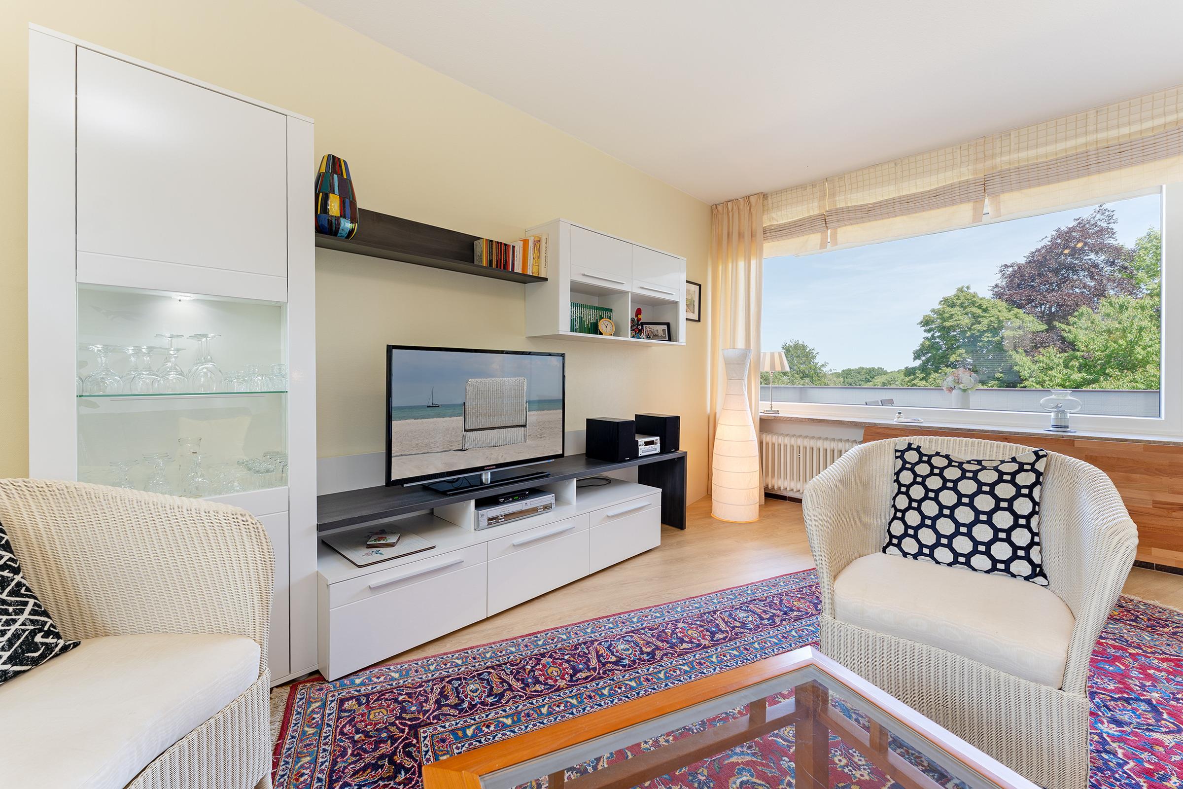 Der helle Wohnbereich mit gemütlichem Schlafsofa (180×200?cm), Kleiderschrank und TV schafft eine behagliche Umgebung für gemeinsame Stunden. In der separaten, voll ausgestatteten Küche bereiten Sie im Handumdrehen Lieblingsgerichte für die ganze Familie zu – der angrenzende Essbereich in der Diele lädt dabei zum Genießen und Zusammensein ein. Zwei möblierte Balkone, darunter ein sonniger Südbalkon, eröffnen Raum für entspannte Stunden an der frischen Meeresluft.