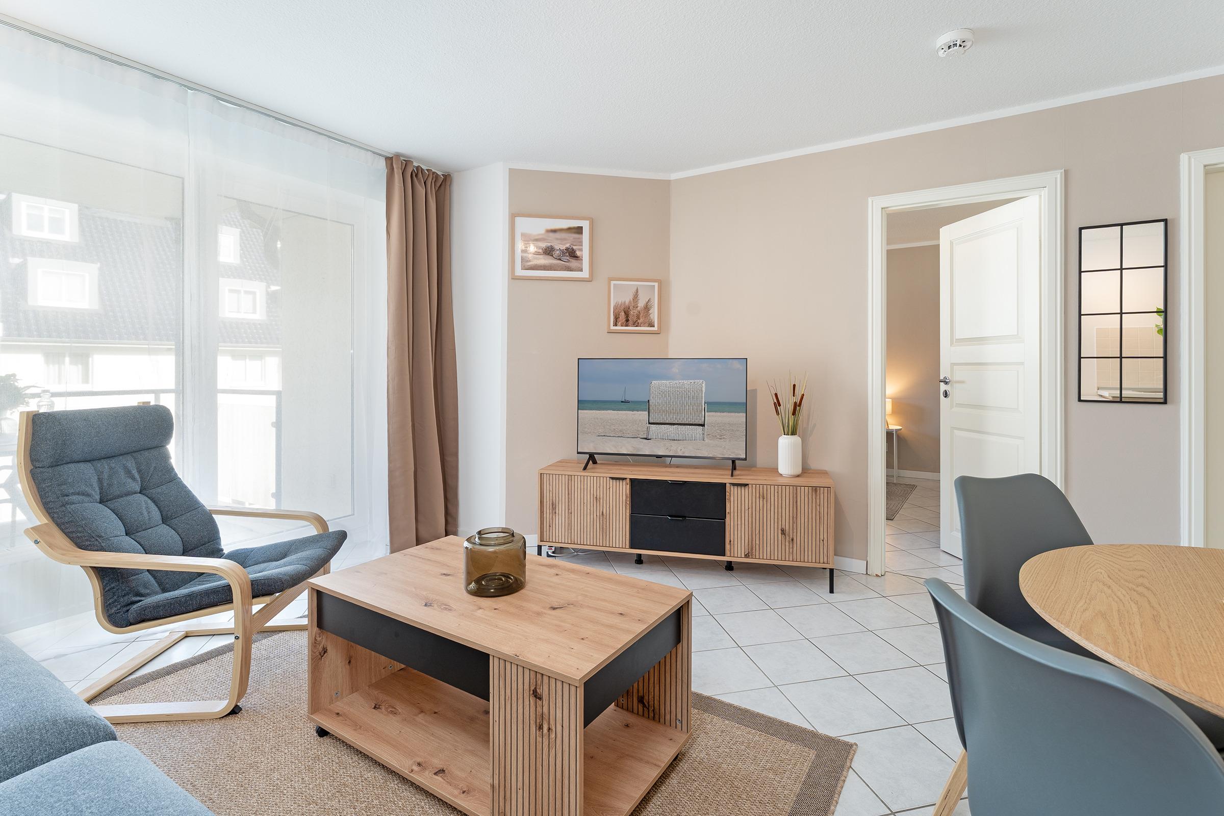 Ein helles und behaglich ausgestattetes Appartement erwartet Sie hier in der 2. Etage. Hier finden Sie ausreichend Platz für bis zu 2 Erwachsene und 1 Kind. Im Wohnraum befindet sich ein ausziehbares Schlafsofa, ein Smart-TV mit Streaming-Diensten zur Selbstanmeldung, eine komplette Einbauküche inklusive Nespresso-Kapselmaschine sowie Geschirrspüler und ein Essbereich. Ein separates Schlafzimmer mit einem Doppelbett (180x200 cm, 2 Matratzen) schließt sich an. Des weiteren verfügt die Wohnung über ein Duschbad/WC mit Haartrockner und einen Balkon. Der WLAN-Anschluss ist für Sie inklusive.