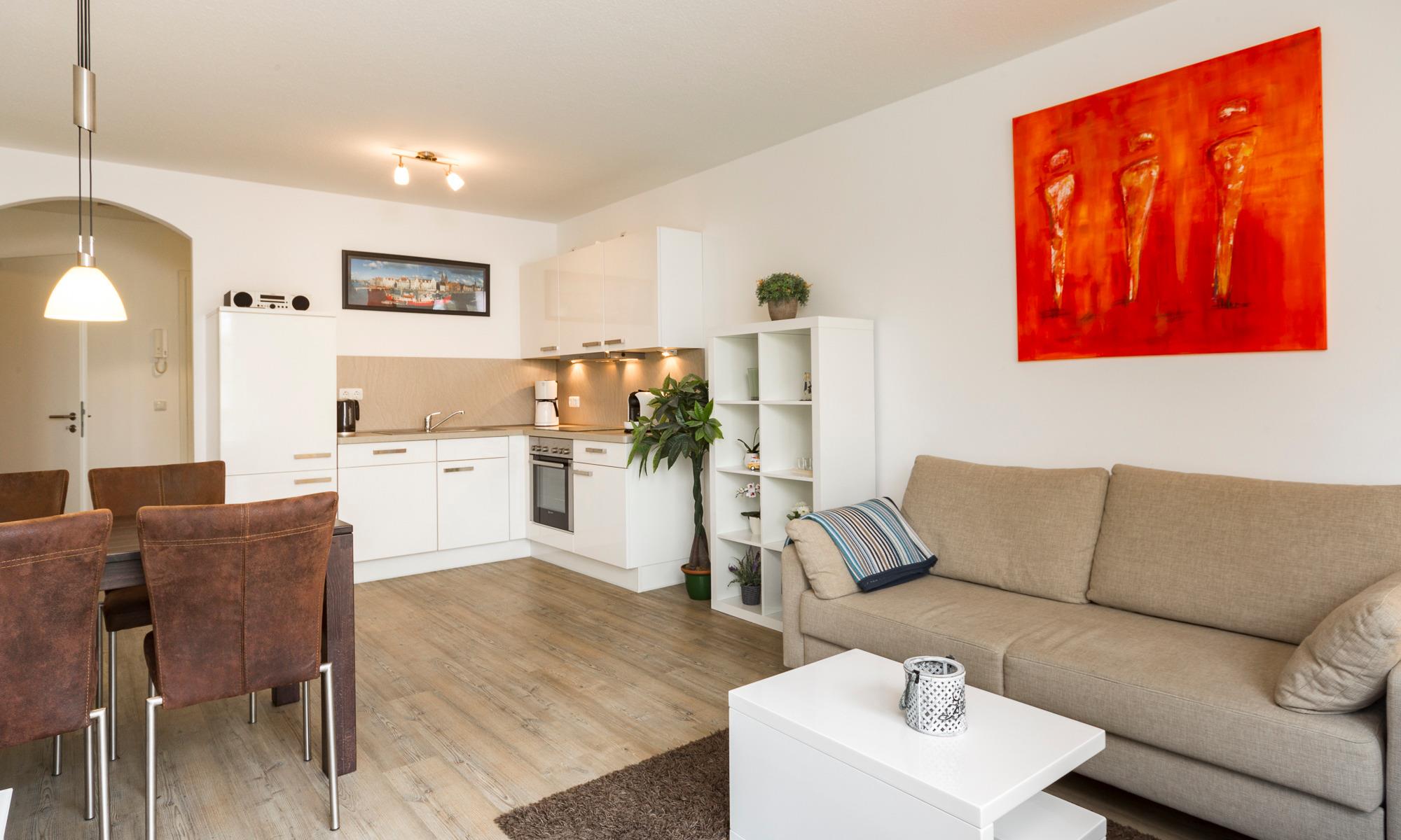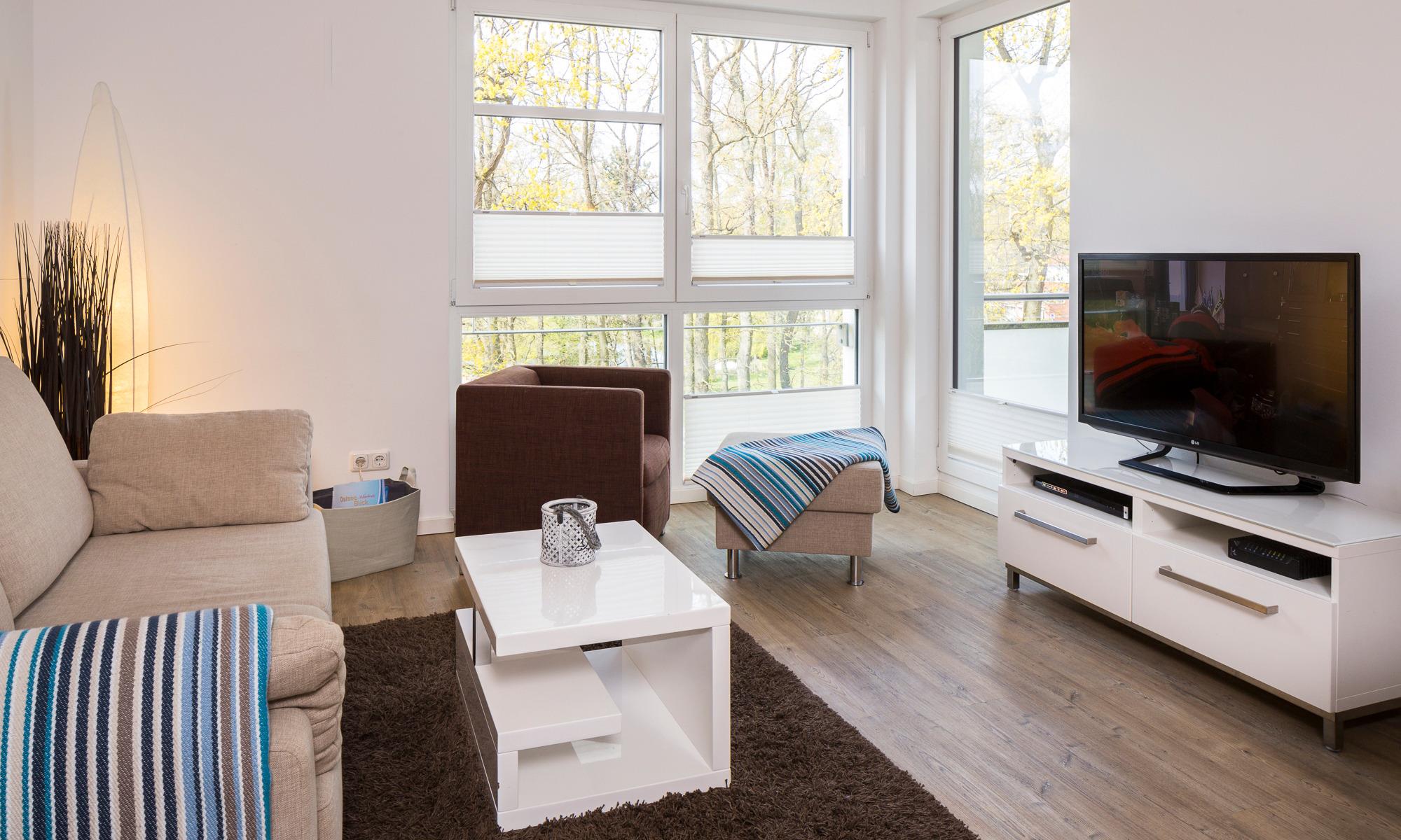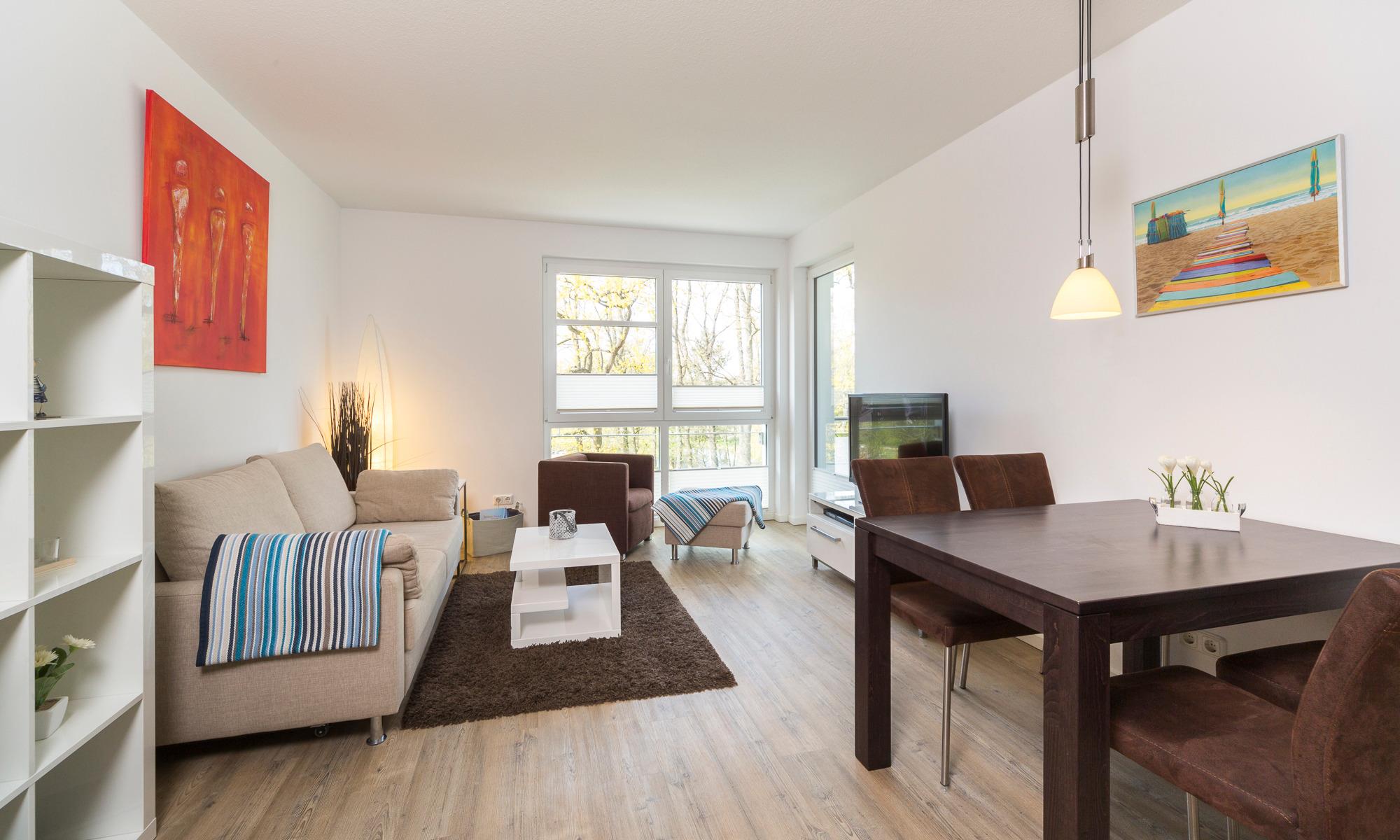 Der Wohn-Essbereich mit bodentiefen Fenstern ist mit einem Esstisch und einer gemütlichen Couch ausgestattet. Mit nur wenigen Handgriffen lässt sich diese in eine Schlafcouch verwandeln. Neben einem Smart-TV und DAB-Radio steht Ihnen selbstverständlich kostenloses WLAN zur Verfügung. Der überdachte Balkon mit Blick in den Kurpark ist mit einem Tisch und Stühlen ausgestattet. Die moderne Küche lässt keine Wünsche offen. Im Schlafzimmer befinden sich ein bequemes Doppelbett (1,80 x 2,00m, Einzelmatratzen) sowie ein geräumiger Kleiderschrank. Das Badezimmer verfügt über eine bodentiefe Dusche. Neben der Fußbodenheizung ist hier ein zusätzlicher Handtuchheizkörper angebracht.