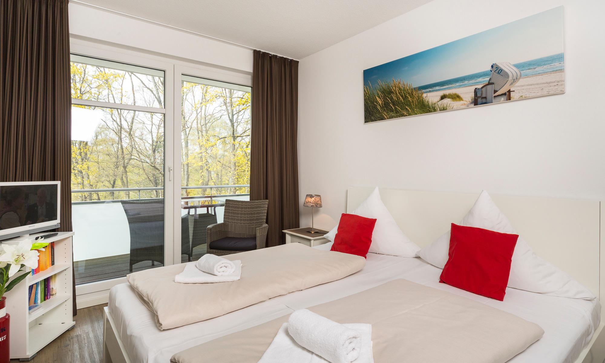 2-Zimmer-Ferienwohnung, ca. 50 m², mit Balkon, Duschbad, PKW-Stellplatz und Fahrstuhl, für 2 Personen, mit seitlichem Meerblick.