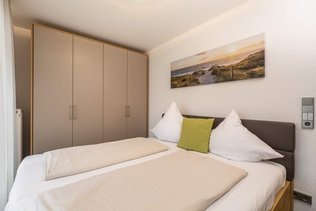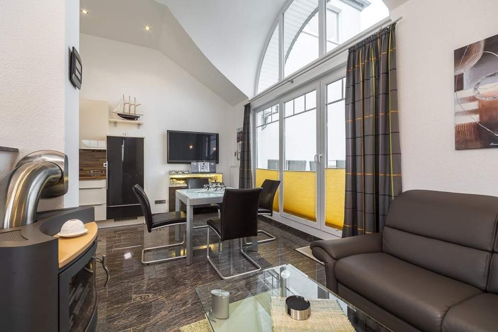 3-Zimmer-Ferienwohnung, ca. 70 m², über 2 Ebenen mit 2 Schlafzimmern, 2 Dachterrassen, Teilmeerblick, Duschbad und einem Tiefgaragenstellplatz (Durchfahrtshöhe 2,08 m), Fahrstuhl, für bis zu 4 Personen.