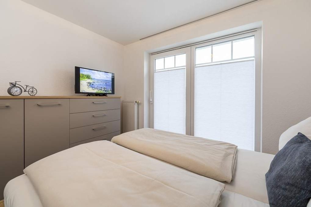Im unteren Bereich dieser Ferienwohnung befinden sich beide Schlafzimmer, welche mit bequemen Doppelbetten und geräumigen Kleiderschränken ausgestattet sind. Ein Schlafzimmer verfügt zusätzlich über einen Flachbildfernseher. Beide Schlafzimmer können verdunkelt werden und verfügen über einen Terrassenausgang. Das schöne Badezimmer verfügt über eine bodentiefe Dusche und einen großen Spiegelschrank. Neben der Fußbodenheizung ist hier ein zusätzlicher Handtuchheizkörper angebracht. Über eine Treppe gelangen Sie in den Wohn-Essbereich mit einer komplett ausgestatteten Küche und einer großzügigen Terrasse. Ausgestattet ist diese mit Stühlen, Tisch, Liegen und Sonnenschutz. Hier kann man entspannen und den Urlaub genießen. Der Wohnbereich verfügt über ein gemütliches Ecksofa. Neben einem Flachbildfernseher und einem CD-Player steht Ihnen selbstverständlich kostenloses WLAN zur Verfügung. Der Esstisch bietet Ihnen ausreichend Platz für gesellige Stunden.