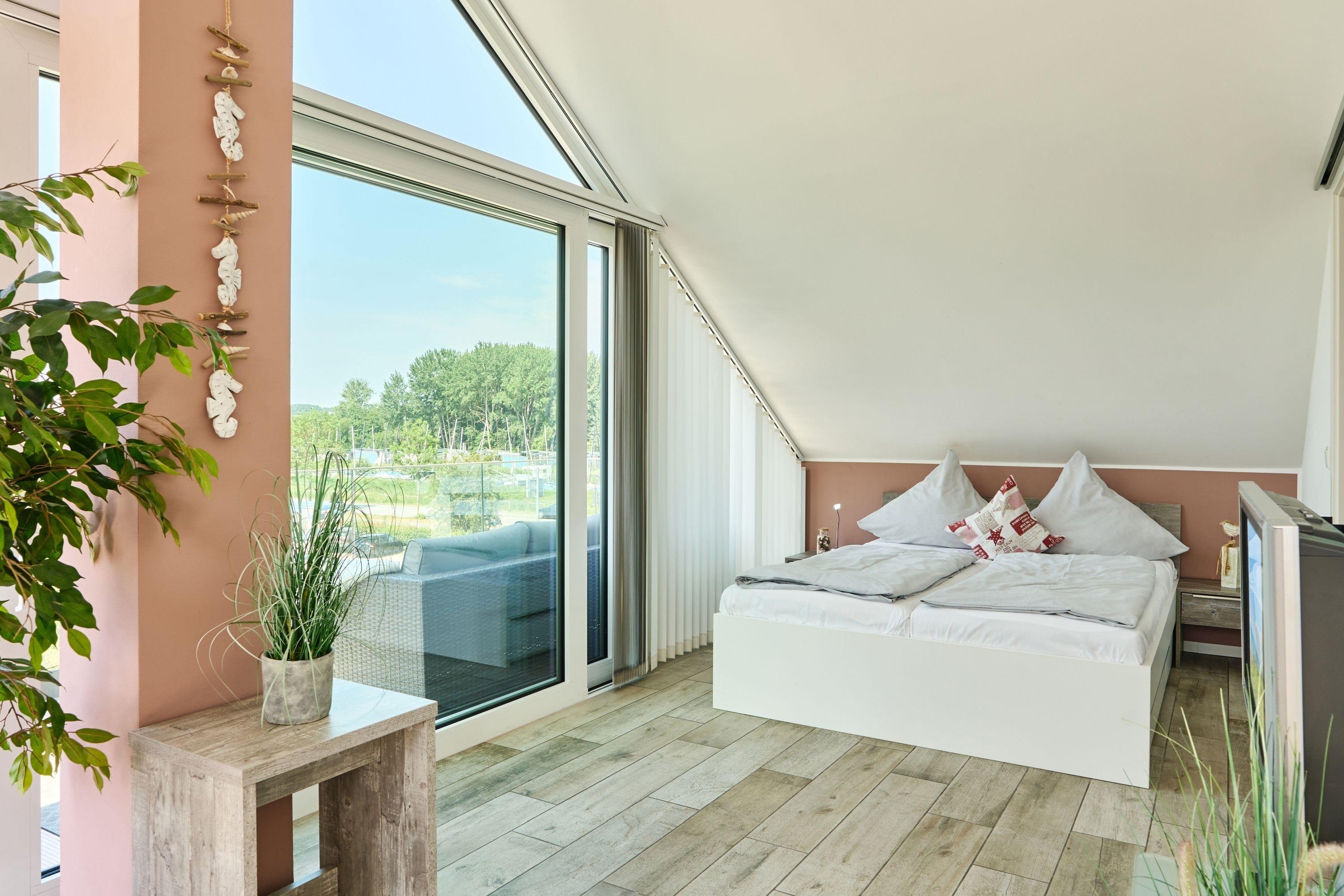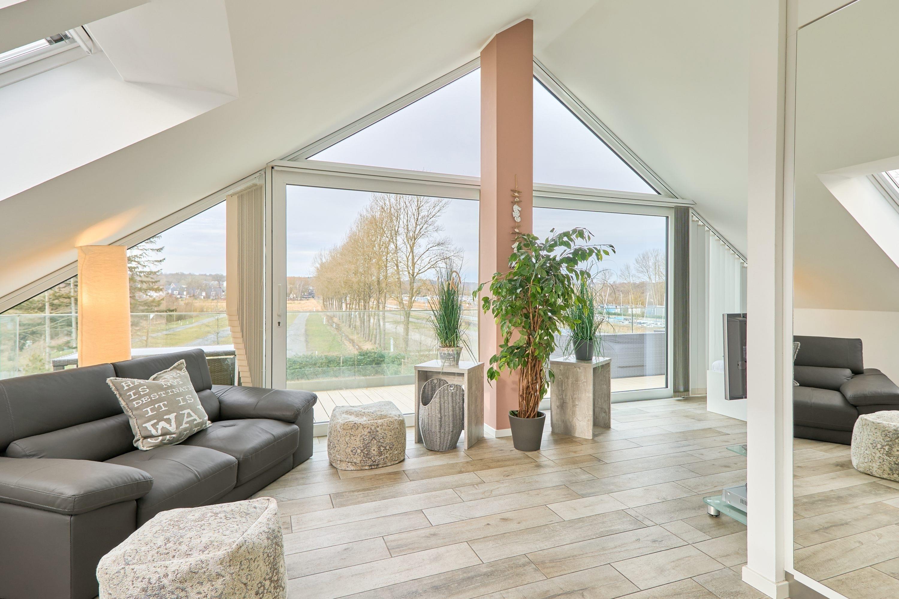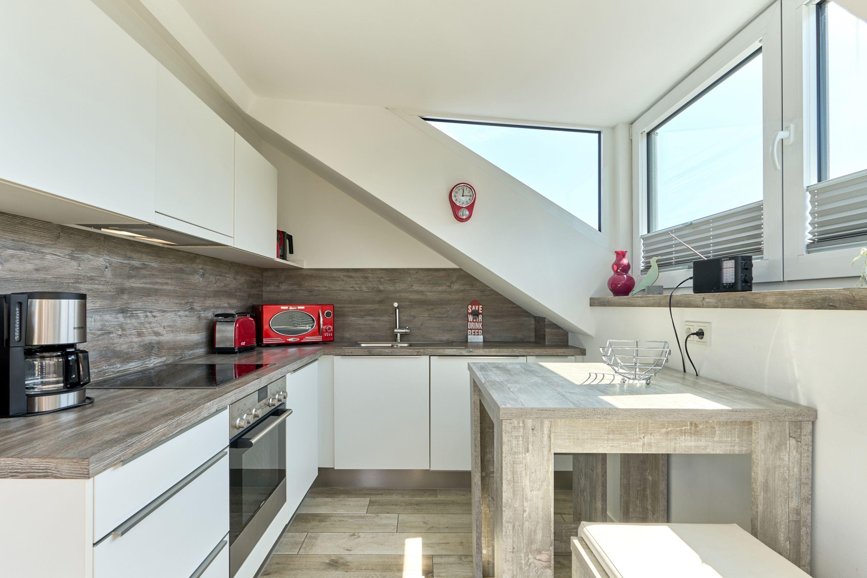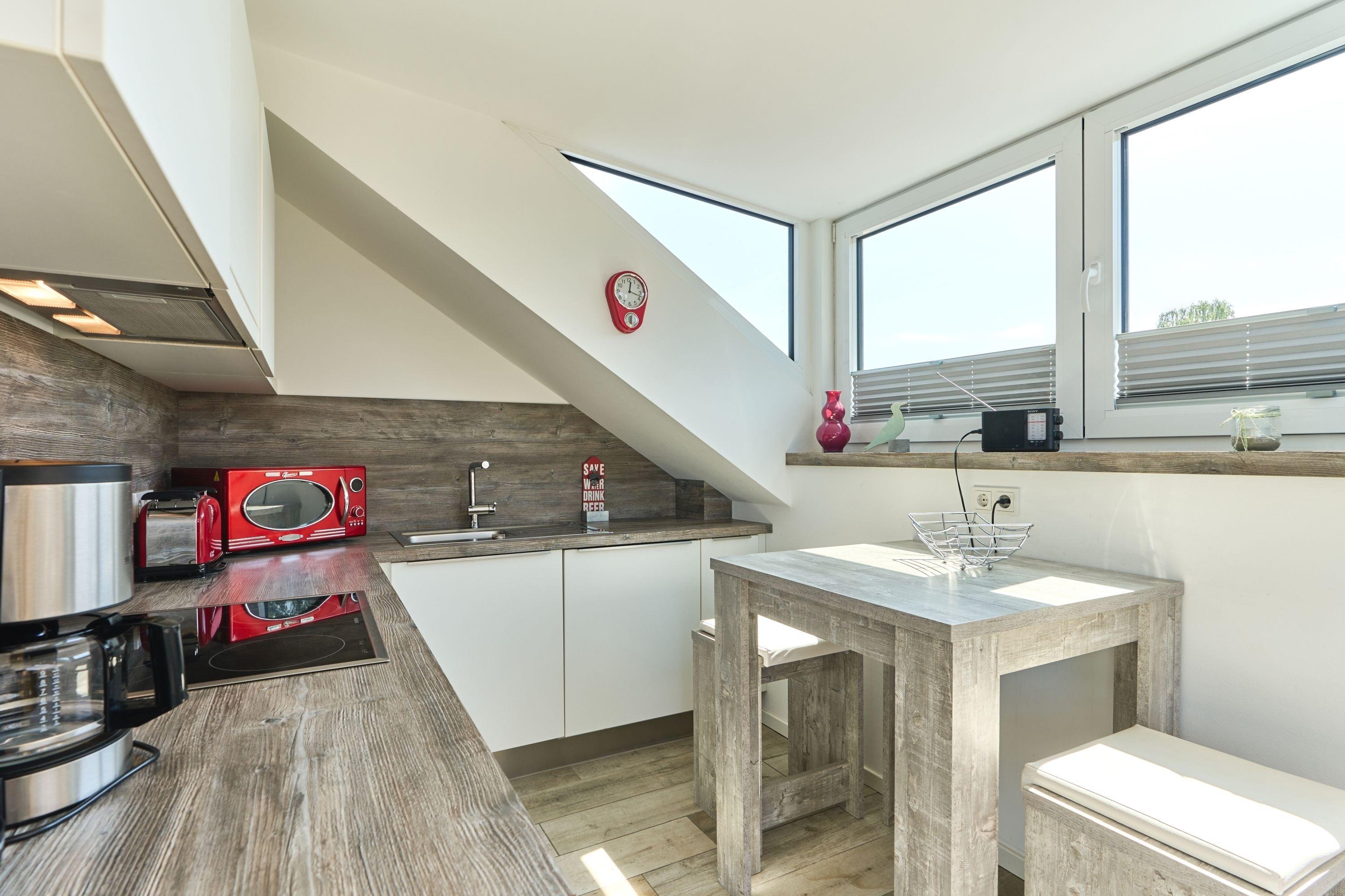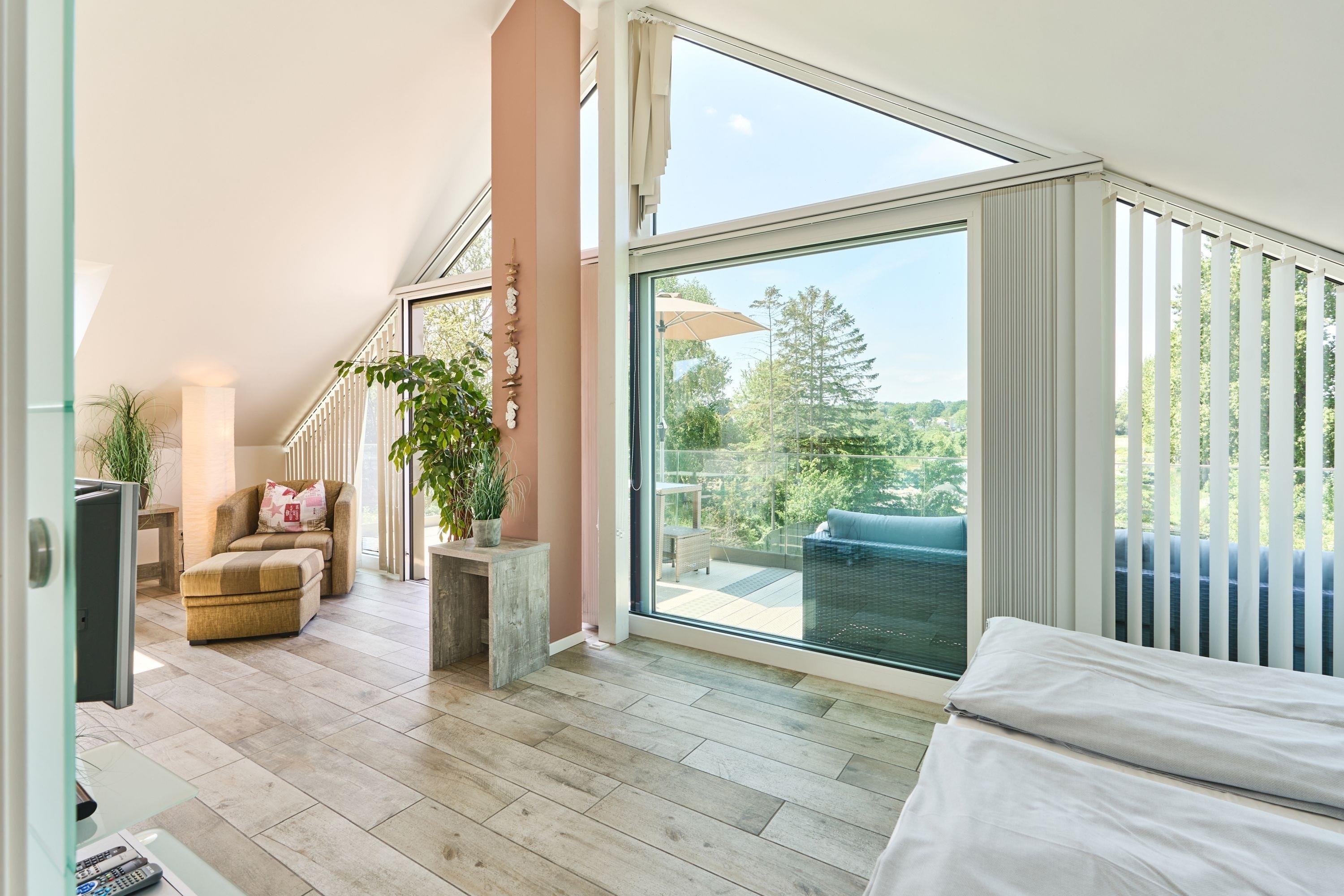 Es erwartet Sie schon beim Betreten der Wohnung ein weiter Blick in die Ferne. Diese Traumwohnung ist durch die bodentiefen Fenster absolut hell und lichtdurchflutet, selbstverständlich ist bei Bedarf ein Sichtschutz vorhanden. Der lichtdurchflutete Raum bietet Ihnen einen Essbereich mit Küchenzeile, einen gemütlichen Wohnbereich sowie einen Schlafbereich mit einem Doppelbett (1,60 x 2,00 m, Einzelmatratzen). Die Küche ist komplett ausgestattet und lässt keine Wünsche offen. Neben einem Flach-TV steht Ihnen selbstverständlich kostenloses WLAN zur Verfügung. Das Tageslicht-Bad verfügt über eine bodentiefe Dusche und einen Handtuchheizkörper sowie Fußbodenheizung.