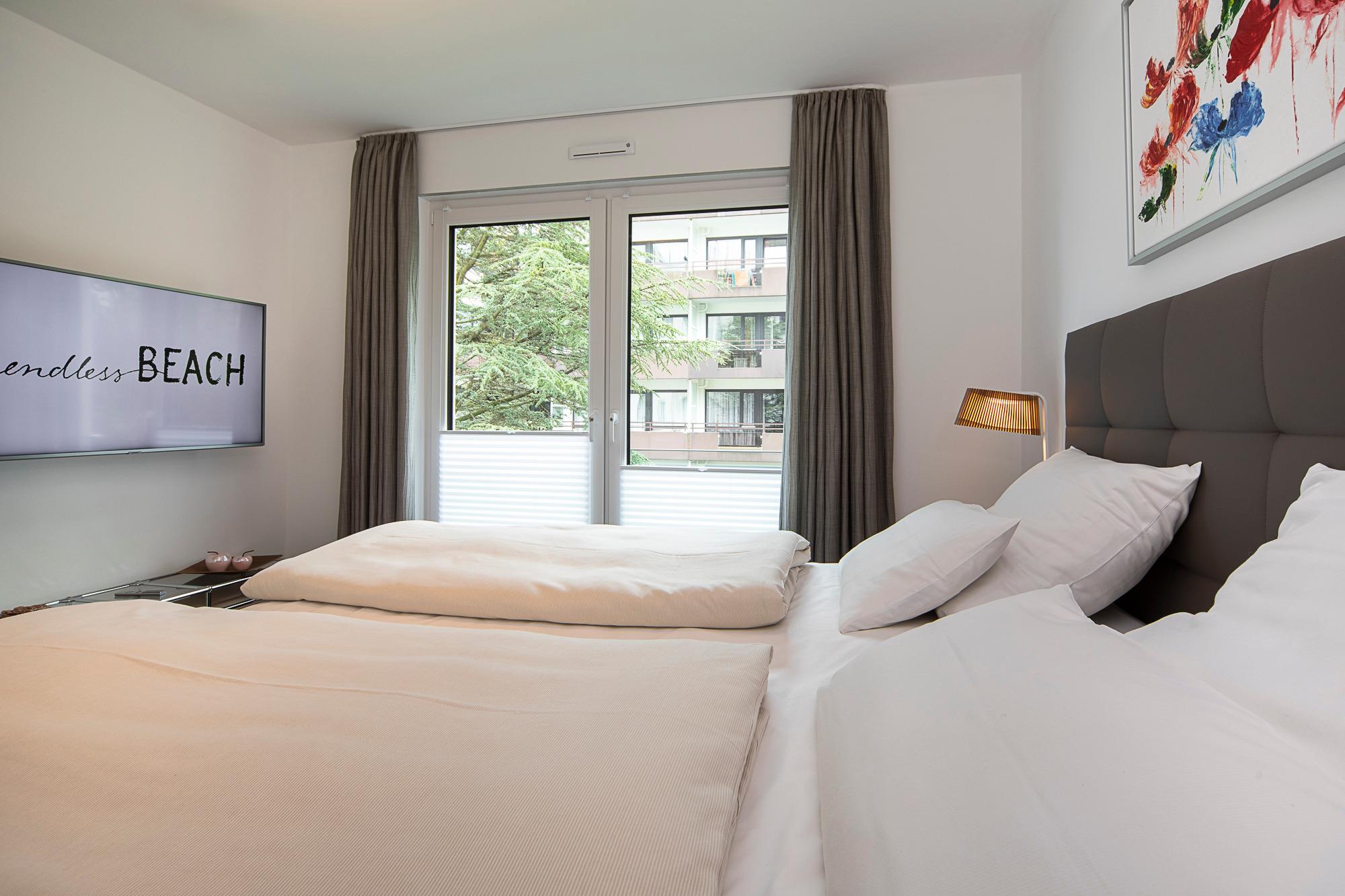 1. Schlafzimmer: Für Ihren erholsamen Schlaf erwartet Sie hier ein hochwertiges Boxspringbett (180 x 200). Ihre Kleidung findet in dem geräumigen Schiebetüren-Kleiderschrank mit Spiegel sowie im USM-TV-Board ausreichend Platz. Selbstverständlich steht Ihnen auch im Schlafzimmer ein Samsung[nbsp] 49?-Smart-TV mit LAN-Anschluss zur Verfügung.