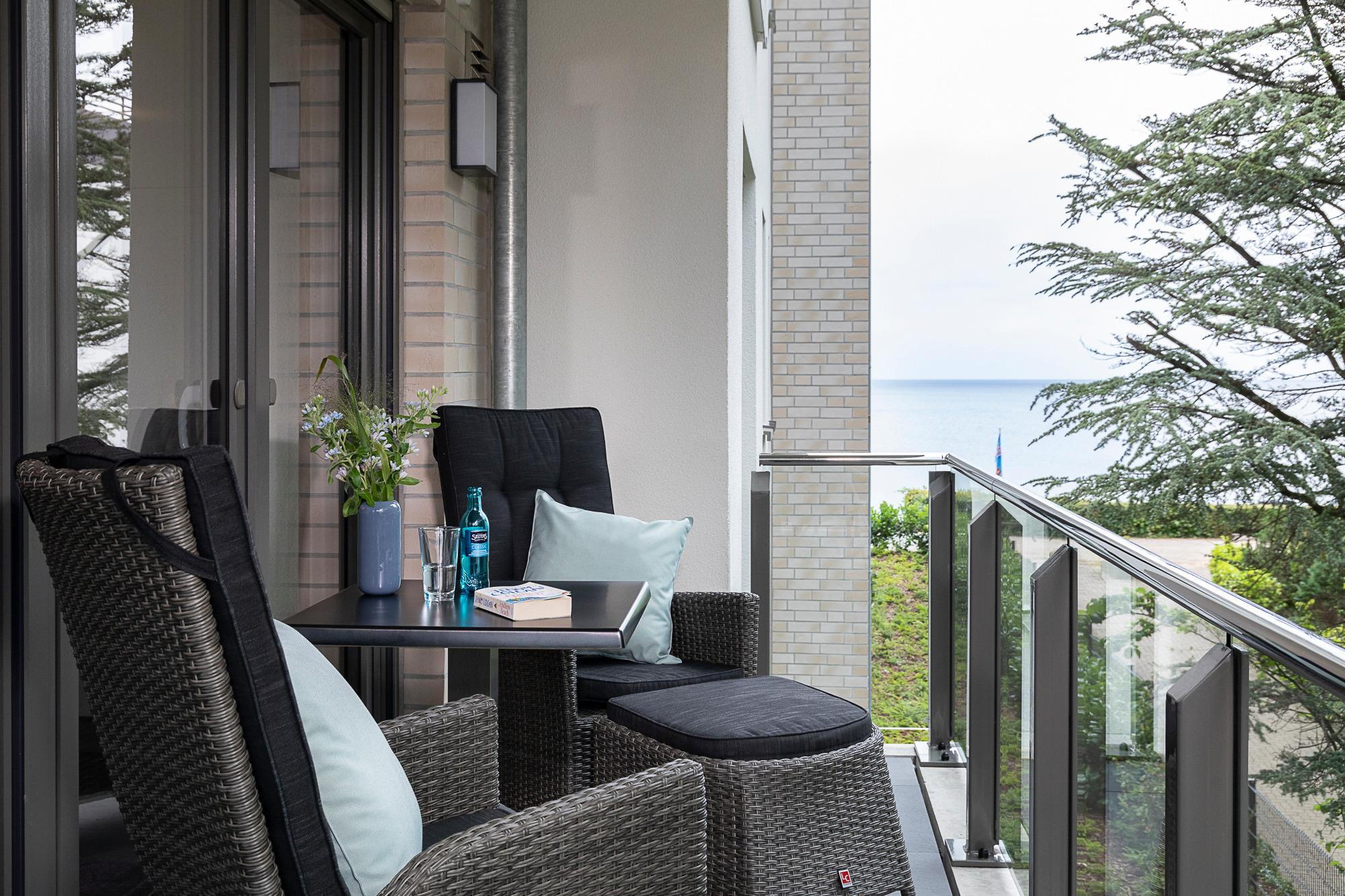 3-Zimmer-Ferienwohnung, ca. 81m², mit großem Süd-West-Balkon und Teilmeerblick, exklusiven Designer-Möbeln, Wellnessbad mit Whirlpool und Dusche, Kfz-Carportstellplatz, maximale Höhe 2,20 m.