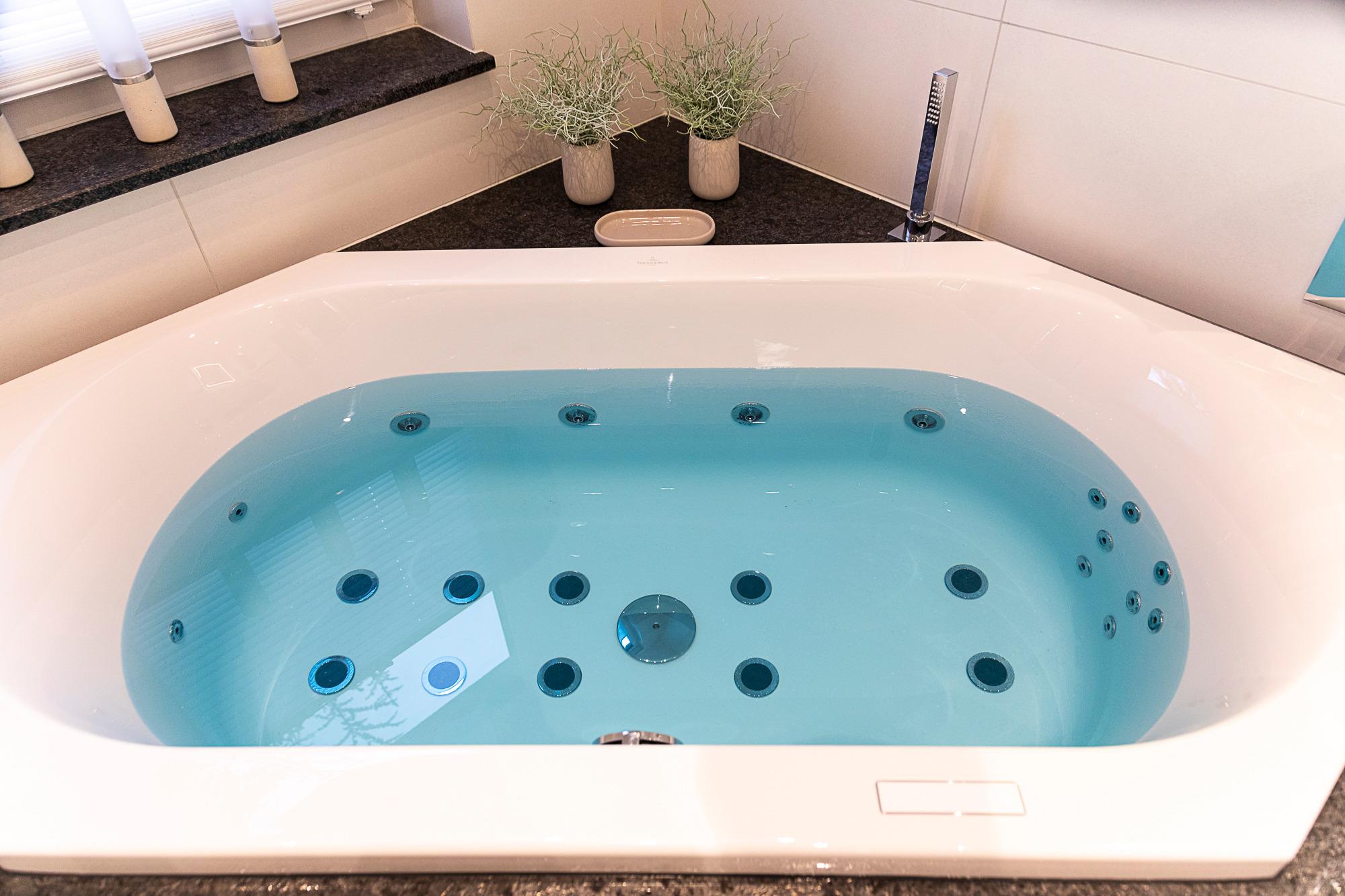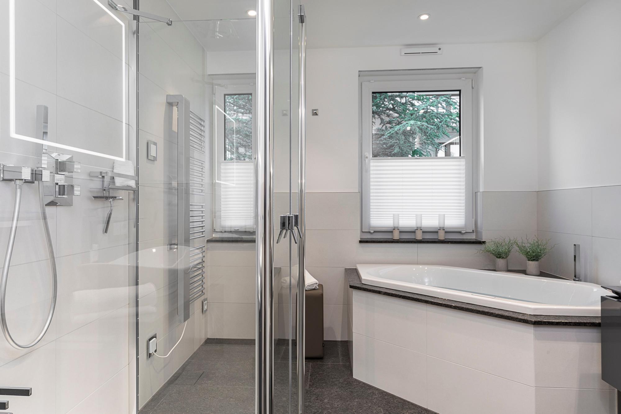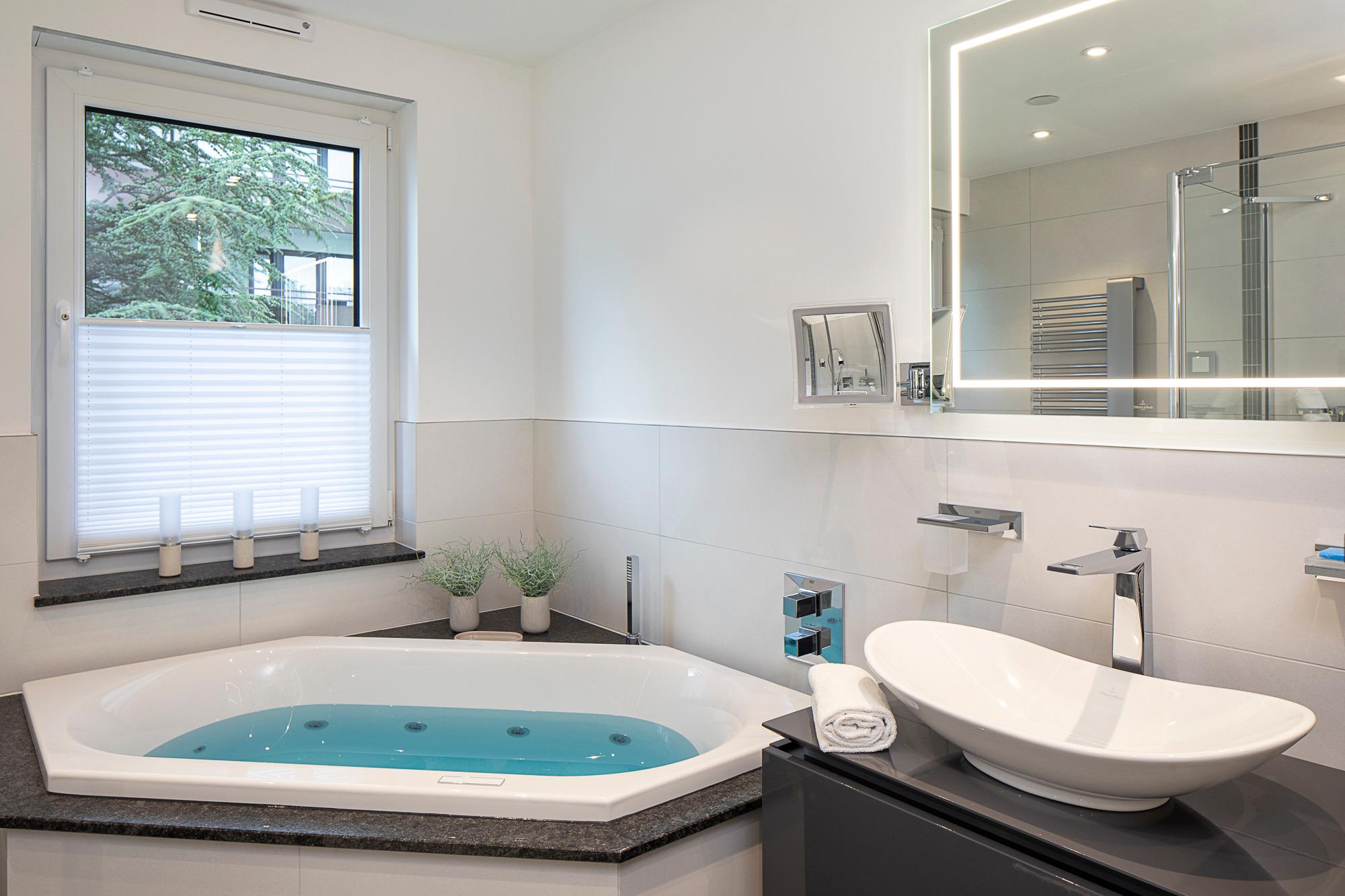 Wellnessbad: In Ihrem mit viel Liebe von Villeroy [&] Boch gestalteten Wohlfühlbad mit Fenstern lädt Sie eine bodengleiche Regendusche und ein Whirlpool zum Entspannen ein. 2 Waschtische, WLAN-Radio, Handtuchheizkörper, Kosmetikspiegel und Haartrockner runden das Wohlfühlpaket ab.