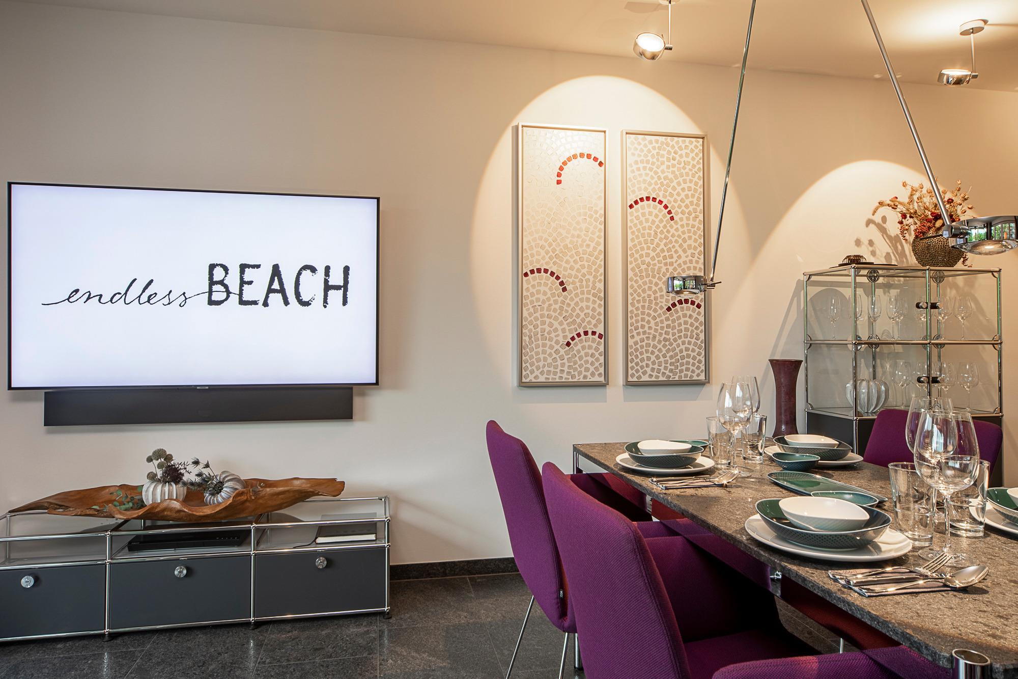 Freuen Sie sich auf eine exklusive Design-Ferienwohnung mit einer besonderen Wohlfühlatmosphäre. Das abgestimmte Wohnraumkonzept von COR, USM, VITRA und JAB wird mit einem Wellnessbereich von Villeroy [&] Boch abgerundet. Das warme Lichtkonzept des Hauses Prediger setzt die originalen Acrylgemälde und weitere geschmackvolle, naturbelassene Dekorationen ins richtige Licht und schafft eine stimmungsvolle Atmosphäre. Wohn-Ess-Bereich: Genießen Sie Ihr Frühstück oder andere kulinarische Höhepunkte in der hochwertigen Warendorf-Küche mit Miele-Einbaugeräten, einer Nespresso-Maschine sowie stylischem Rosenthal-Porzellan. Es erwarten Sie Design-Klassiker von USM Haller (Esstisch, Vitrine und TV-Board) und COR (Ledersofa, Lounge-Chair, Esstisch-Stühle mit bequemer Polsterung und Couchtisch). Ein Samsung 65?-Smart-TV inkl. Soundbar mit LAN und kostenloses, unbegrenztes Highspeed-WLAN stehen Ihnen für Entertainment und digitales Erleben zur Verfügung.