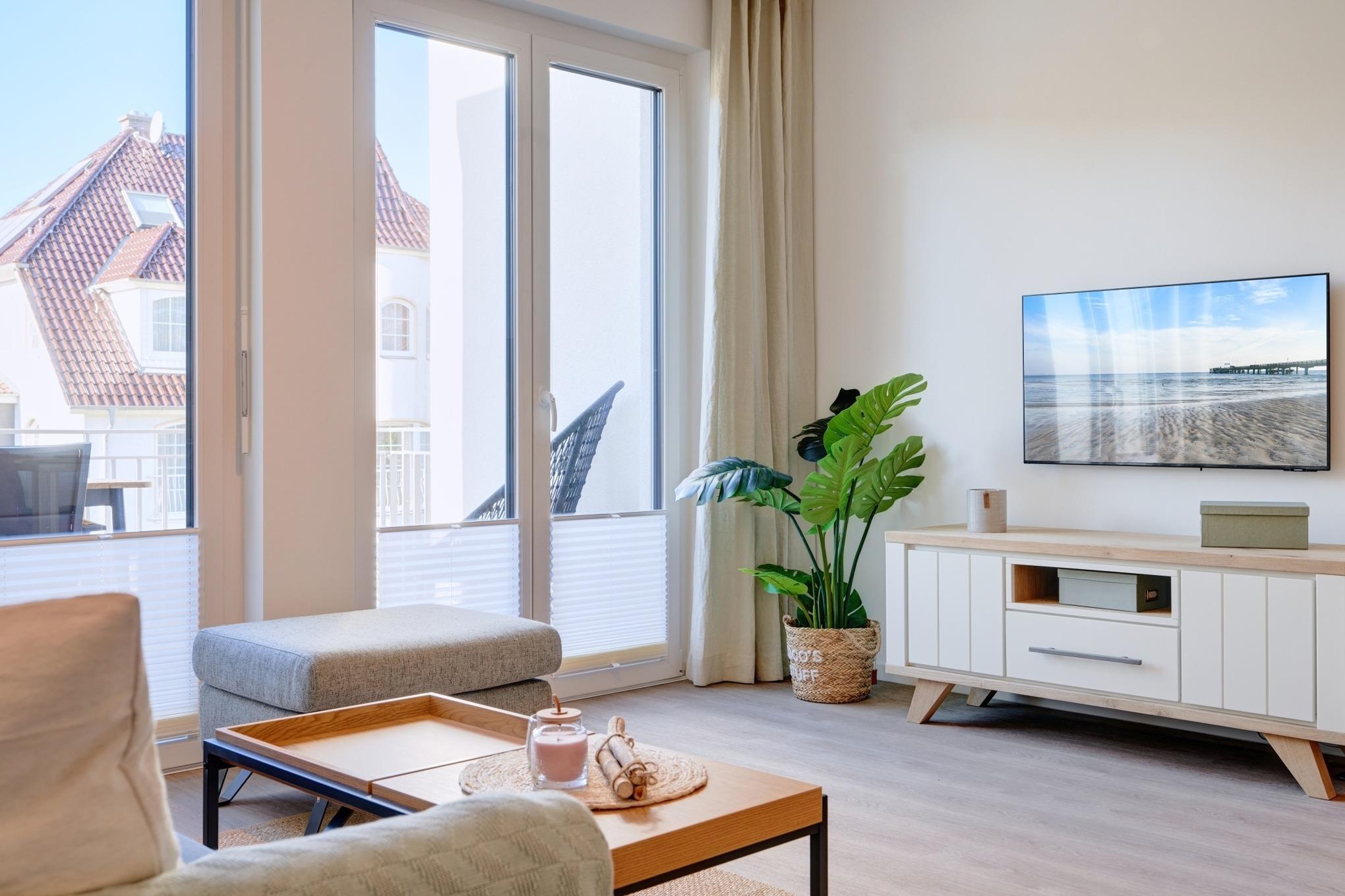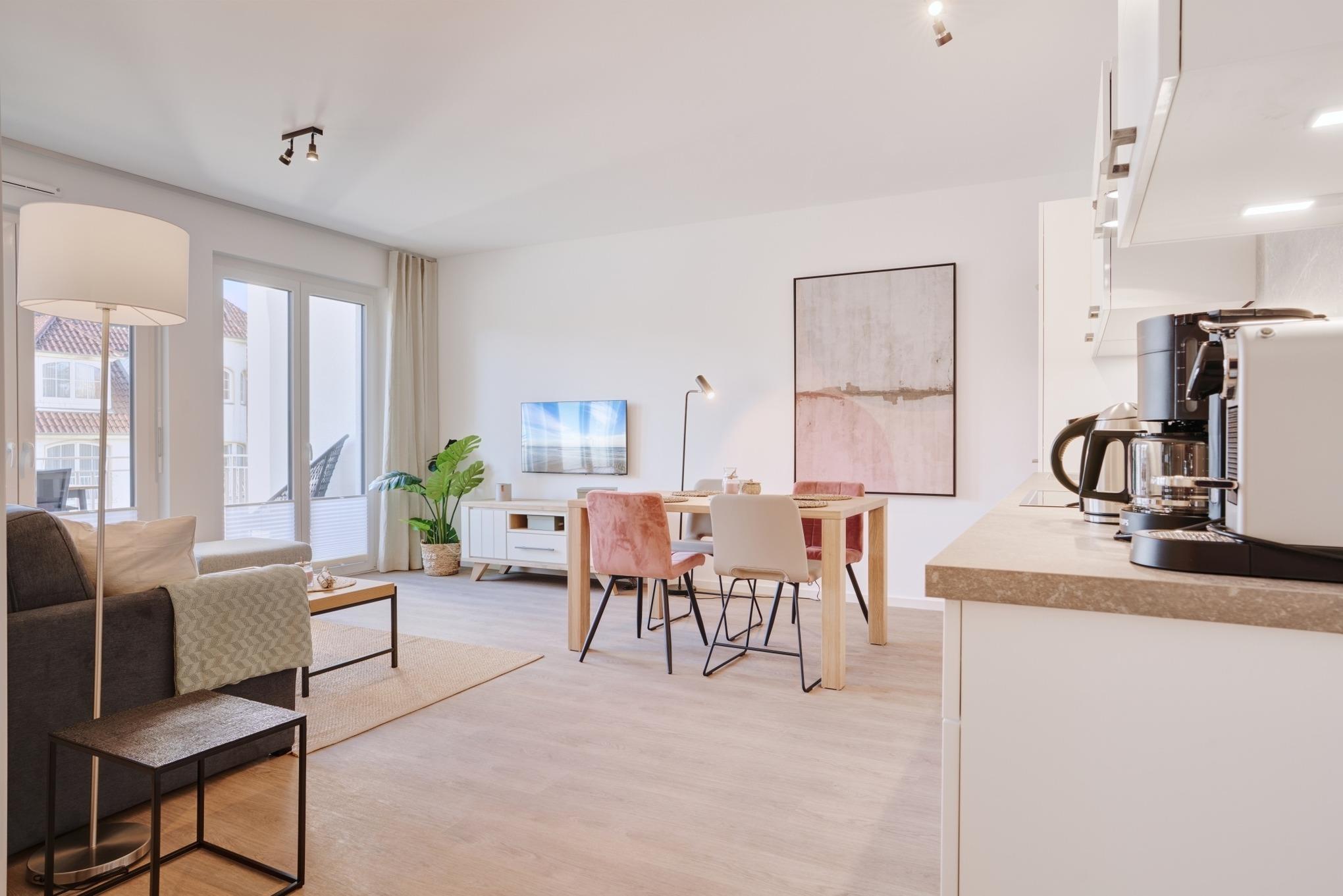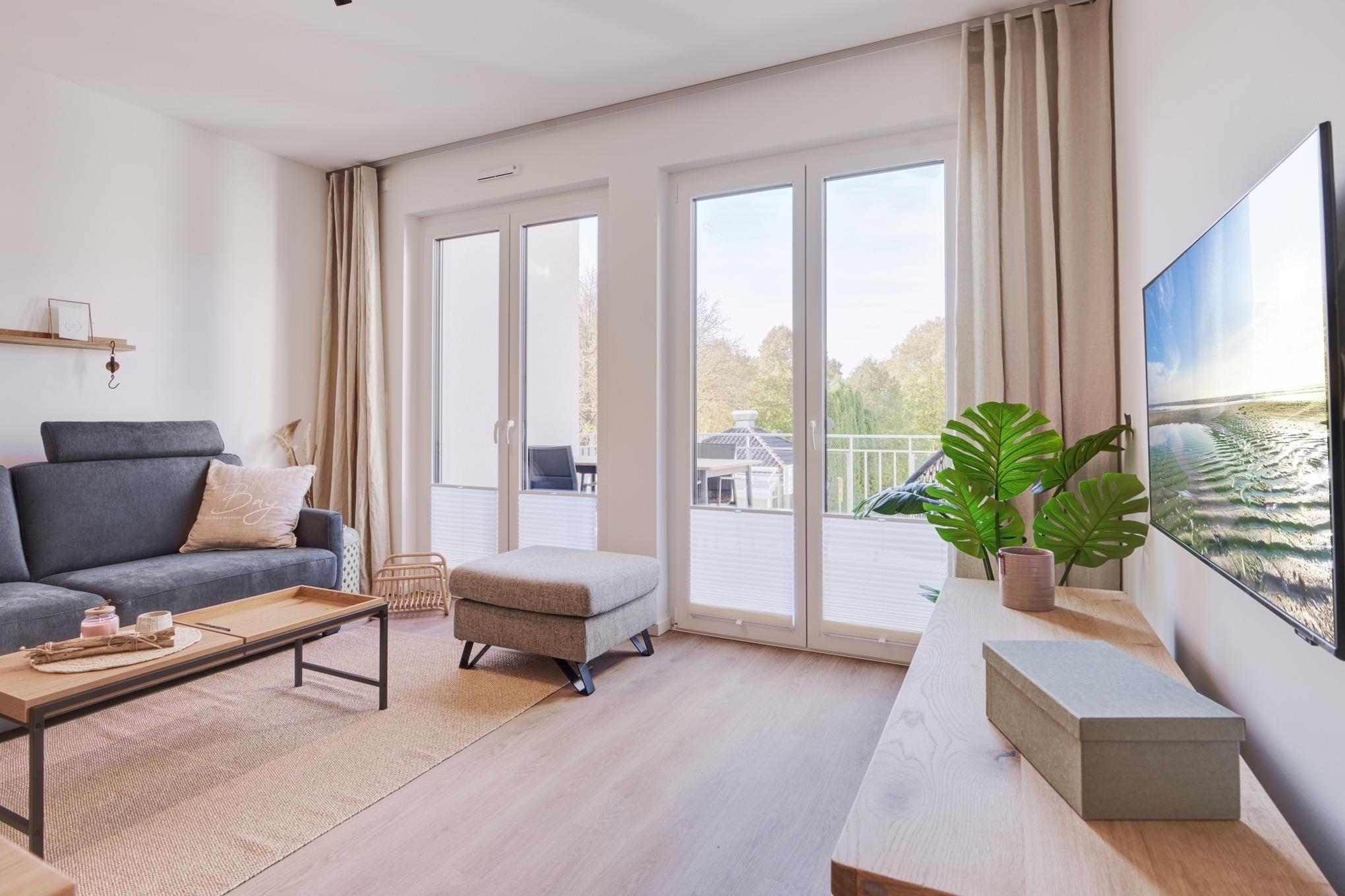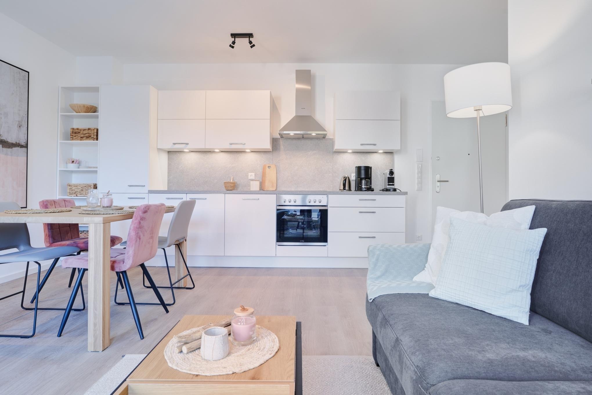 Die Ferienwohnung strahlt mit ihren bodentiefen Fenstern eine helle, behagliche Gemütlichkeit aus. Die Einbauküche im Wohn-Essbereich ist komplett ausgestattet und lässt keine Wünsche offen; Küchenzeile mit Backofen, Ceran-Kochfeld, Elektroherd,[nbsp] Geschirrspüler, Kühlschrank und Gefrierschrank, Filterkaffeemaschine, Nespresso-Maschine. Der Wohnbereich ist mit einem bequemen Sofa, einem Wohnzimmertisch, einem großen TV, Internetradio sowie einem Essbereich ausgestattet. Aus dem Wohnbereich gelangen Sie auf den herrlichen Sonnenbalkon nach Westen. Hier stehen Ihnen Tisch und Stühle sowie ein Relaxsessel zur Verfügung.