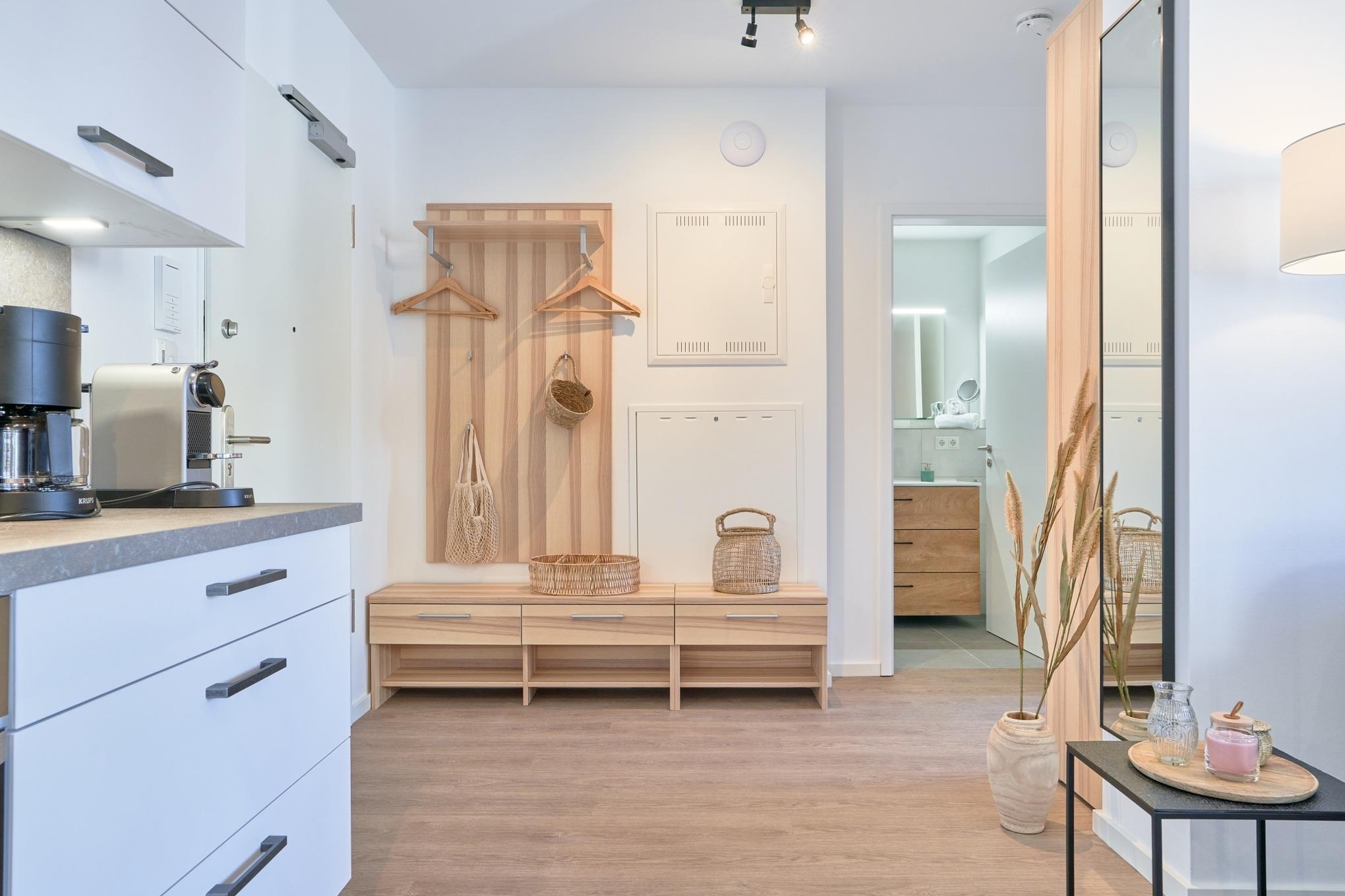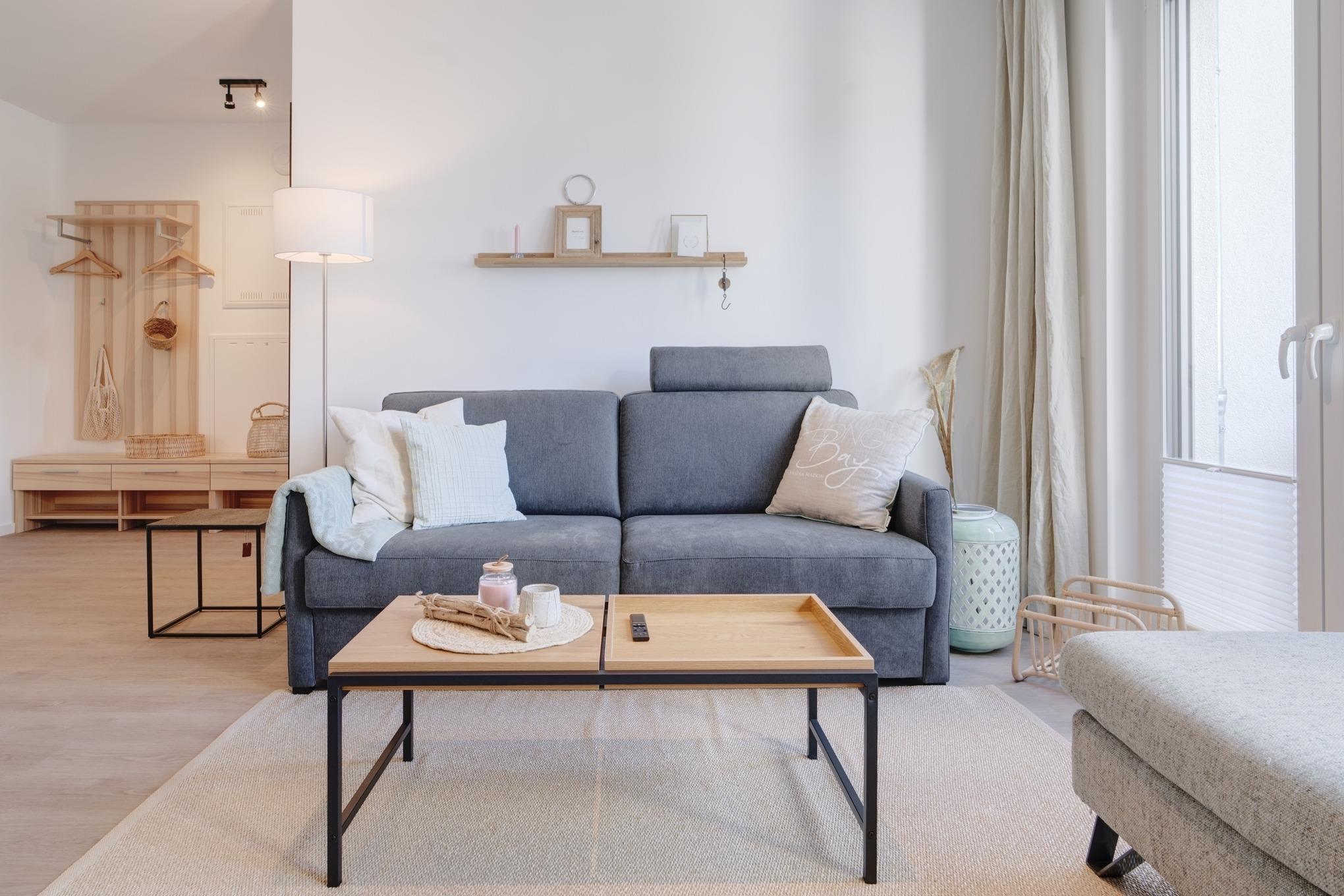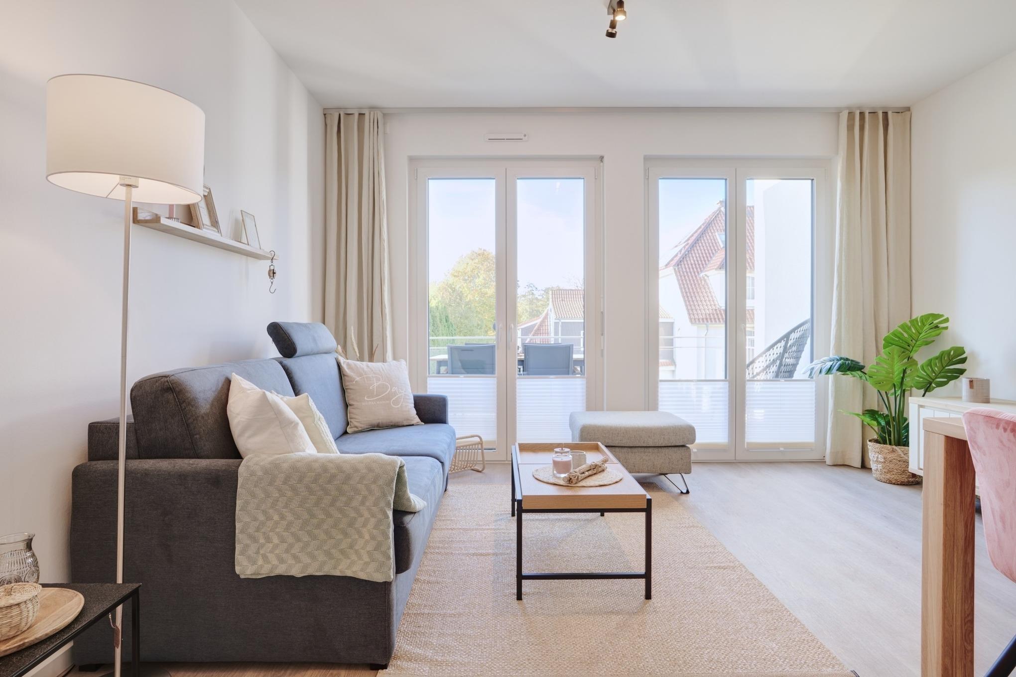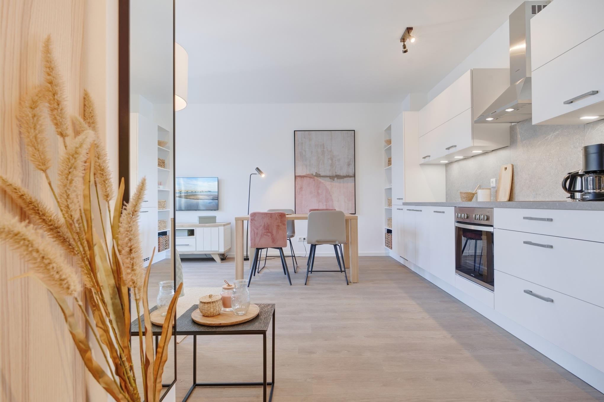 Die Ferienwohnung strahlt mit ihren bodentiefen Fenstern eine helle, behagliche Gemütlichkeit aus. Die Einbauküche im Wohn-Essbereich ist komplett ausgestattet und lässt keine Wünsche offen; Küchenzeile mit Backofen, Ceran-Kochfeld, Elektroherd,[nbsp] Geschirrspüler, Kühlschrank und Gefrierschrank, Filterkaffeemaschine, Nespresso-Maschine. Der Wohnbereich ist mit einem bequemen Sofa, einem Wohnzimmertisch, einem großen TV, Internetradio sowie einem Essbereich ausgestattet. Aus dem Wohnbereich gelangen Sie auf den herrlichen Sonnenbalkon nach Westen. Hier stehen Ihnen Tisch und Stühle sowie ein Relaxsessel zur Verfügung.