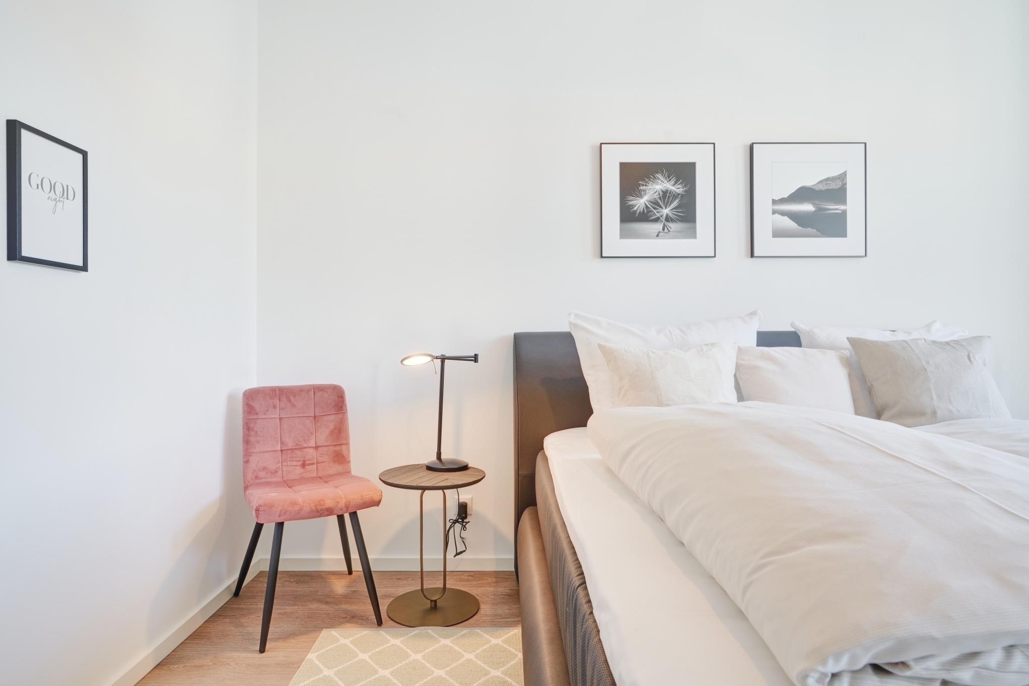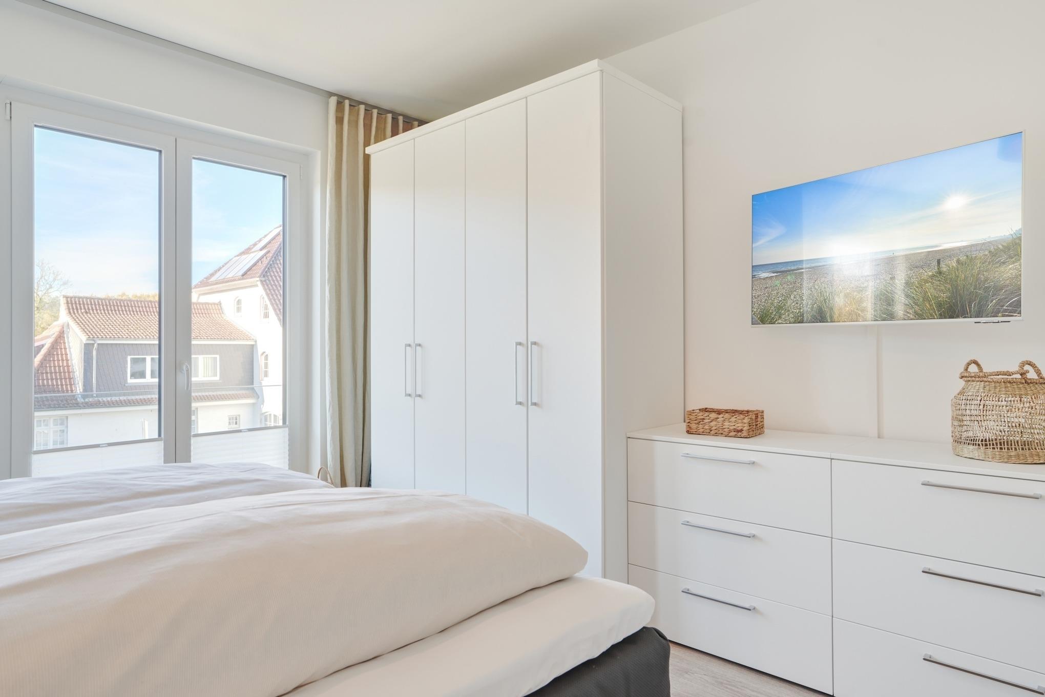 Das Schlafzimmer ist mit einem Boxspringbett (1,80mx2,00m) ausgestattet und verfügt über einen Kleiderschrank, 2 Nachttische sowie einen Wand-TV. Das Duschbad mit bodengleicher Dusche und Handtuchheizkörper, Fön, Kosmetikspiegel. Die ganze Wohnung ist mit einer Fußbodenheizung sowie mit einem Sicht- bzw. Lichtschutz an allen Fenstern und zusätzlichen elektrischen Rollläden ausgestattet.