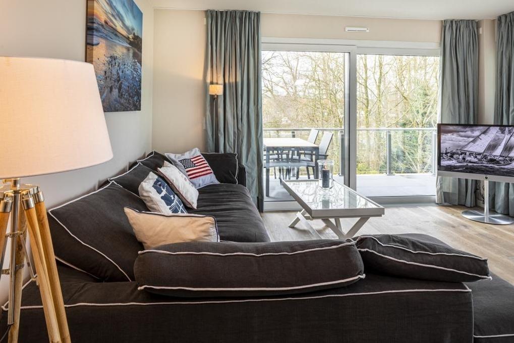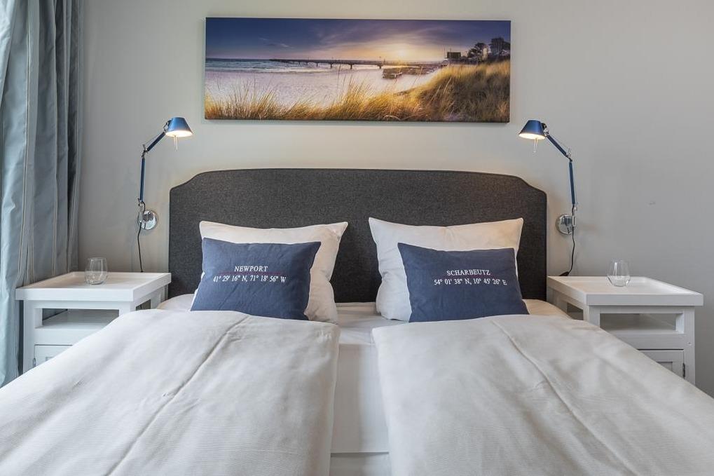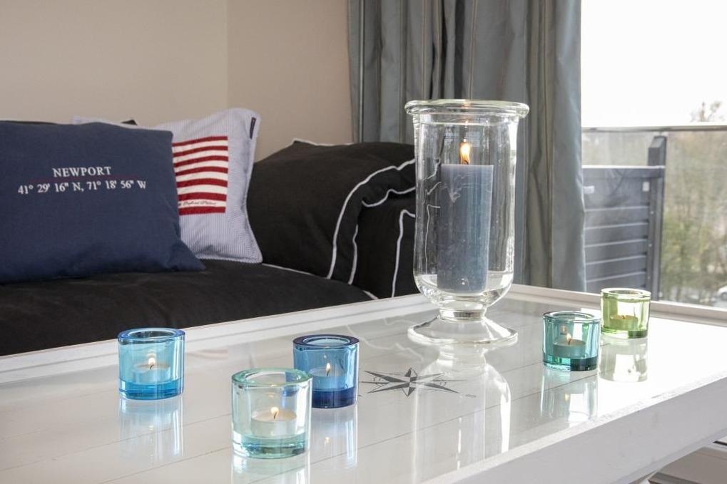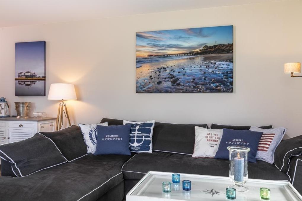 Schöne 3-Zi-Wohnung, ca. 70 m²,[nbsp] für bis zu 4 Personen in direkter Strandlage mit Teil-Meerblick, besonders hochwertiger Ausstattung im New-England-Style, Whirlpool und großem Sonnen-Balkon.