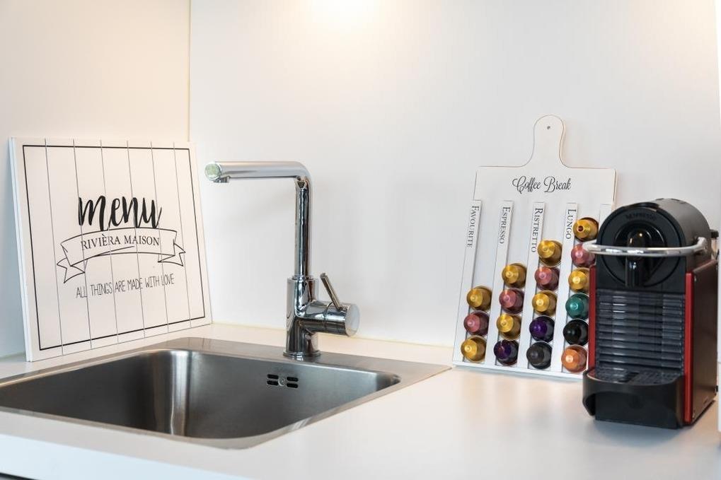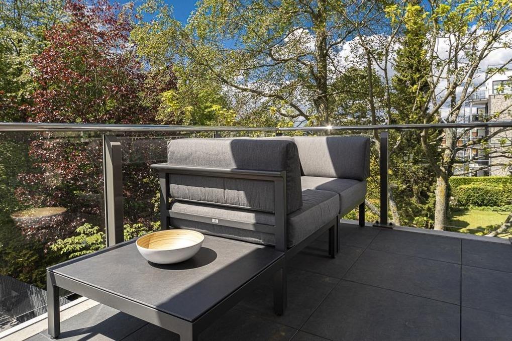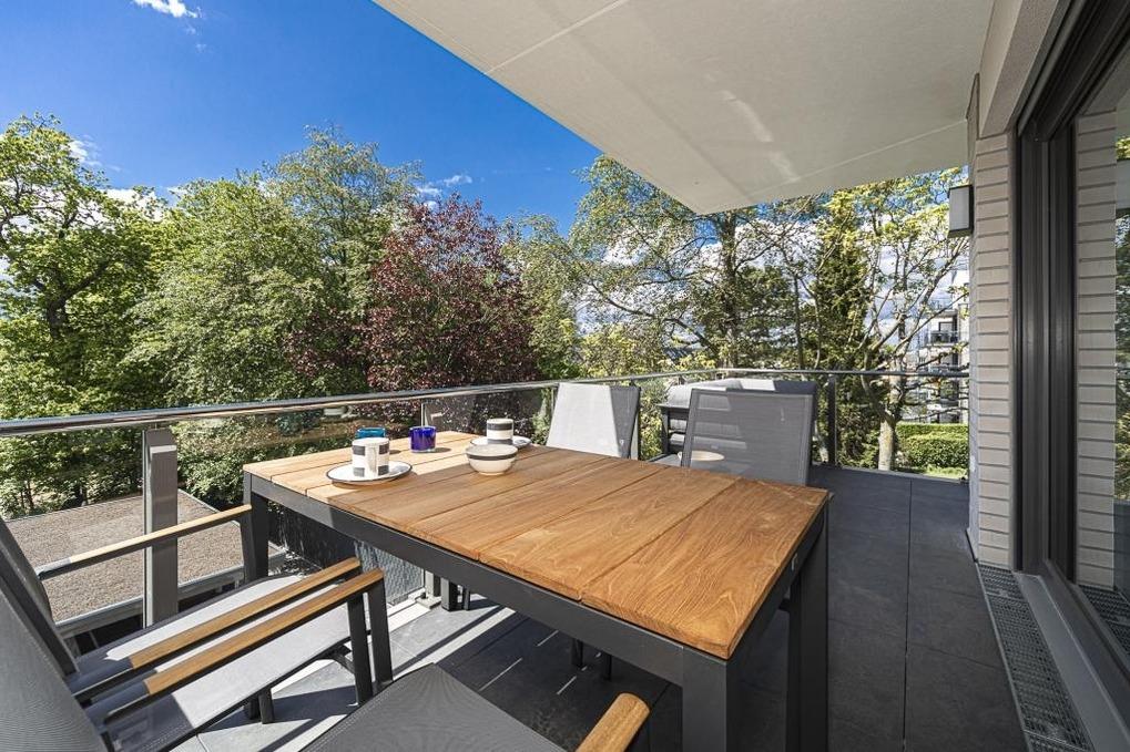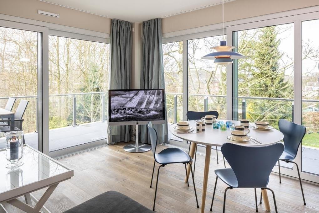 Der geräumige Wohn-Essbereich mit einer voll ausgestatteten Küchenzeile mit hochwertigen Markengeräten und einer Nespresso-Maschine lässt keine Wünsche offen. Der runde Esstisch mit Platz für bis zu 4 Personen ermöglicht gesellige Stunden auch mit Gästen. Vom großzügigen Weylandts-Eck-Sofa hat man einen wunderschönen Blick in die umliegenden grünen Gärten. Es ist keine rückwärtige Bebauung vorhanden. Design-Klassiker wie Riviera-Maison-Couchtisch und -Sideboards, Arne-Jacobsen-Stühle, Artemide-Leuchten, Hästens-Betten und Lexington-Geschirr begeistern Designfreunde und sorgen für eine stylische, aber auch gemütliche Atmosphäre. Alles wurde mit viel Liebe zum Detail aufeinander abgestimmt und bietet luxuriösen Komfort.