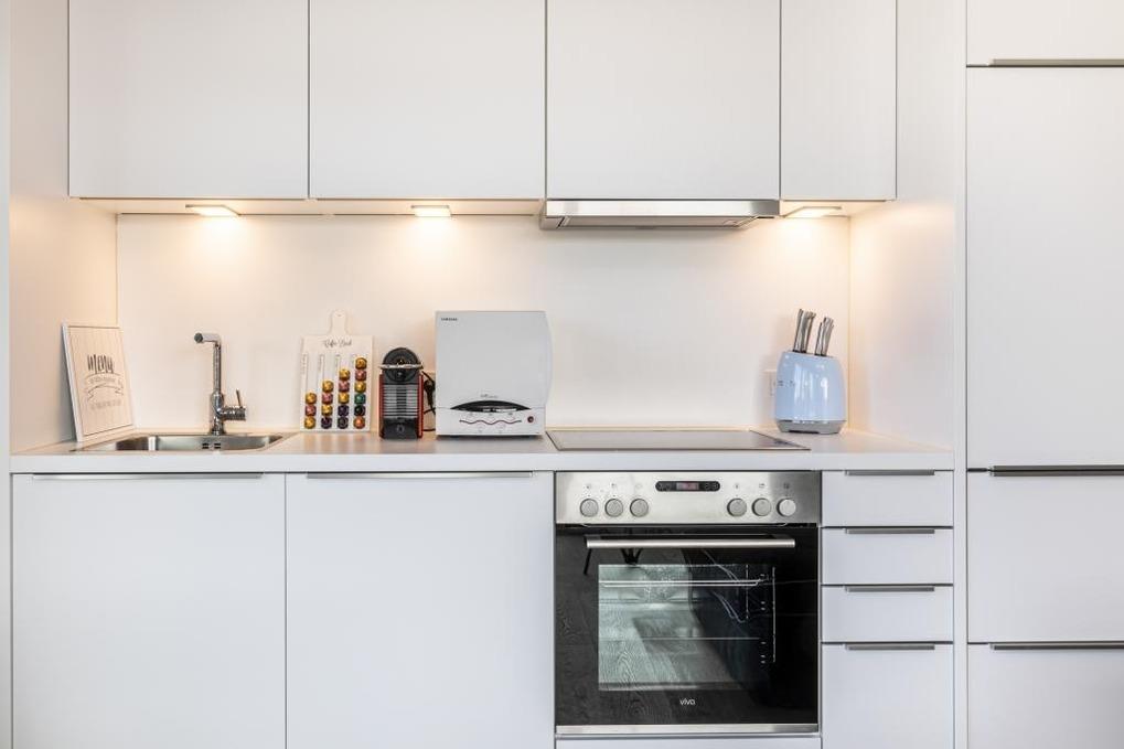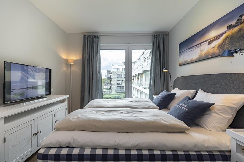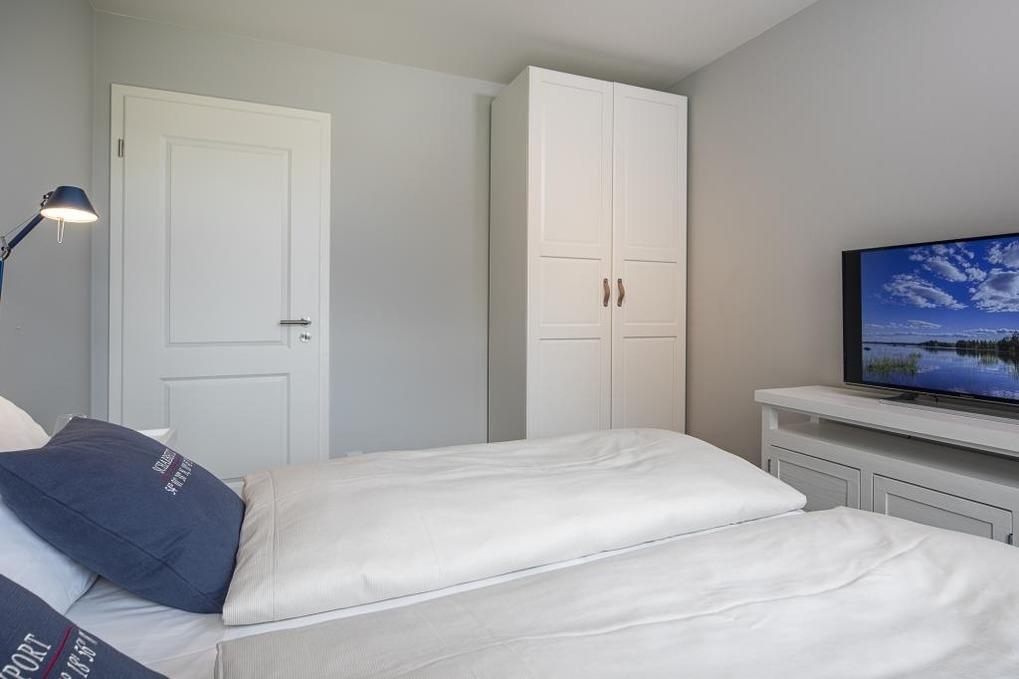Die Wohnung bietet alle Annehmlichkeiten eines modernen Neubaus, wie bodentiefe Fenster mit Außenjalousien, Fußbodenheizung, hochwertiges Echtholzparkett und einen großzügigen Eckbalkon mit seitlichem Meerblick. Die Wohnung verfügt über 2 Schlafzimmer und bietet Platz für bis zu 4 Personen. Beide Schlafzimmer verfügen über Flachbildfernseher und Boxspringbetten der Luxusmarke Hästens, das Hauptschlafzimmer über ein großes Doppelbett (1,80 x 2,00m), das 2. Schlafzimmer über 2 Einzelbetten. Das Wellness-Badezimmer mit Tageslicht ist sowohl mit einer bodentiefen Dusche als auch mit einer Badewanne mit Whirlpool-Funktion ausgestattet; selbstverständlich sind Handtuchheizkörper und ein großzügiger Waschtisch mit ausreichend Ablagefläche.
