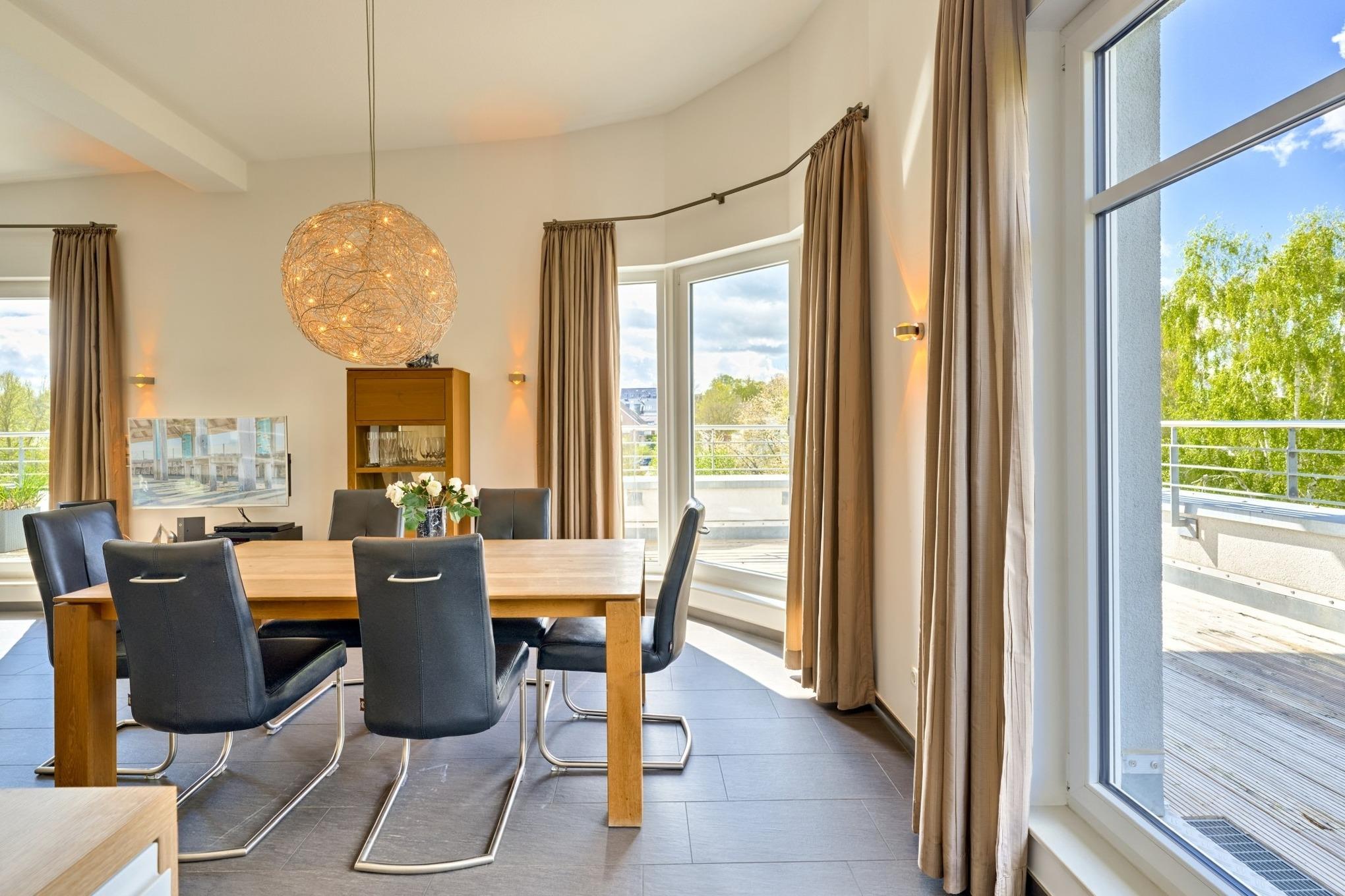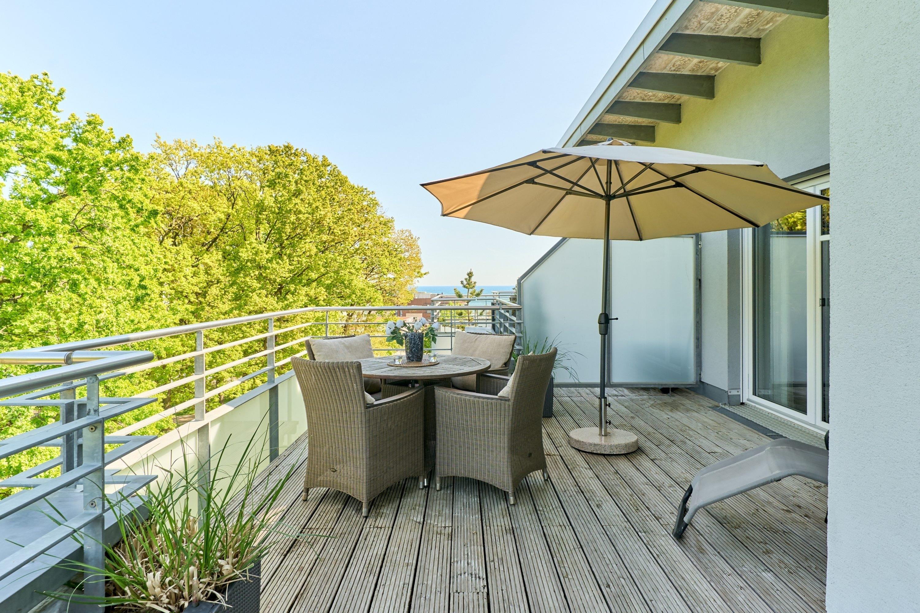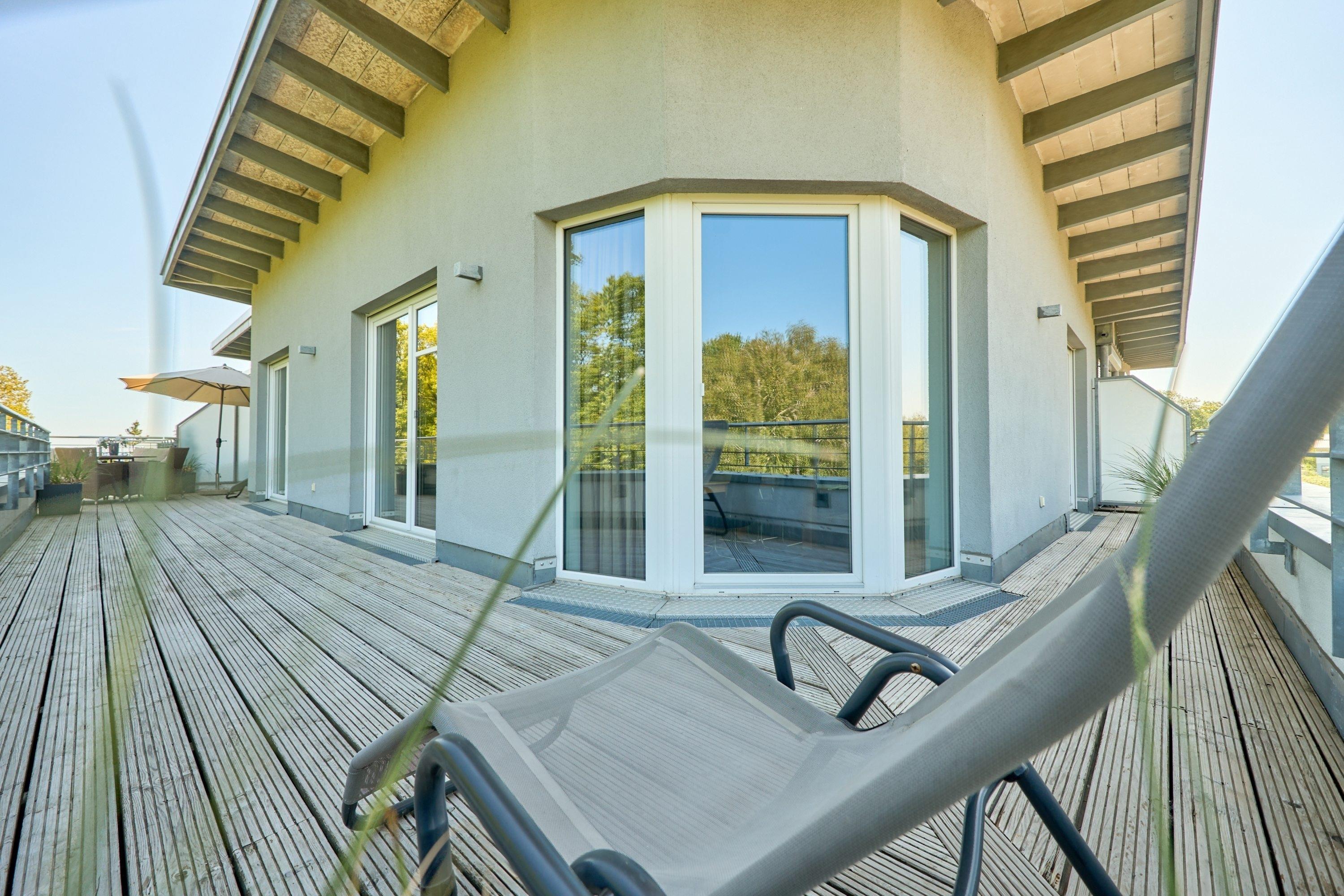 Der Wohnbereich ist mit einer großzügigen Sitzecke ausgestattet. Neben einem Flachbildfernseher, einem BluRay-Player und einem CD-Player steht Ihnen selbstverständlich kostenloses WLAN zur Verfügung. Die 49 m² große Dachterrasse bietet Ihnen einen Teilostseeblick oder den Blick in den schönen Kurpark von Scharbeutz. Sie ist mit einem Tisch, Stühlen, Liegen und einem Sonnenschirm ausgestattet. Die moderne Küche ist komplett ausgestattet und lässt keine Wünsche offen. Der große Esstisch lädt Sie zu geselligen Stunden ein. Im 1. Schlafzimmer steht ein bequemes Boxspringbett (1,80 x 2,00m) sowie ein geräumiger Schrank. Im 2. Schlafzimmer stehen zwei Einzelbetten (0,90 x 2,00m) und ein Flachbildfernseher. Von beiden Schlafzimmern aus gelangen Sie auf die Dachterrasse. Zur Verdunkelung sind elektrische Rollläden angebracht. Das Badezimmer verfügt über eine bodentiefe Dusche und einen großen Spiegelschrank. Neben der Fußbodenheizung ist hier ein zusätzlicher Handtuchheizkörper angebracht.