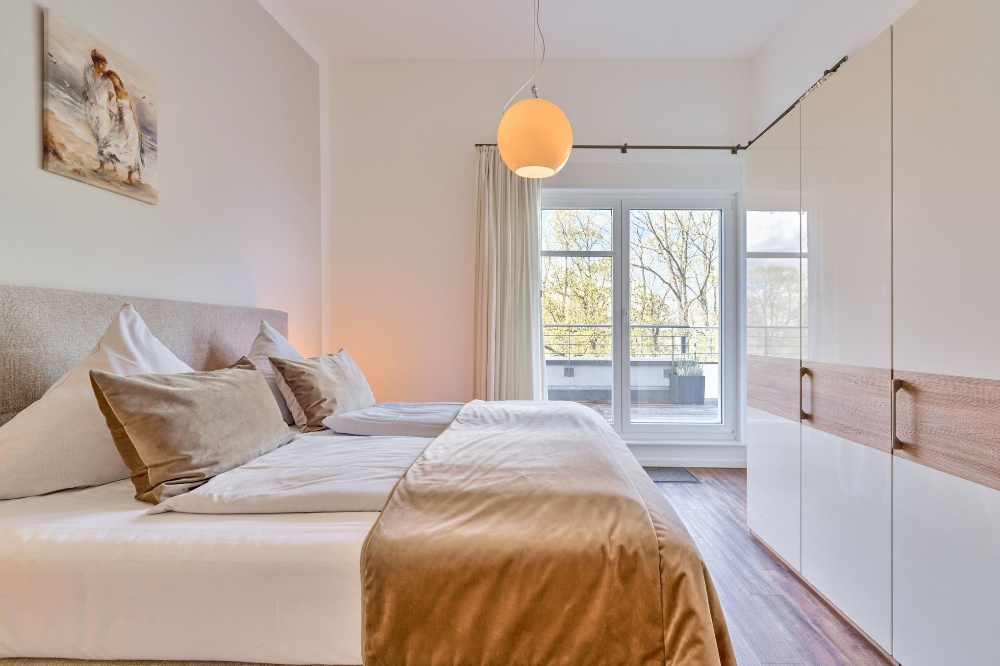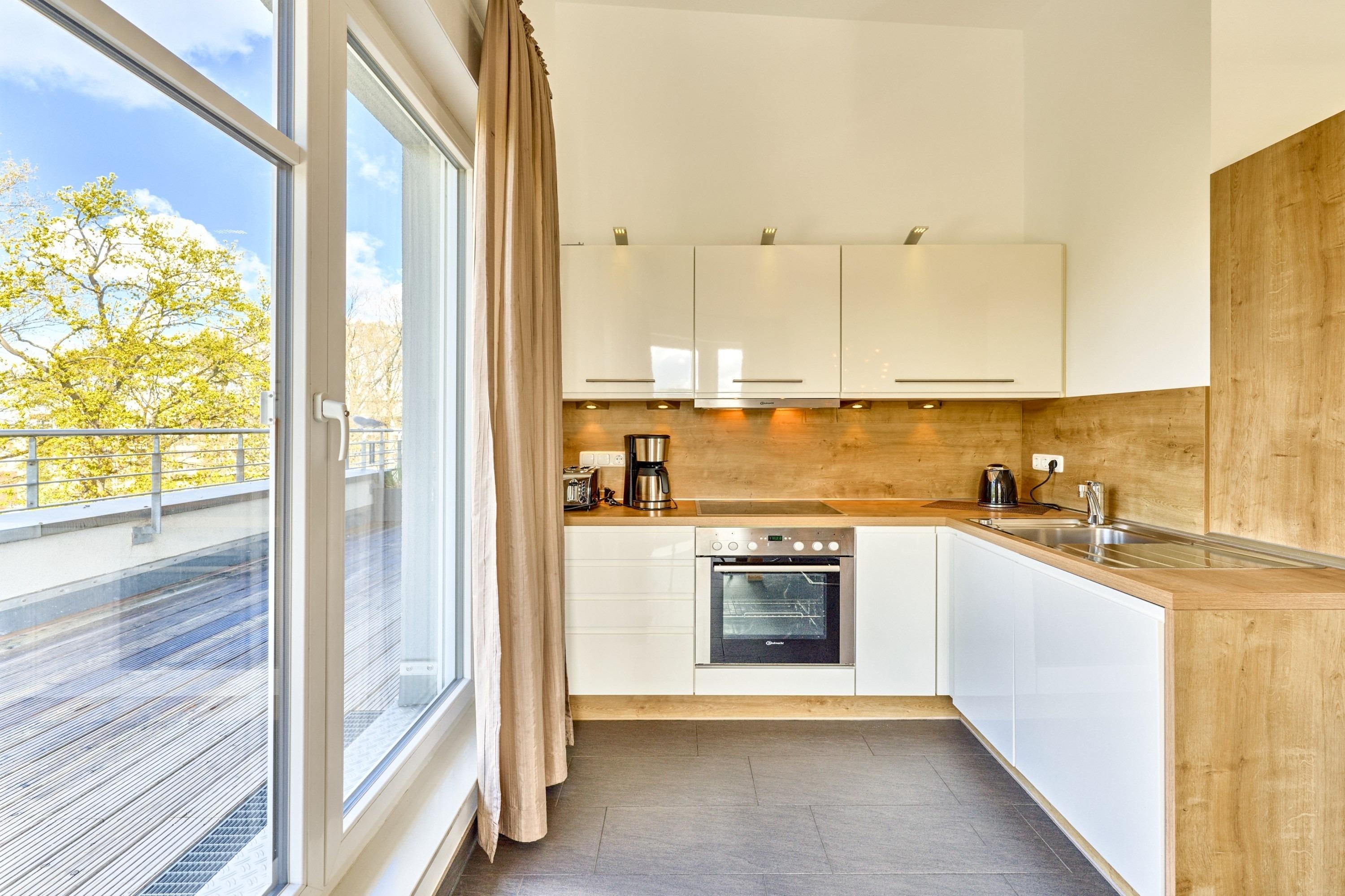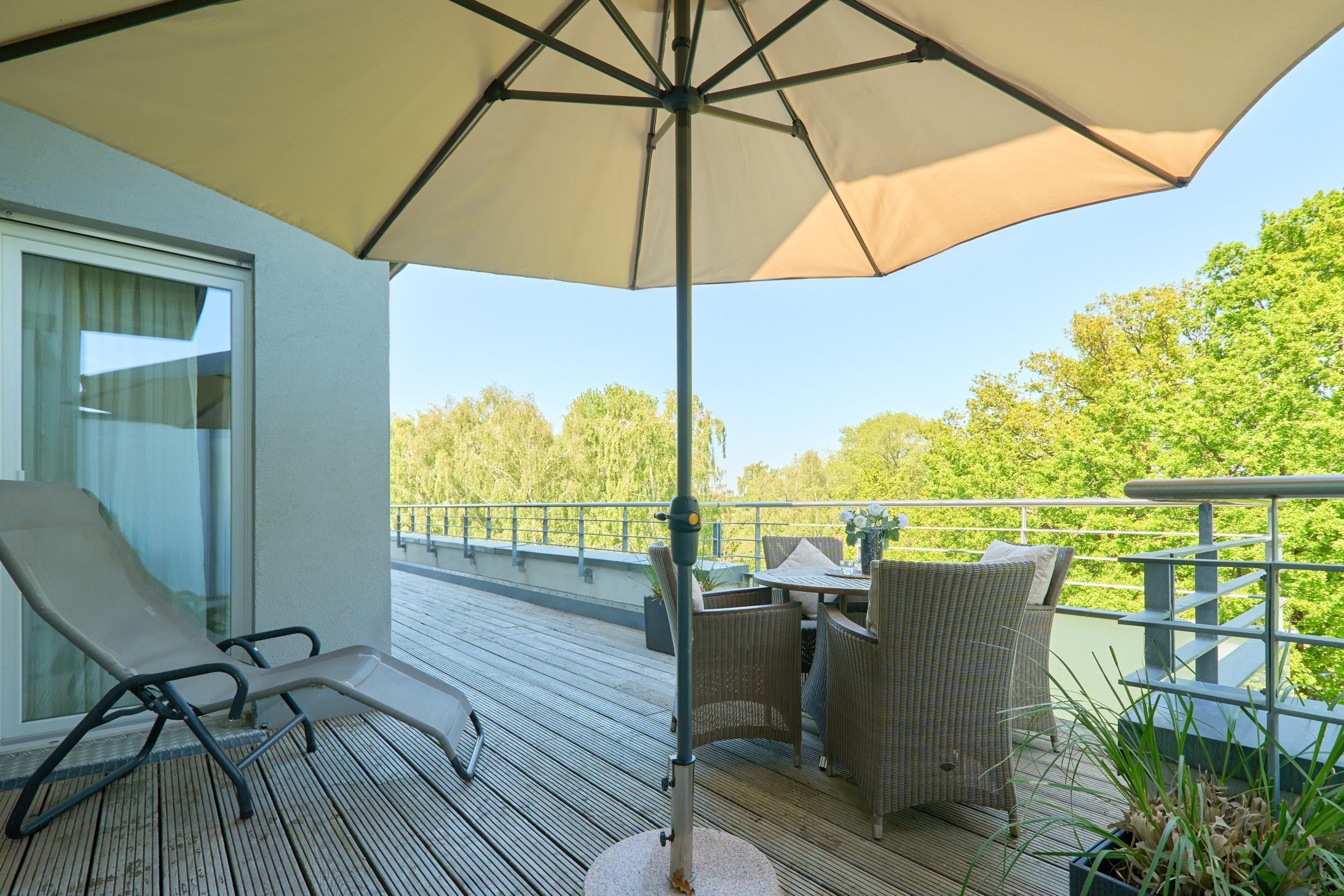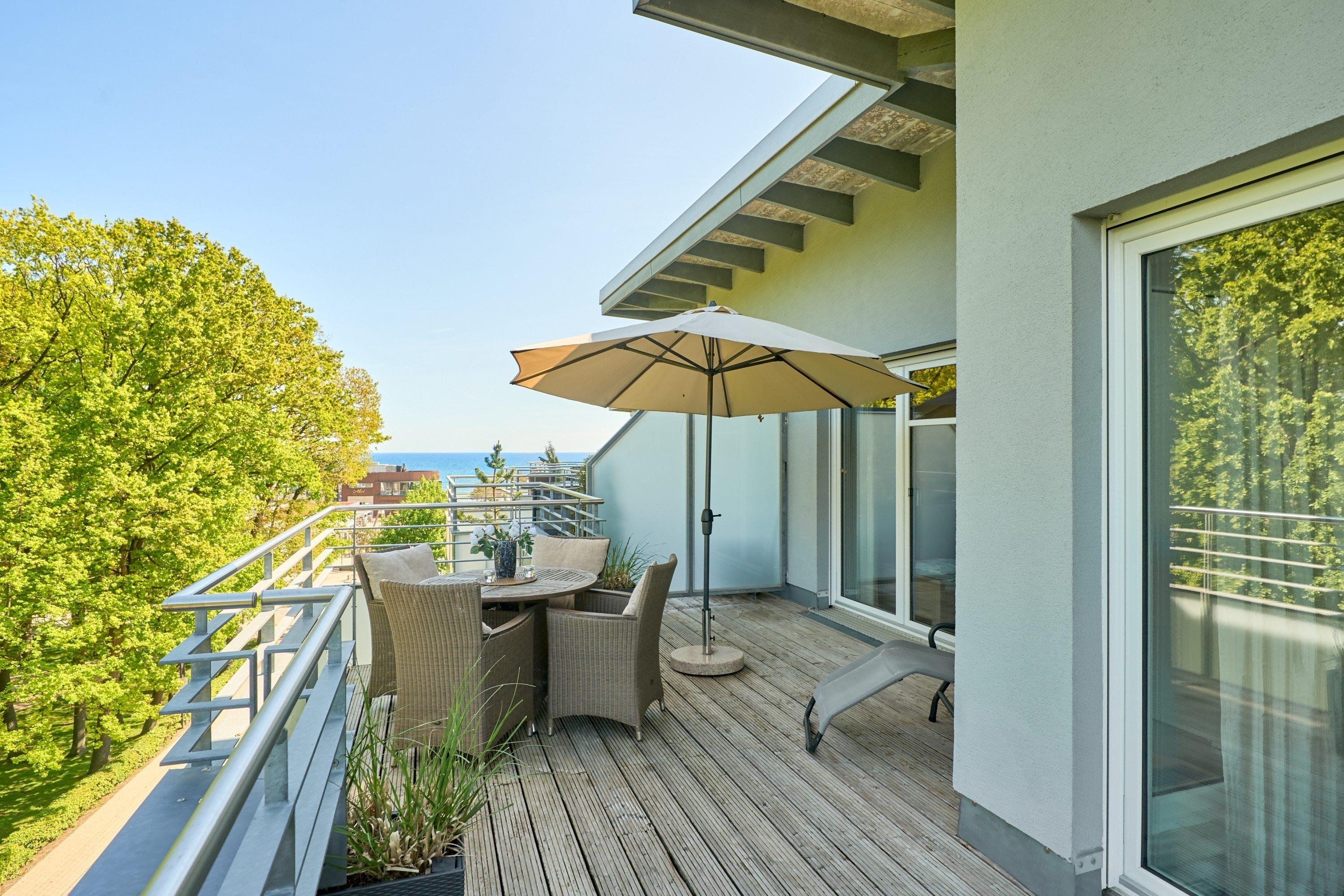 Der Wohnbereich ist mit einer großzügigen Sitzecke ausgestattet. Neben einem Flachbildfernseher, einem BluRay-Player und einem CD-Player steht Ihnen selbstverständlich kostenloses WLAN zur Verfügung. Die 49 m² große Dachterrasse bietet Ihnen einen Teilostseeblick oder den Blick in den schönen Kurpark von Scharbeutz. Sie ist mit einem Tisch, Stühlen, Liegen und einem Sonnenschirm ausgestattet. Die moderne Küche ist komplett ausgestattet und lässt keine Wünsche offen. Der große Esstisch lädt Sie zu geselligen Stunden ein. Im 1. Schlafzimmer steht ein bequemes Boxspringbett (1,80 x 2,00m) sowie ein geräumiger Schrank. Im 2. Schlafzimmer stehen zwei Einzelbetten (0,90 x 2,00m) und ein Flachbildfernseher. Von beiden Schlafzimmern aus gelangen Sie auf die Dachterrasse. Zur Verdunkelung sind elektrische Rollläden angebracht. Das Badezimmer verfügt über eine bodentiefe Dusche und einen großen Spiegelschrank. Neben der Fußbodenheizung ist hier ein zusätzlicher Handtuchheizkörper angebracht.