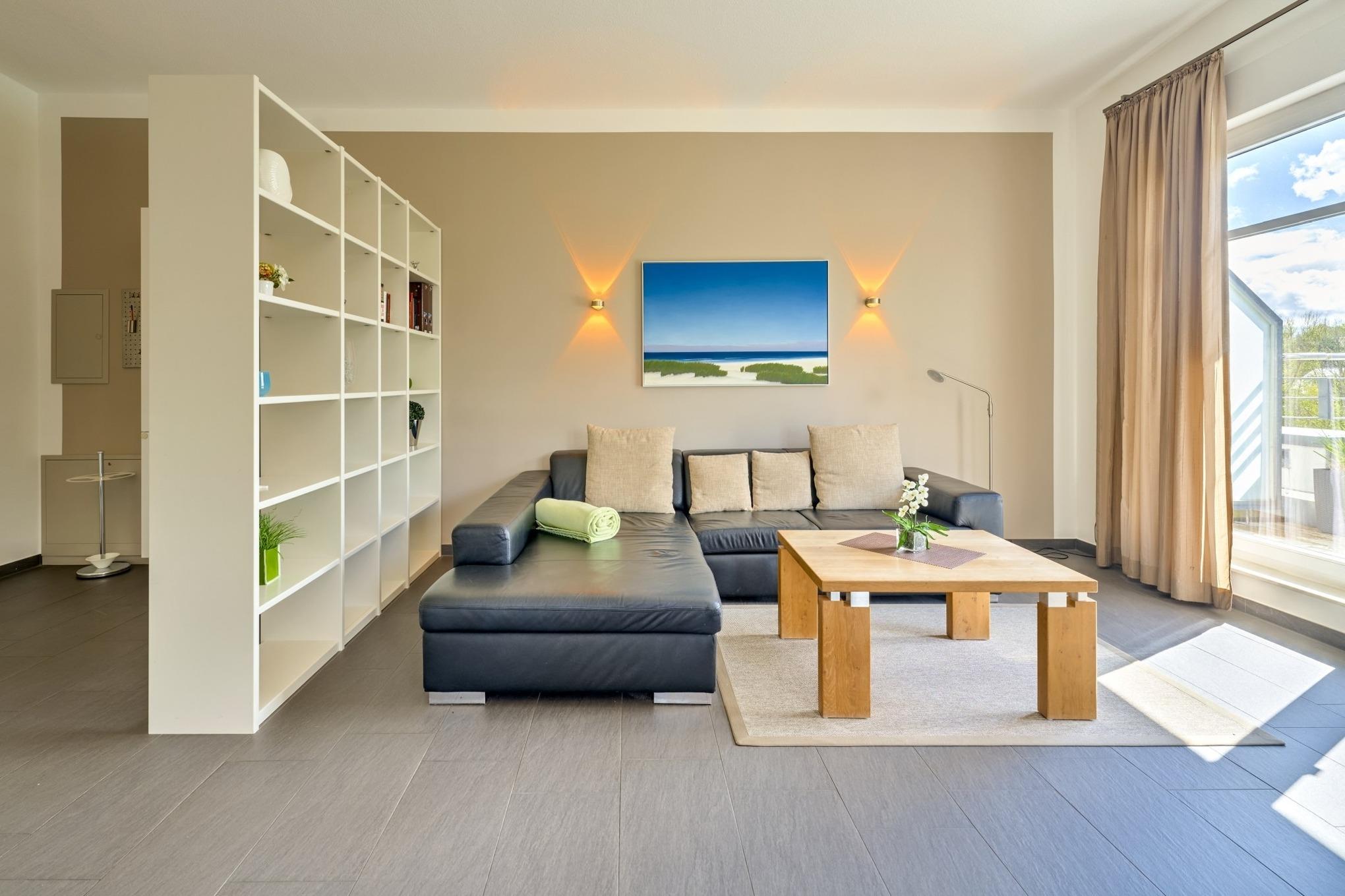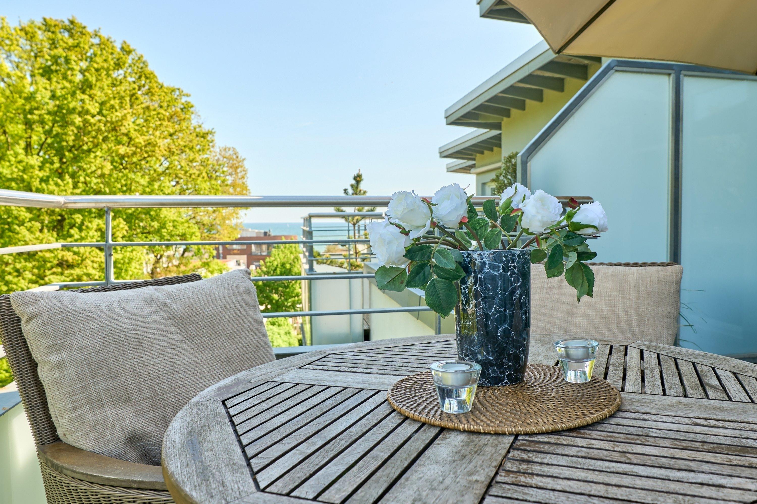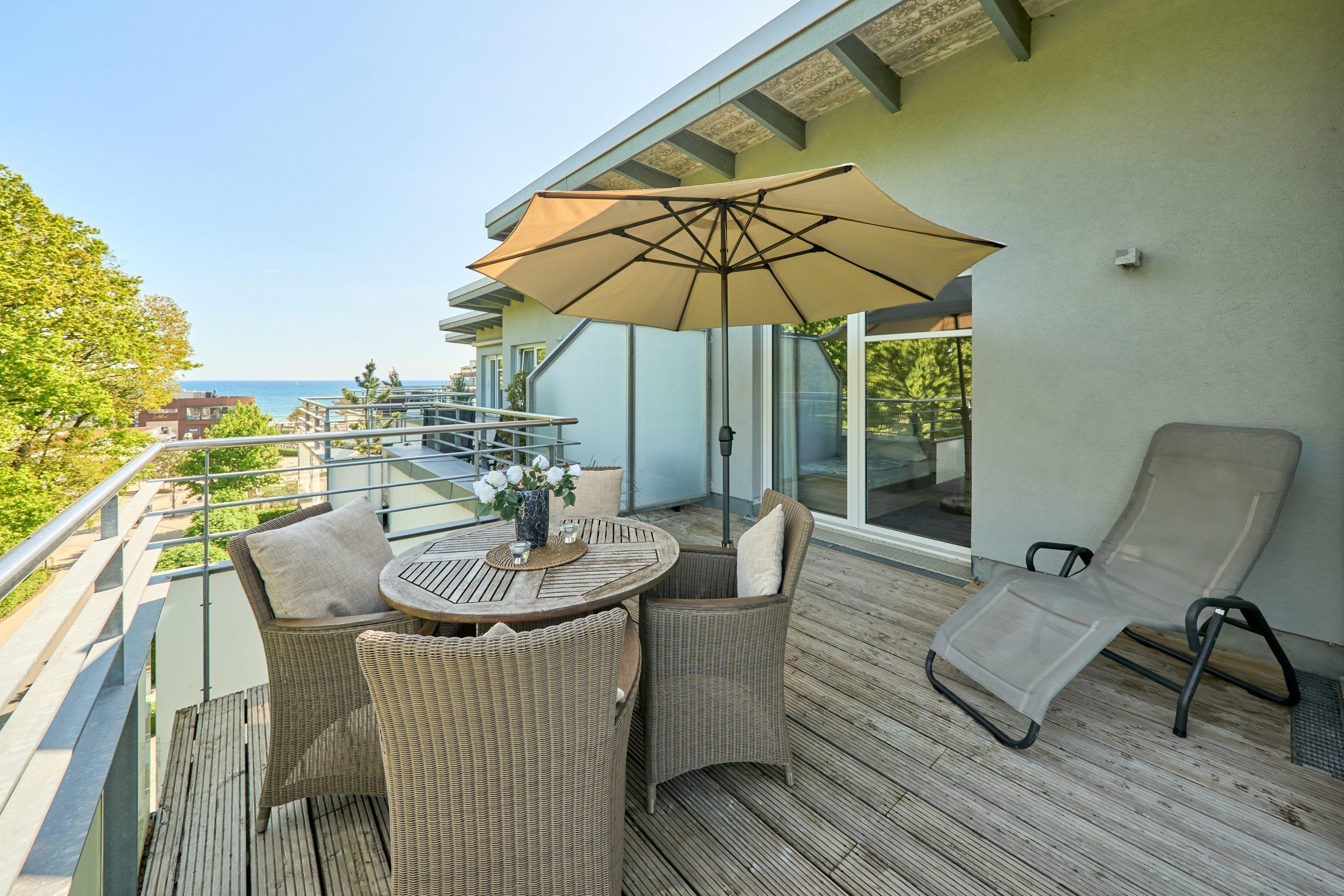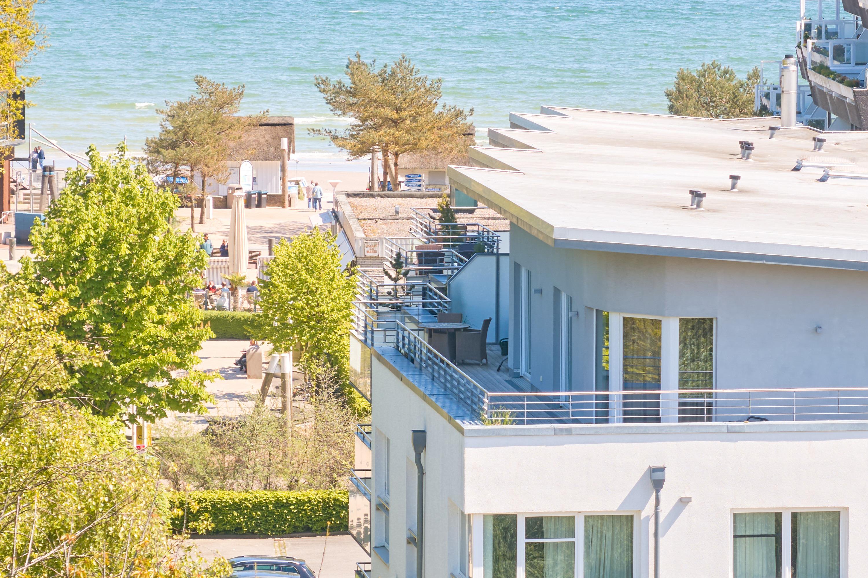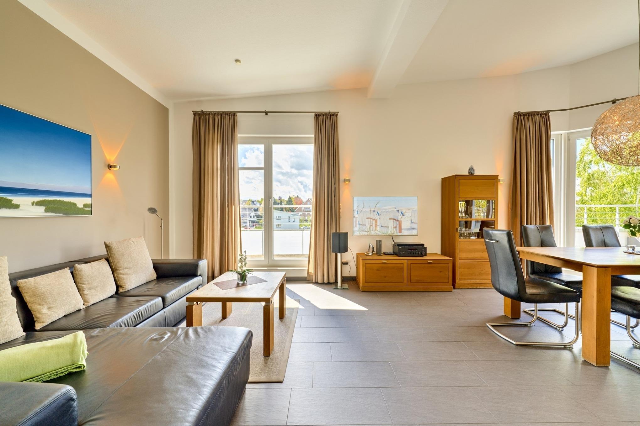 3-Zimmer-Ferienwohnung, ca. 94 m², Dachterrasse mit Teilmeerblick, Duschbad, Gäste-WC, eigene Waschmaschine und Kondenstrockner, ein Tiefgaragenstellplatz (Durchfahrthöhe 1,95) und Fahrstuhl, für bis zu 4 Personen.