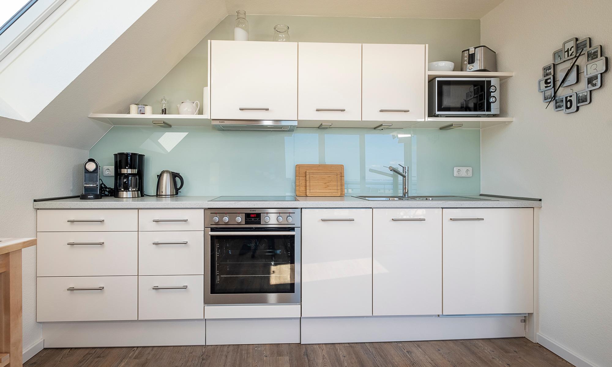 Heller, großer Wohn-Essbereich mit weitem Blick auf die Ostsee. Tiefer sowie breiter Balkon mit Tisch und Stühlen, Ostseeblick pur. Schöner Wohnbereich mit einem Sofa, 2 Sesseln sowie Beistelltischen. Flach-TV, DVD-Player, Bose-Radio, CD-Player, Bücher, Spiele und DVD´s. Der Essbereich bietet Ihnen Platz für 4 Personen. Hier können Sie ausgiebig frühstücken und den Ostseeblick genießen. Die moderne Küche ist komplett ausgestattet und lässt keine Wünsche offen. Neben der Filterkaffeemaschine steht Ihnen hier zusätzlich eine Nespresso-Maschine zur Verfügung. Kleiner Abstellraum. Selbstverständlich steht Ihnen auch in dieser Wohnung kostenloses WLAN zur Verfügung.