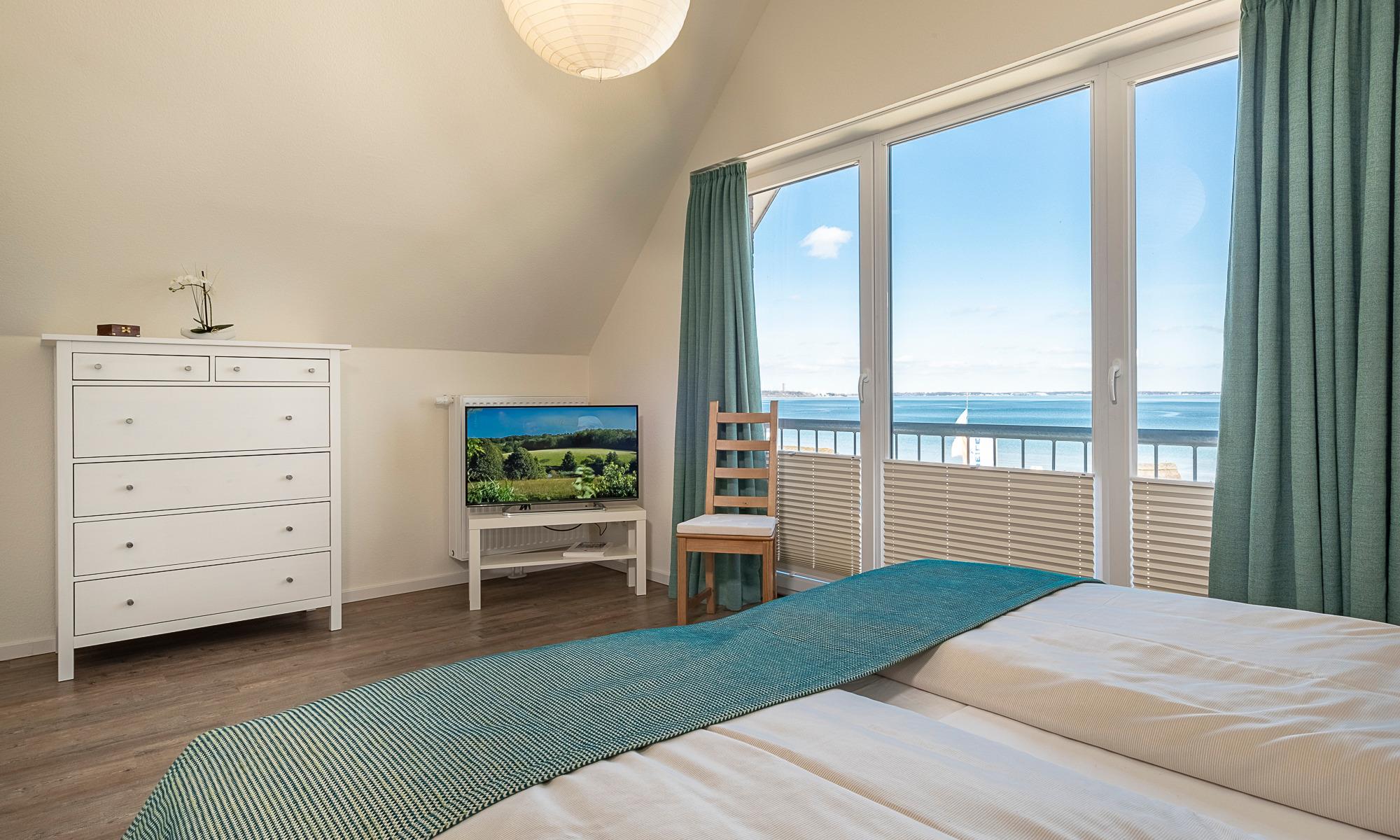 Das Tageslichtduschbad verfügt über eine bodentiefe Dusche und einen großen Waschtisch sowie eine Waschmaschine. Neben der Fußbodenheizung ist hier ein Handtuchheizkörper angebracht. Über eine bequeme Treppe erreichen Sie das Obergeschoss. Hier stehen Ihnen zwei Schlafzimmer zur Verfügung. Das eine Schlafzimmer (mit Ostseeblick) hat ein großes Doppelbett (1,80 x 2,00 m, Einzelmatratzen) mit Komforthöhe, eine große Kommode sowie einen Design-Garderobenständer/Kleideraufhängung und einen Flach-TV. Das zweite Schlafzimmer ist mit einem breiten Bett (1,20 x 2,00m) mit Komforthöhe sowie einem Kleiderschrank und Flachbild-TV ausgestattet. Hier befindet sich auch das großzügige Tageslicht-Gäste-WC mit einem Waschtisch.