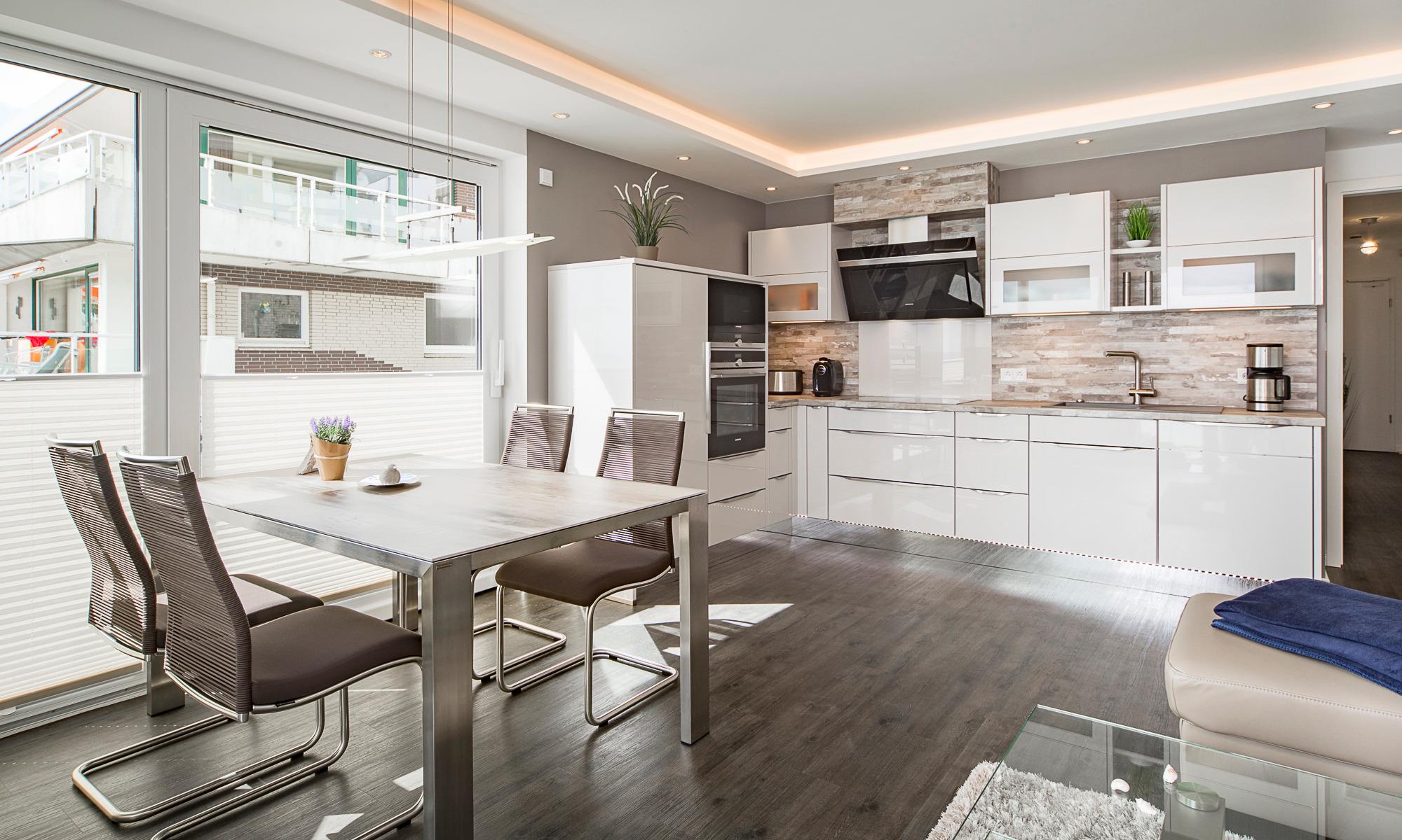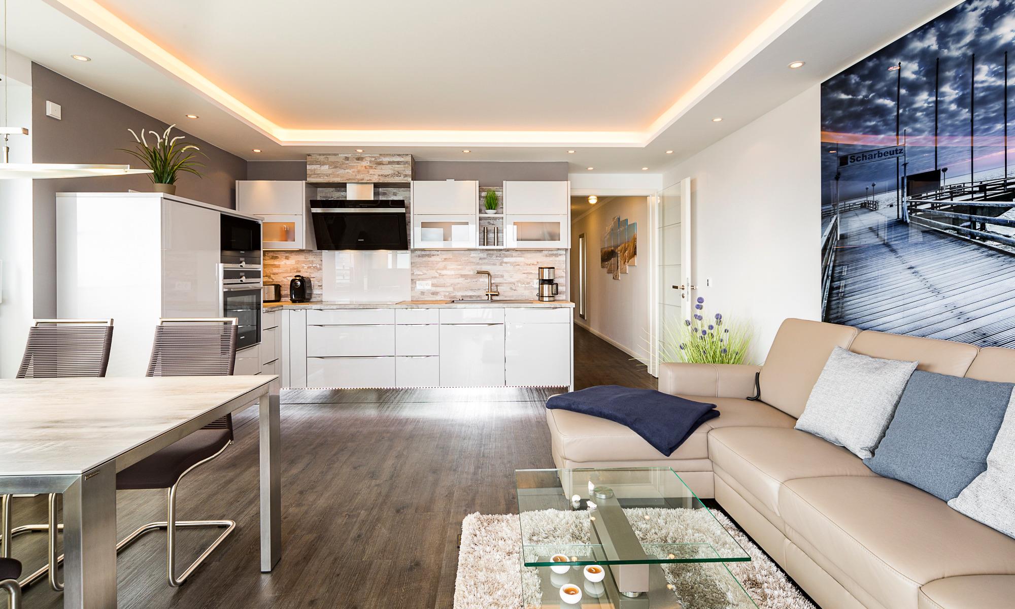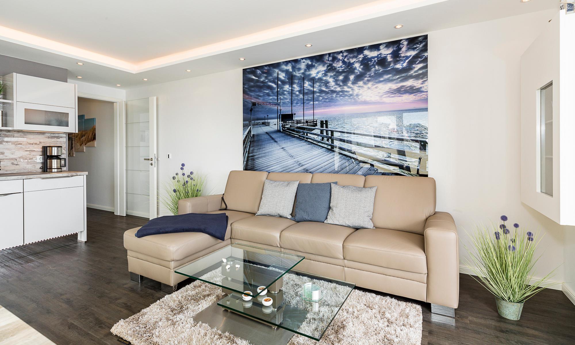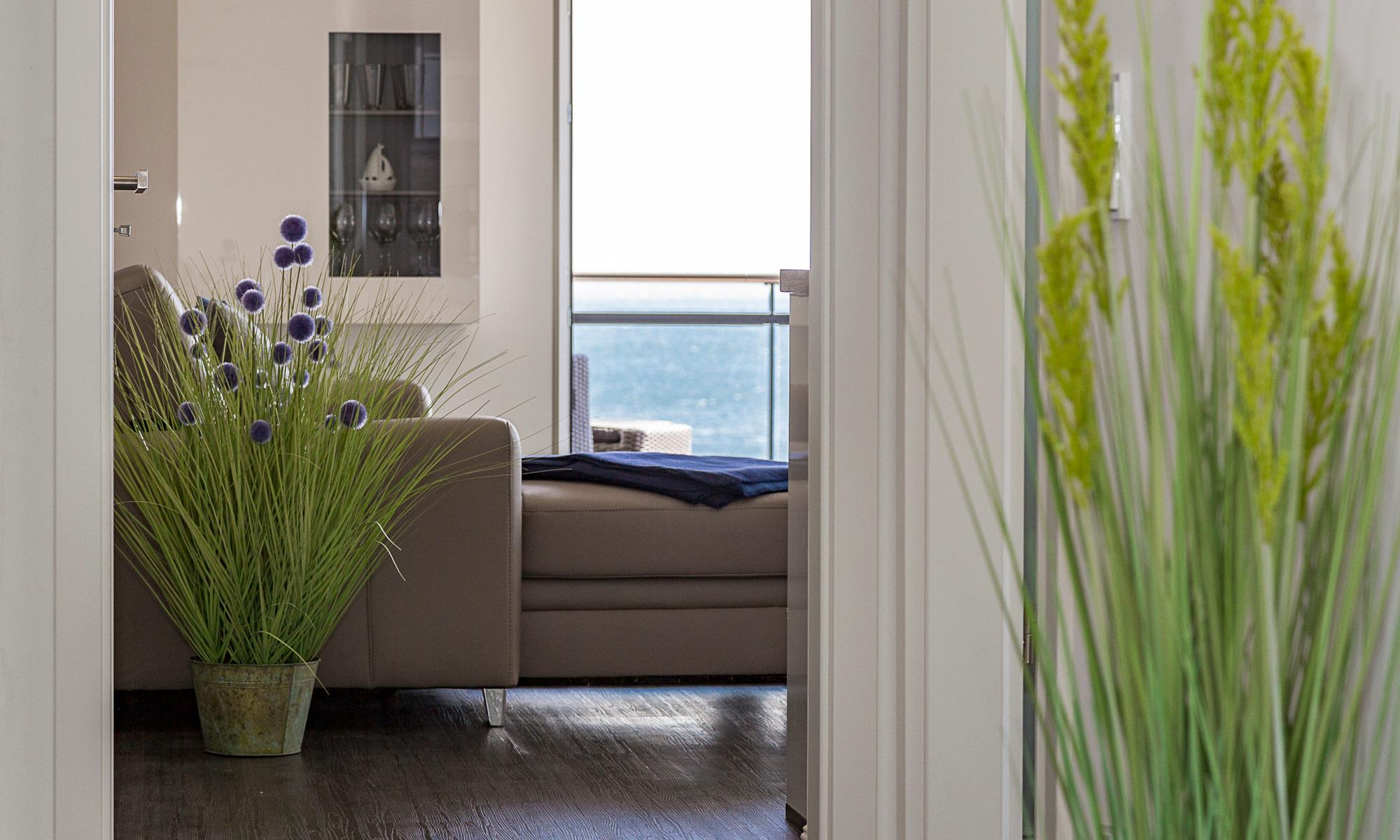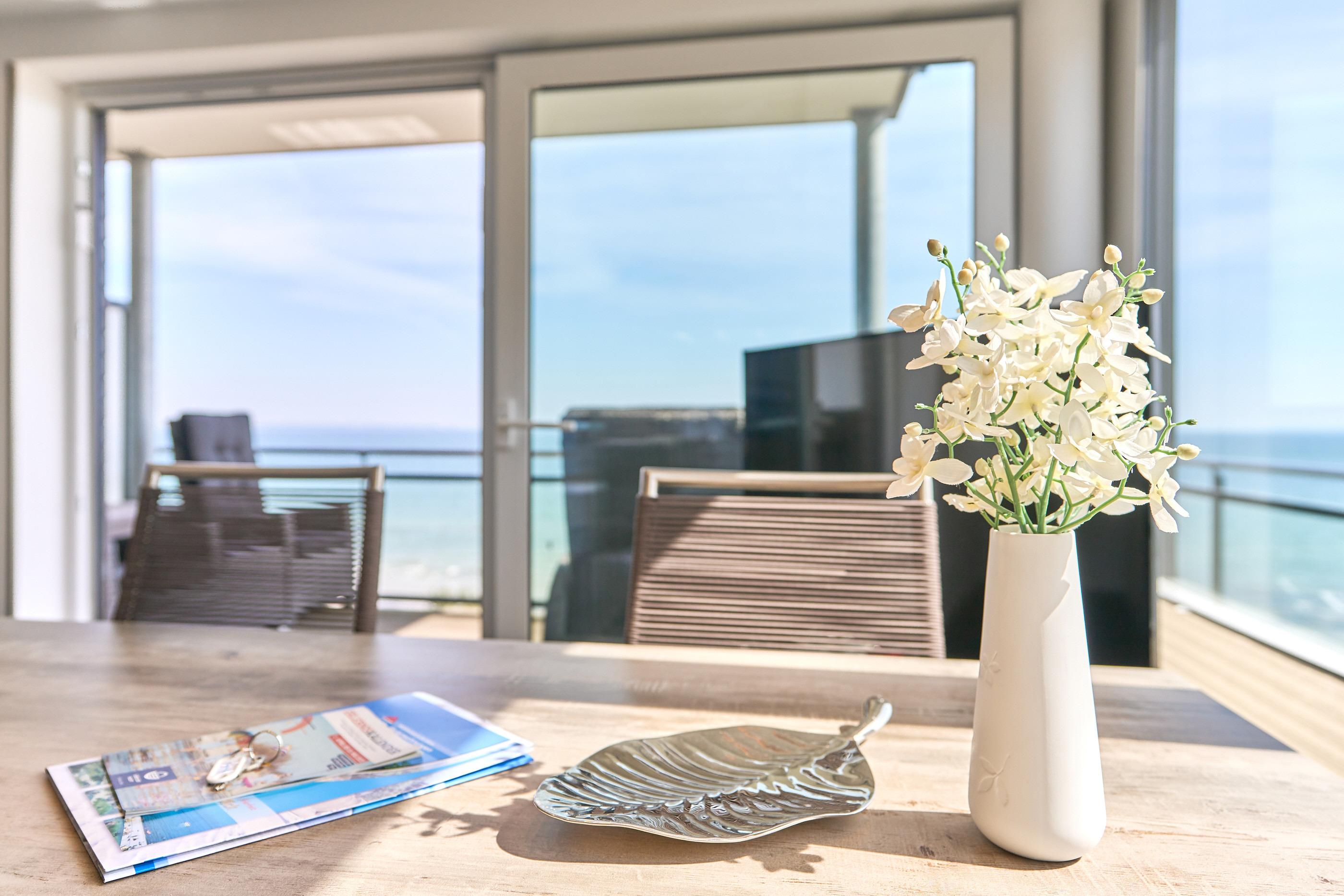 Bereits im Flur können Sie schon auf die Ostsee blicken und weiter … Aus allen Räumen haben Sie Ostseeblick! In dieser traumhaften Wohnung werden Sie sich gleich wohlfühlen. Die Wohnzimmerdecke ist rundum abgesenkt und sorgt mit dem integrierten Licht für eine angenehme Atmosphäre. Das Sofa bietet Ihnen einen besonderen Sitzkomfort, das Canapee ist elektrisch verstellbar. Ihr Heimkinosystem bietet Ihnen Blu-ray, TV in 55 Zoll und ein 3-D-Soundsystem. Der Essbereich hat genügend Platz für vier Personen. Die anspruchsvolle Küche ist mit hochwertigen Elektrogeräten ausgestattet. Geschirrspülmaschine, Induktionsherd, Mikrowelle, Backofen, Wasserkocher, Kaffeemaschine, Pad-Kaffeemaschine und vieles mehr. Der halbumlaufende Balkon ist mit Loungemöbeln ausgestattet – träumen Sie schon?