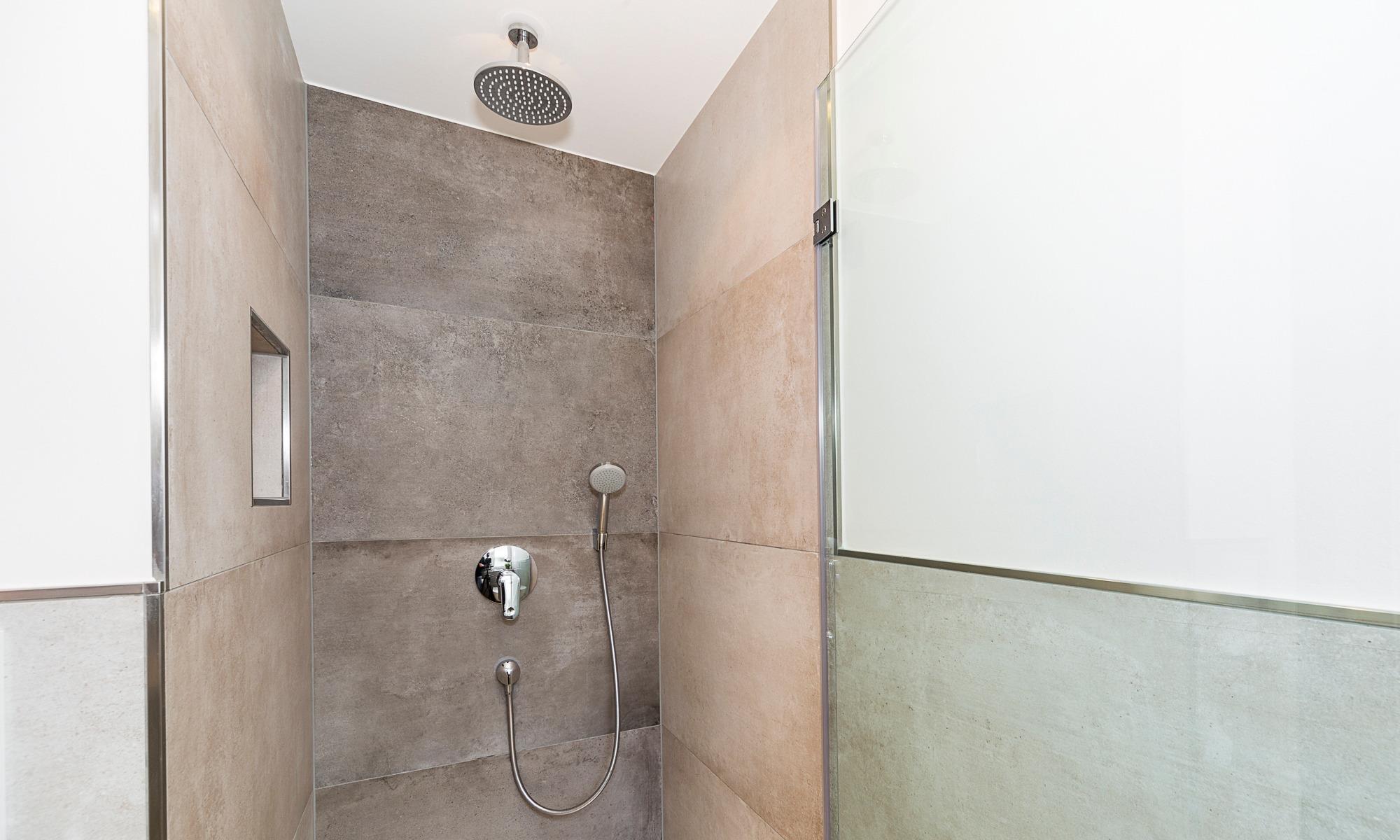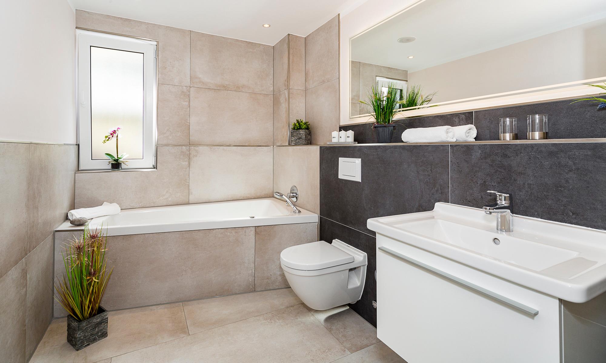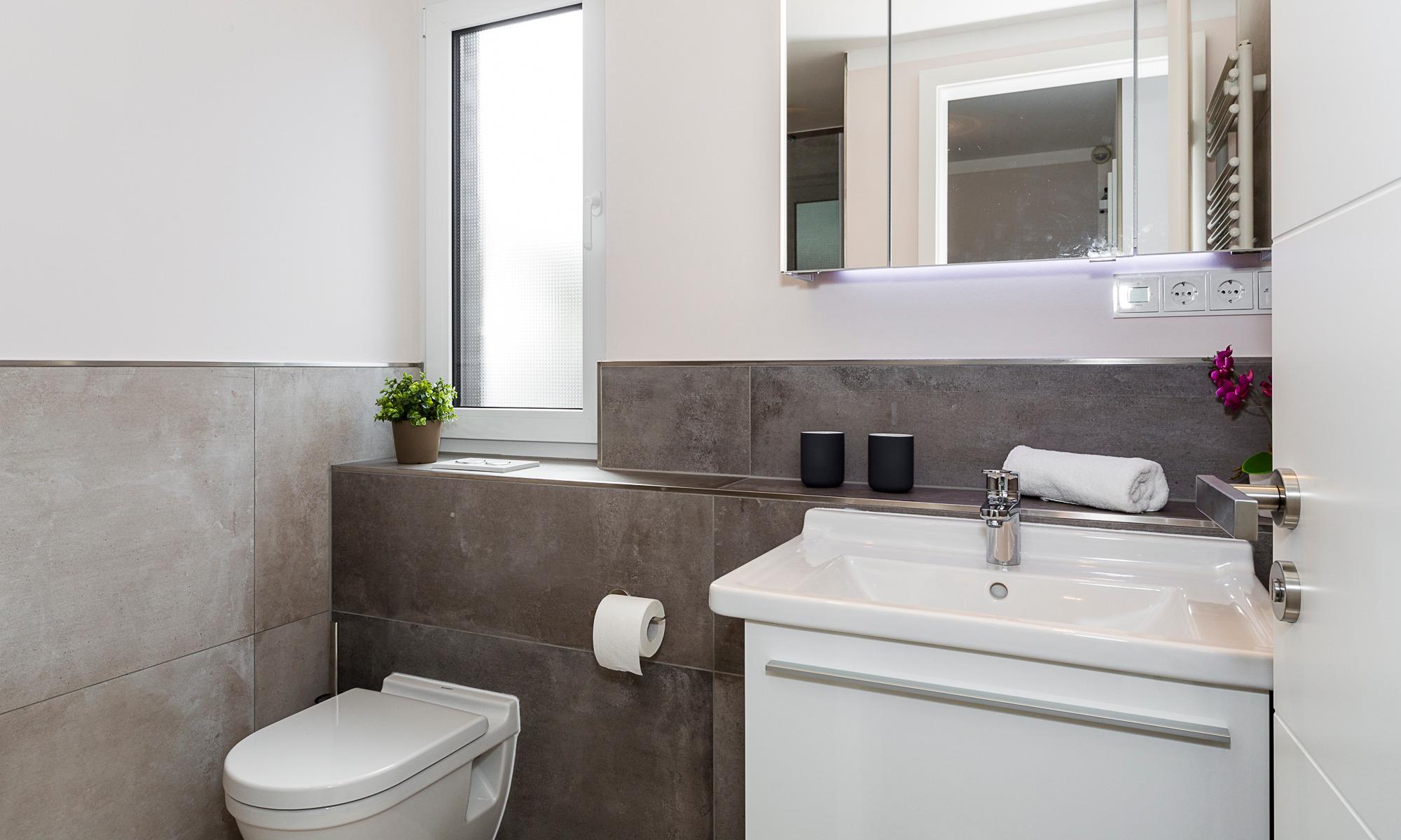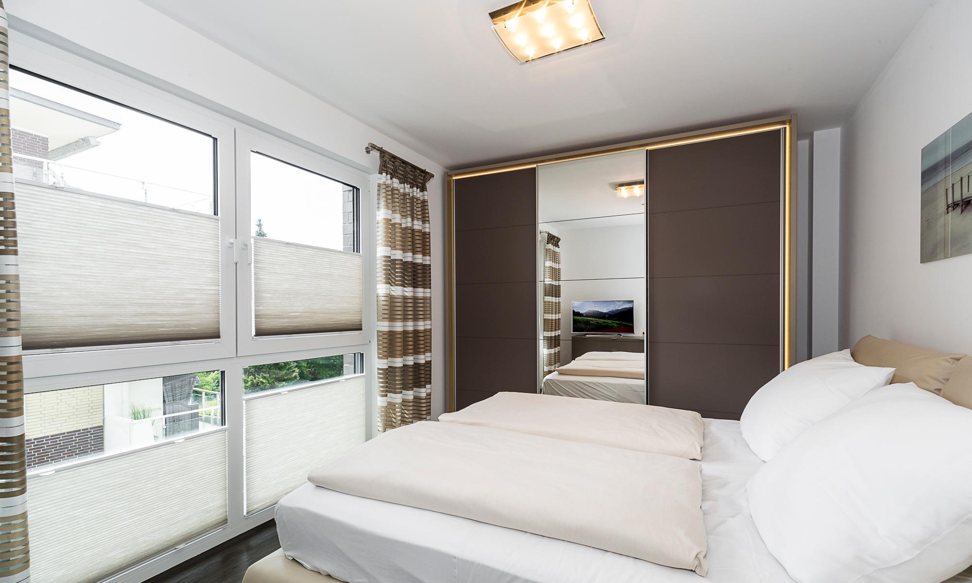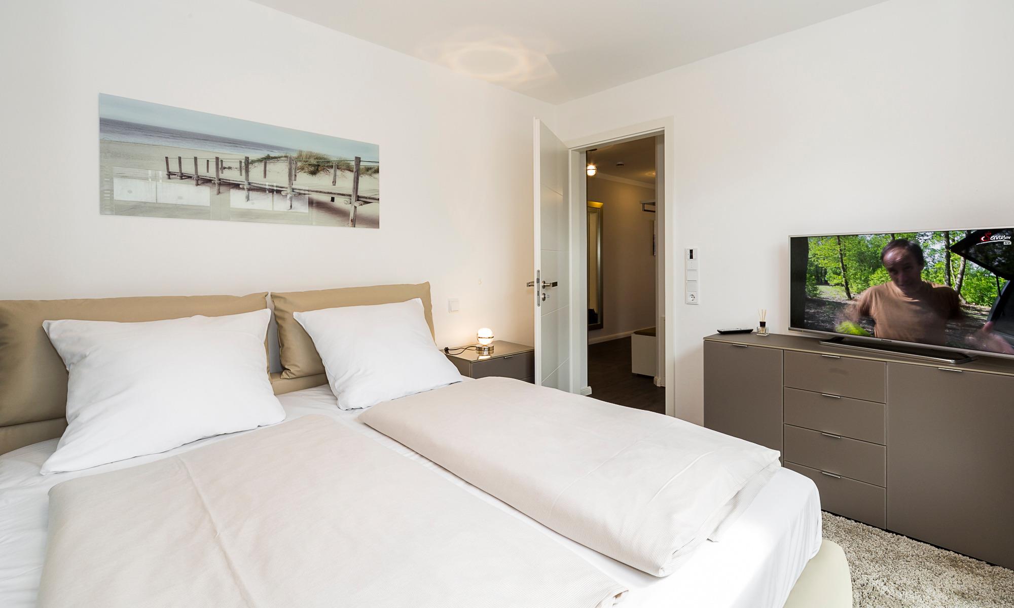 Die Schlafzimmer sind mit Ruf-Boxspringbetten (180 x 200m) sowie mit je einem Flach-TV eingerichtet. Die beiden Tageslichtbäder sind sehr ansprechend, große Fliesen wurden hier verwendet. Das erste Bad hat eine bodengleiche Dusche mit Kopfbrause und Handbrause, das zweite Bad eine Badewanne, mit Whirlpool-Funktion.