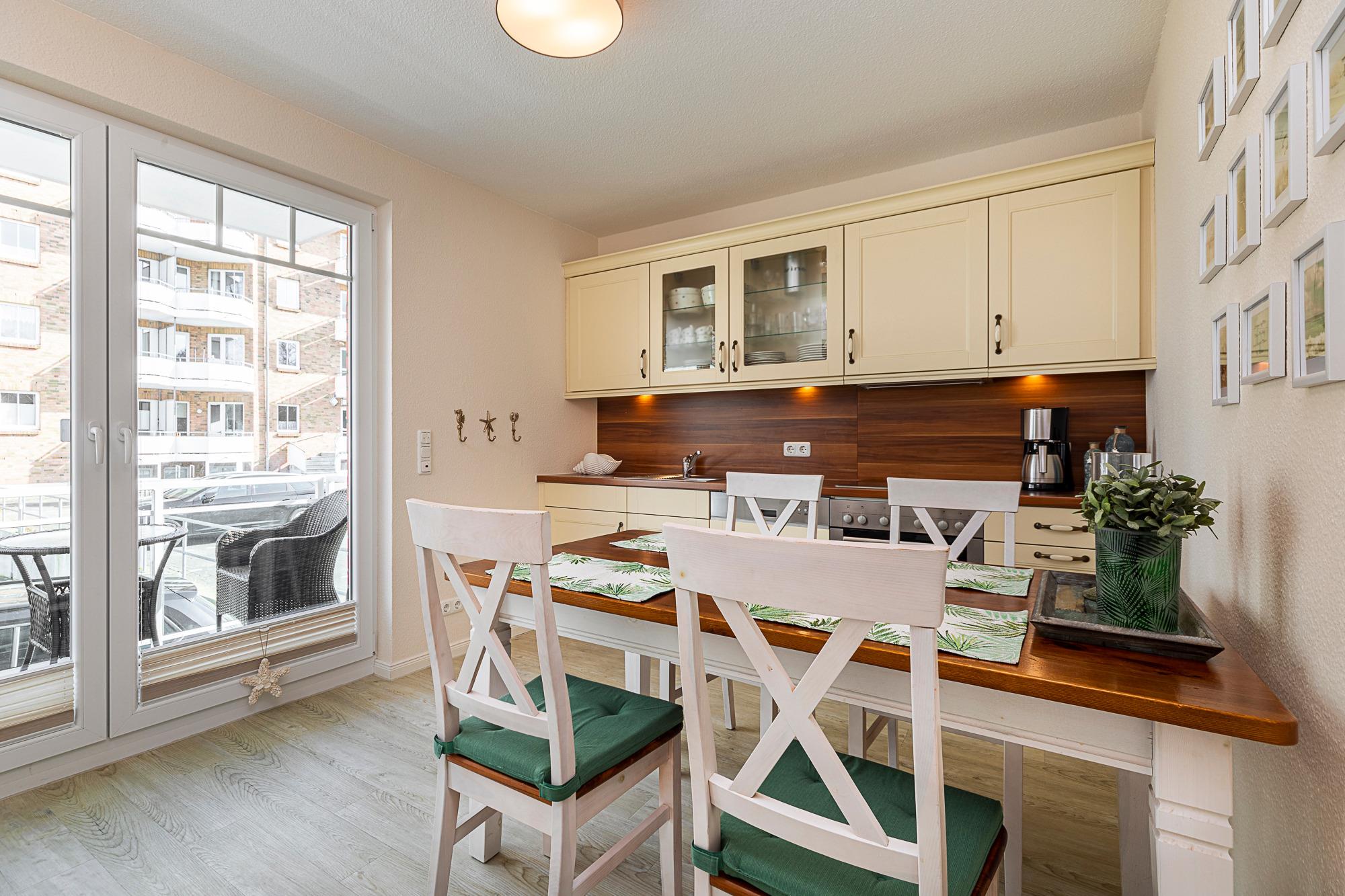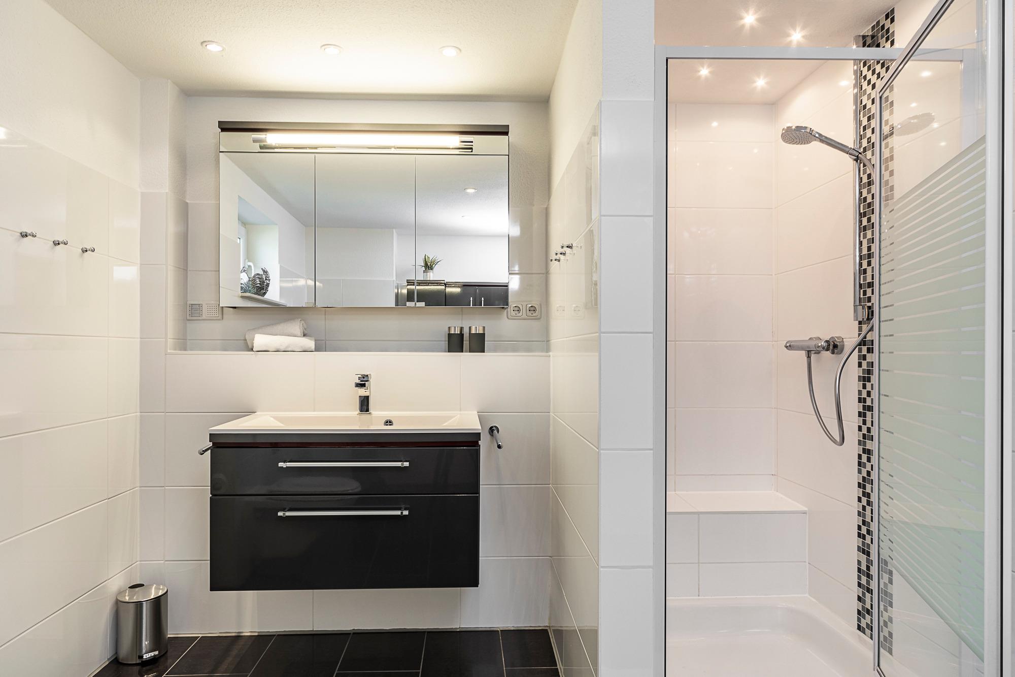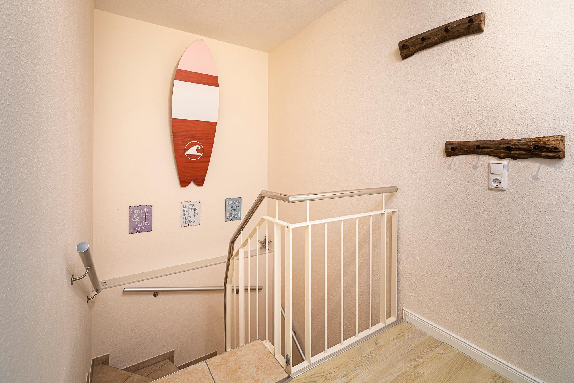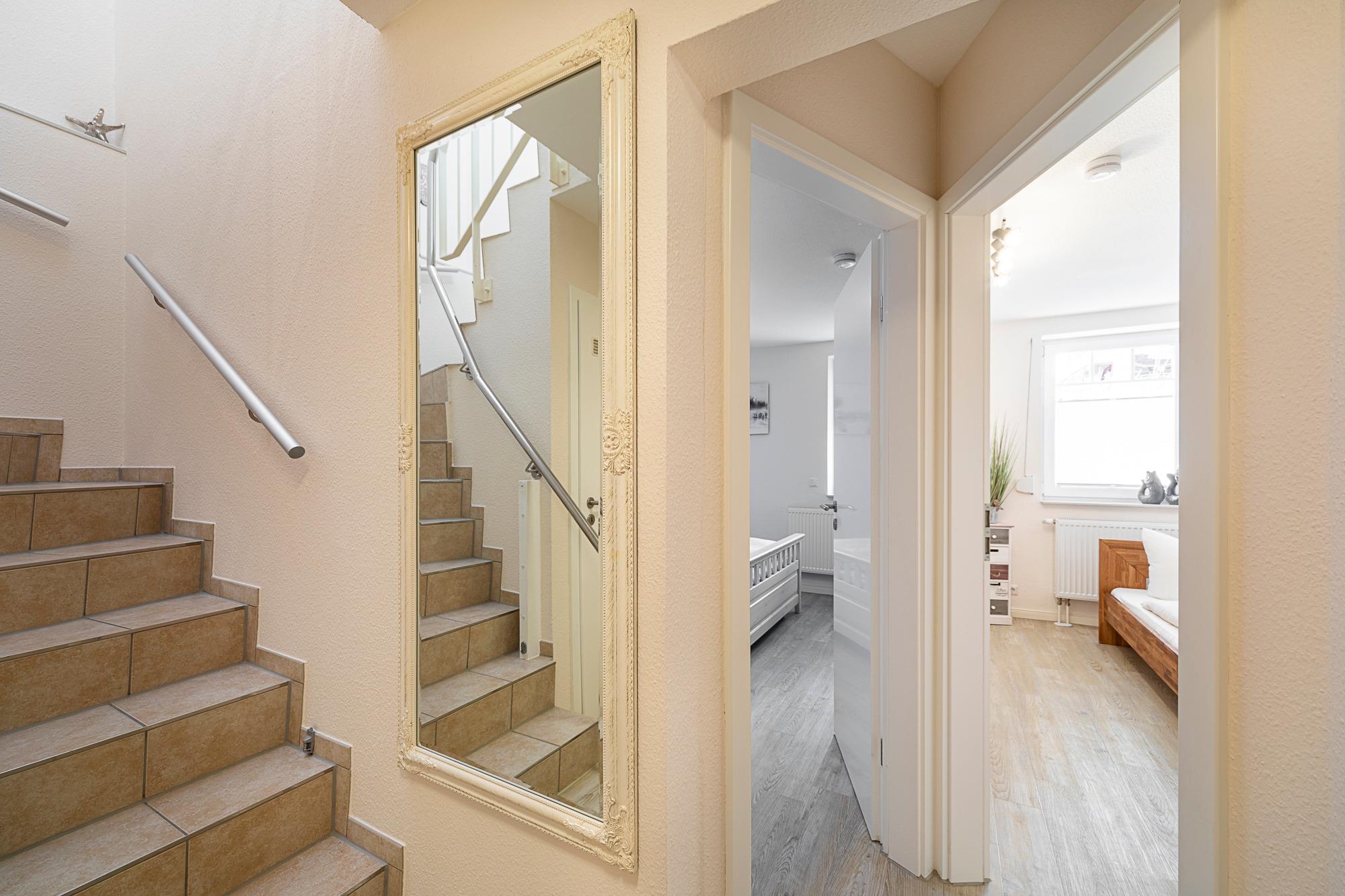 Flurbereich mit Gäste-WC. Der Wohnbereich ist hell und freundlich, mit einem bequemen Sofa sowie mit einem TV-Bereich ausgestattet. Vom Wohnzimmer aus haben Sie Zugang zu dem kleinen Balkon mit Blick zum Kurpark. Separate Küche mit einer Einbauküche, einem Essbereich (Platz für vier Personen). Von hier aus haben Sie Zugang zum zweiten kleinen Balkon. Über eine bequeme Treppe erreichen Sie im Souterrain die Schlafräume sowie das Tageslicht-Duschbad, in moderner und heller Optik gehalten. Im ersten Schlafzimmer stehen Ihnen ein Doppelbett (1,80 x 2,00m) sowie ein Kleiderschrank zur Verfügung. Im zweiten Schlafzimmer befindet sich ein Einzelbett sowie ein TV. Das dritte Schlafzimmer ist ein innenliegendes Zimmer und ist ebenso mit einem Einzelbett ausgestattet. Alle Fenster verfügen über Außenrollläden. In dieser Wohnung steht Ihnen kostenloses WLAN zur Verfügung.