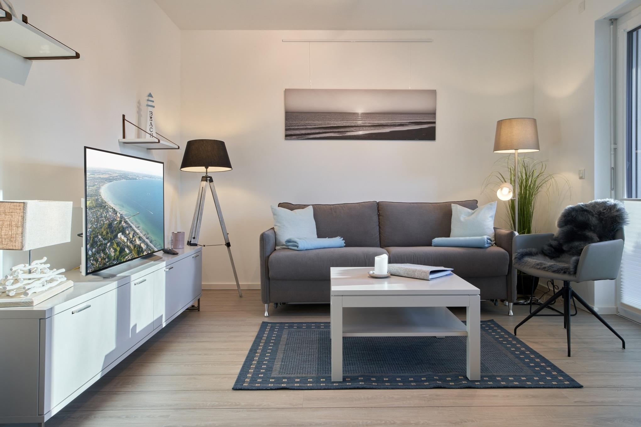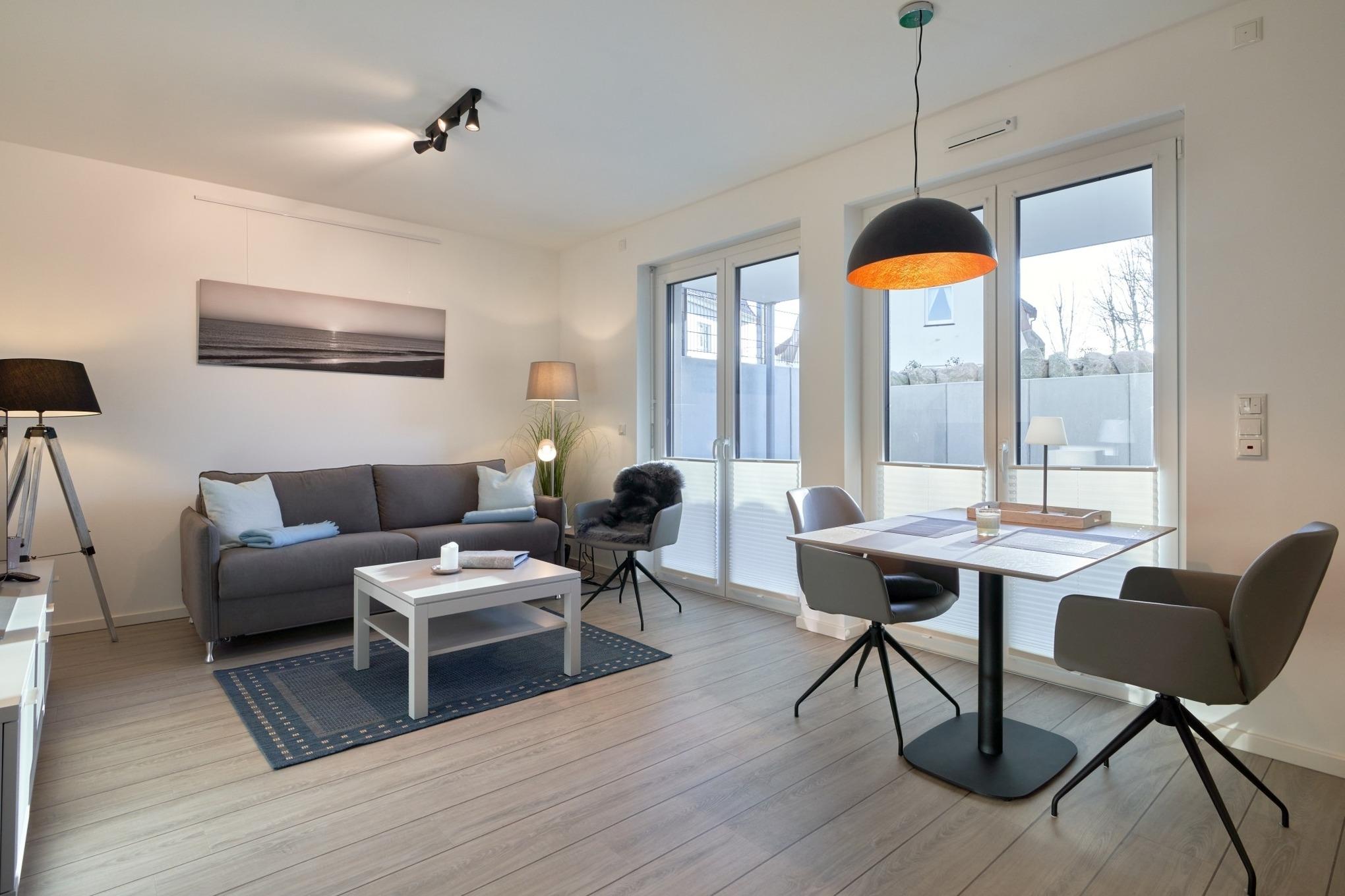 Lichtdurchflutetes Wohnzimmer durch die bodentiefen Fenster, die mit einem Licht- und Sichtschutz versehen sind. Außenrollläden im Wohnzimmer. Hochwertige Einbauküche mit Induktionsherd, Backofen, Kühlschrank mit Gefrierfach, Geschirrspüler, Toaster, Wasserkocher, Eierkocher, Elektro-Tischgrill, Sodastreamer, Espressomaschine, Nespresso-Kaffeemaschine mit Milchaufschäumer. Feiner Essbereich. Der Wohnbereich ist mit einem bequemen Sofa( läßt sich mit wenigen Handgriffen in ein Schlafsofa verwandeln), einem Wohnzimmertisch, einem TV (48 Zoll) sowie einem Internetradio ausgestattet. Aus dem Wohnbereich gelangen Sie auf die Terrasse nach Süden. Hier stehen Ihnen Tisch und zwei Stühle zur Verfügung.