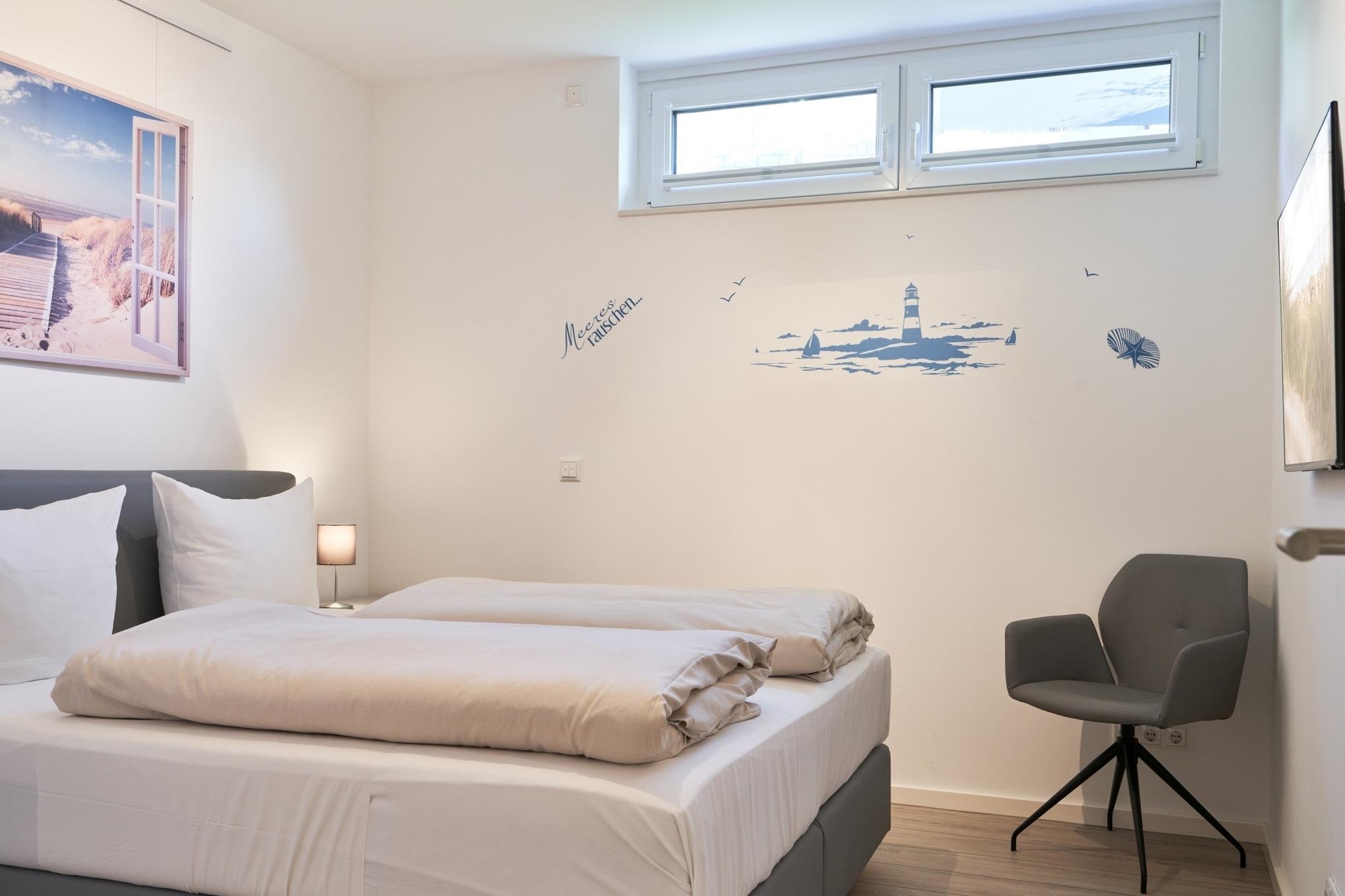 Das Schlafzimmer ist mit einem Boxspringbett (1,80mx2,00m) ausgestattet und verfügt über einen Einbauschrank, 2 Nachttische sowie einen Wand-TV. [nbsp] (43 Zoll). Das Duschbad mit bodengleicher Dusche, Regendusche sowie Handbrause, Handtuchheizkörper, Fön, Kosmetikspiegel. Die ganze Wohnung ist mit einer Fußbodenheizung sowie mit einem Sicht- bzw. Lichtschutz an allen Fenstern ausgestattet.