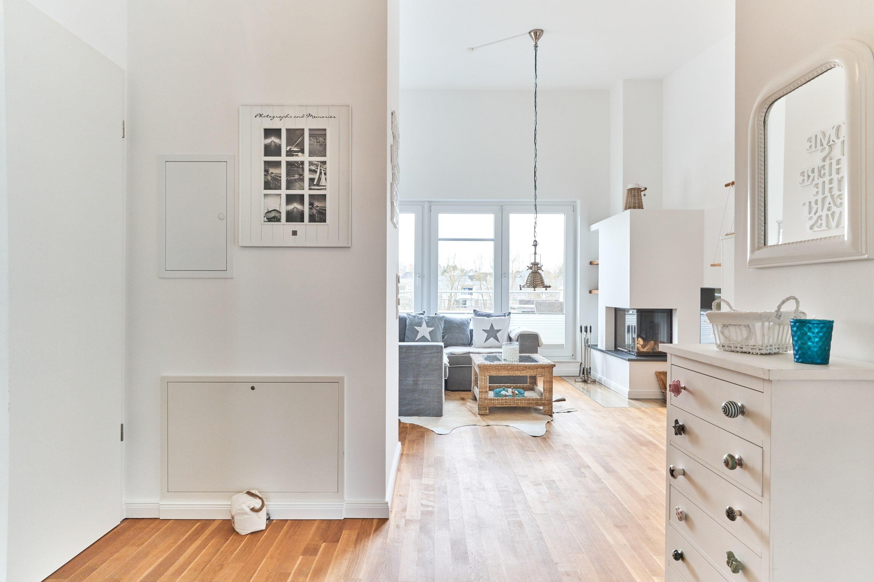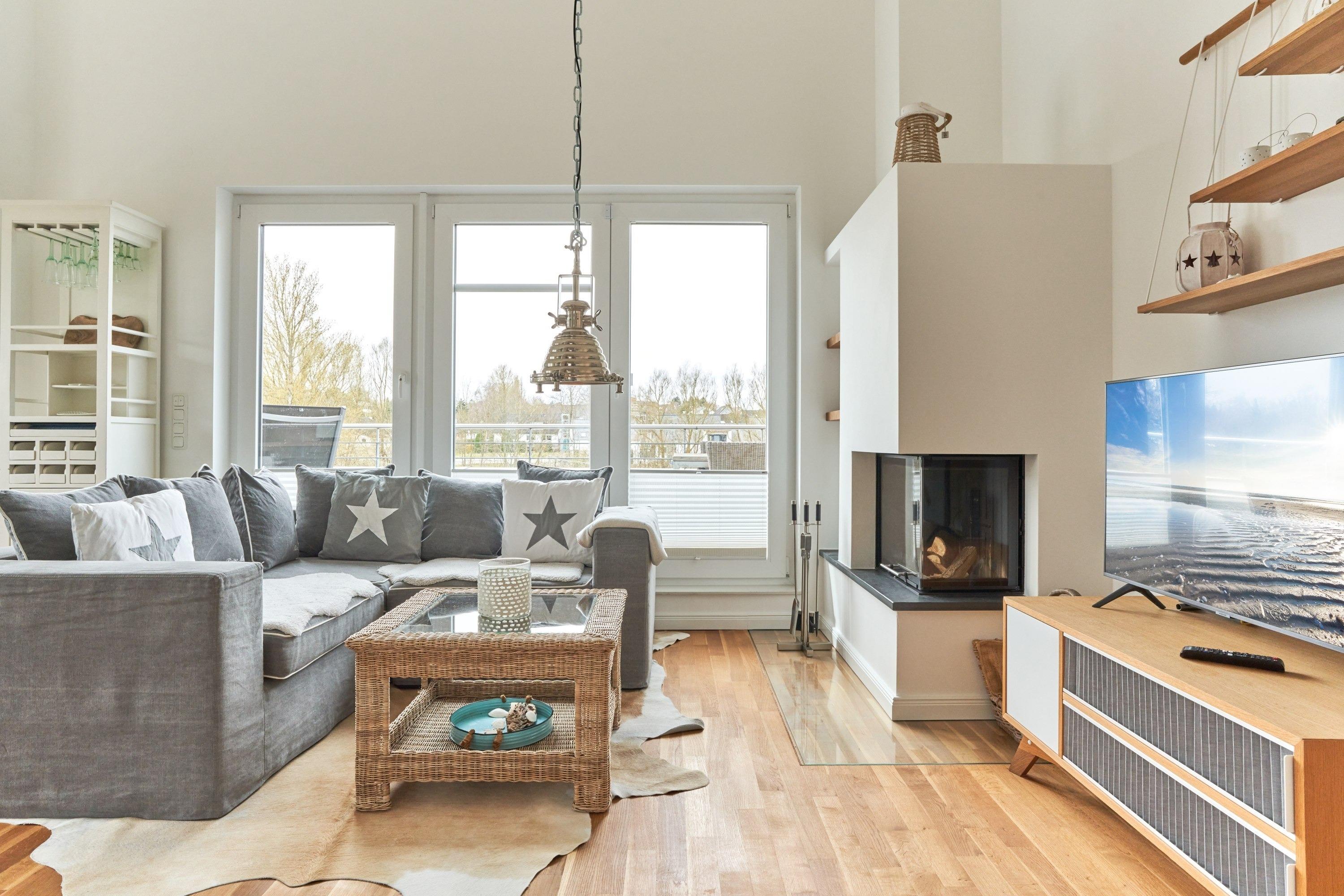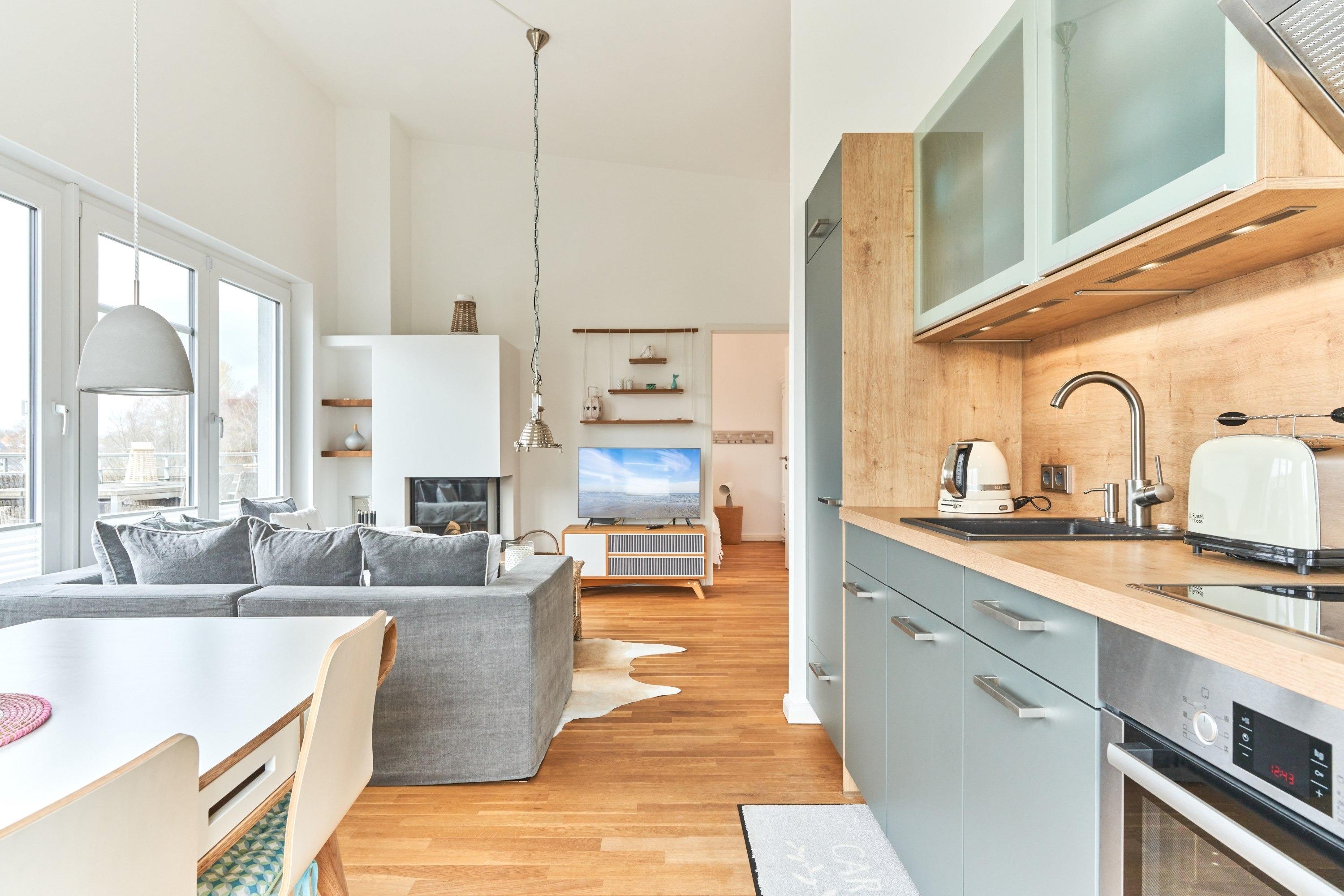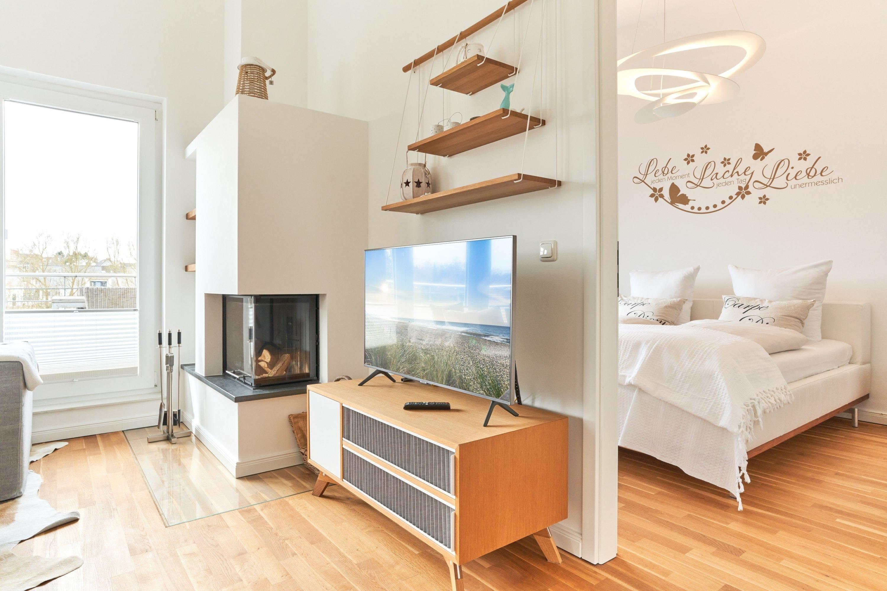 Die Wohnung strahlt eine helle, behagliche Gemütlichkeit aus. Der wohlig warme Holzkamin verzaubert Sie in der Winterzeit mit dem leisen Knistern und Knacken. Die Einbauküche im Wohn-Essbereich ist komplett ausgestattet und lässt keine Wünsche offen; Küchenzeile mit Backofen, Ceran-Kochfeld, Elektroherd, Geschirrspüler, Kühlschrank und Gefrierschrank, Filterkaffeemaschine, Nespresso-Maschine. Der angrenzende Essbereich bietet Platz für bis zu 4 Personen. Der Wohnbereich ist mit einem Sofa, einem Wohnzimmertisch und einem großen TV ausgestattet. Aus allen Räumen gelangen Sie auf die herrliche Dachterrasse nach Südwesten. Hier stehen Ihnen ein Strandkorb, Tisch und Stühle sowie zwei Liegen zur Verfügung.