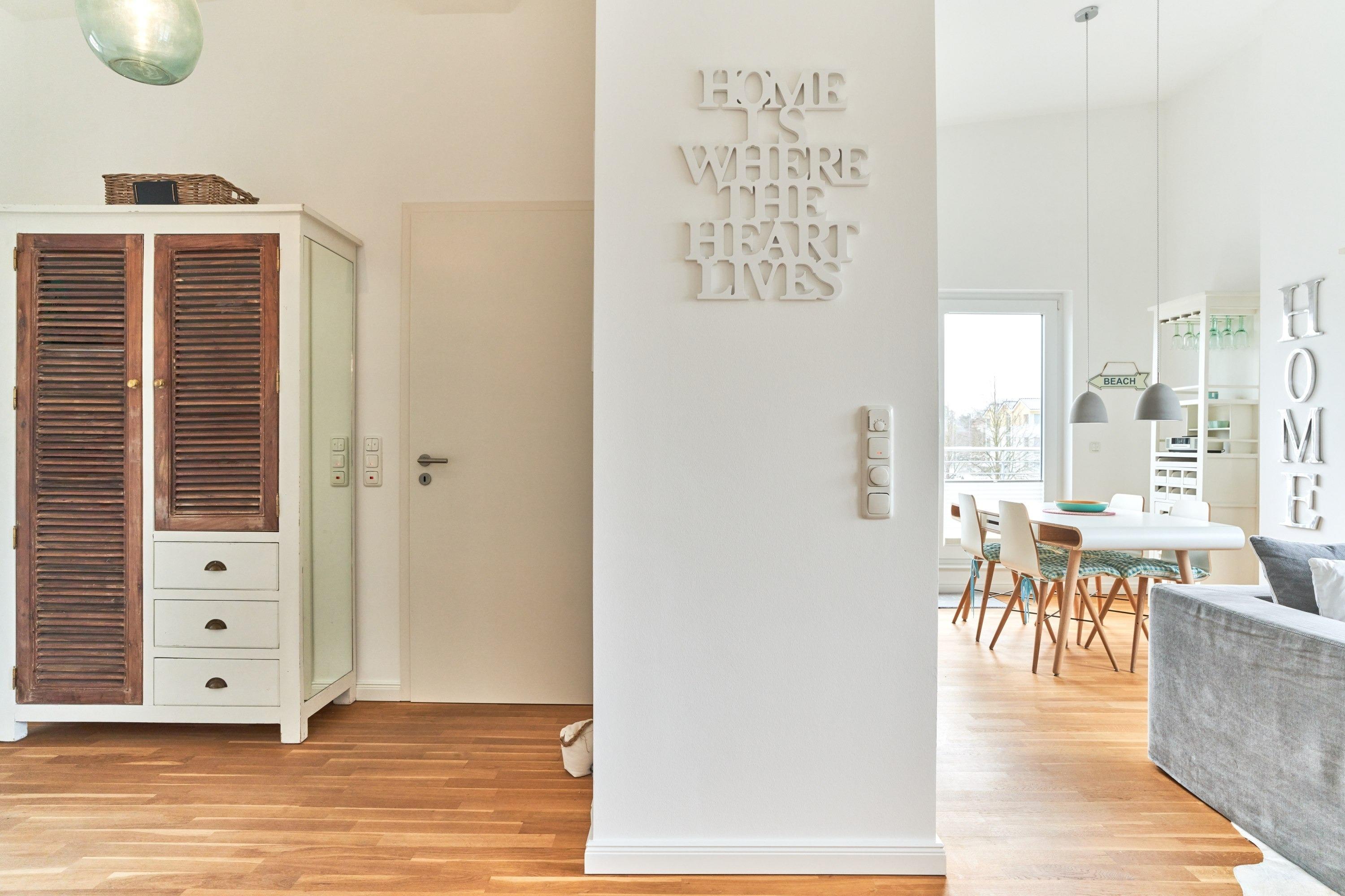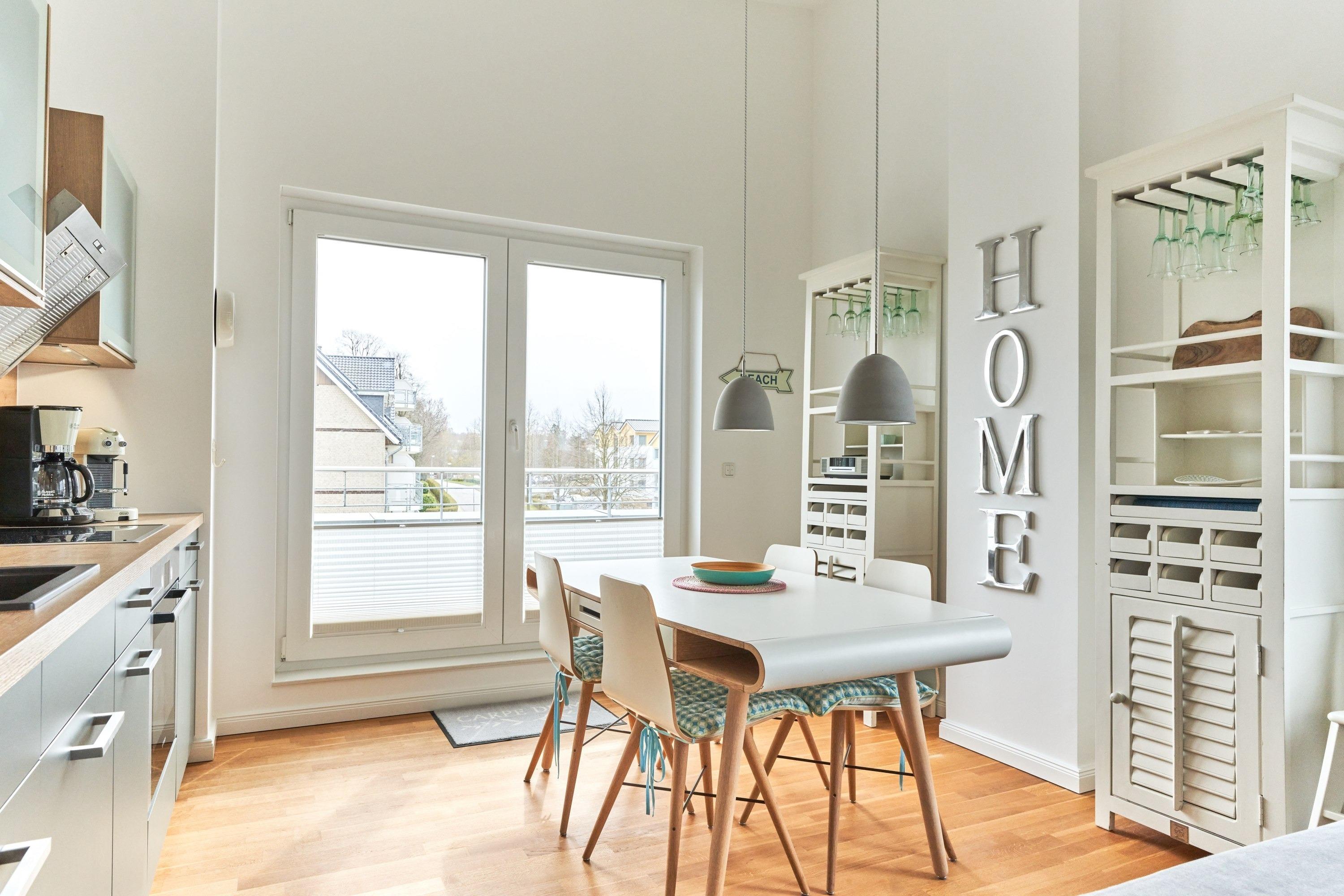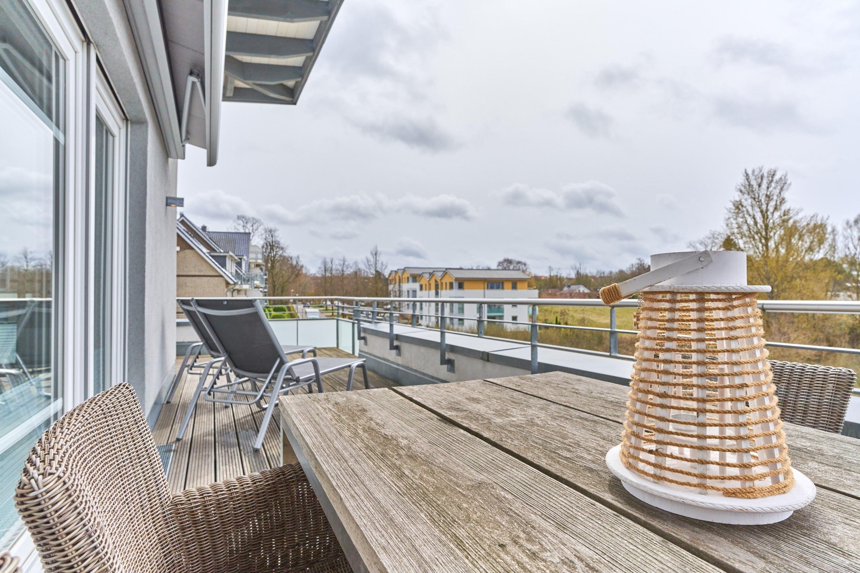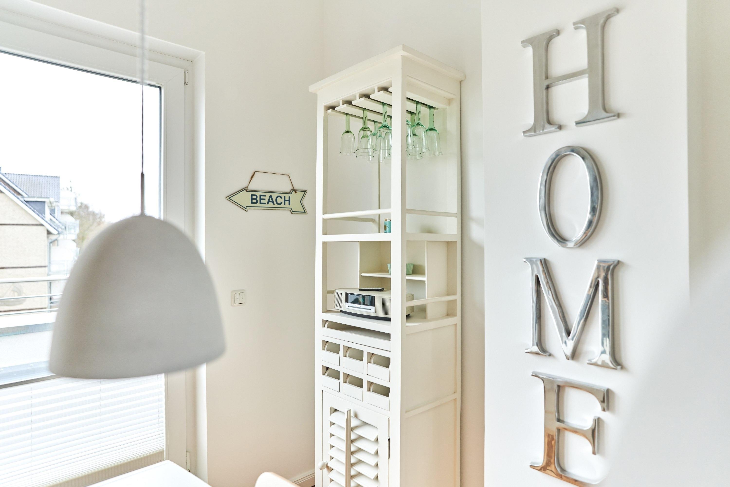 Die Wohnung strahlt eine helle, behagliche Gemütlichkeit aus. Der wohlig warme Holzkamin verzaubert Sie in der Winterzeit mit dem leisen Knistern und Knacken. Die Einbauküche im Wohn-Essbereich ist komplett ausgestattet und lässt keine Wünsche offen; Küchenzeile mit Backofen, Ceran-Kochfeld, Elektroherd, Geschirrspüler, Kühlschrank und Gefrierschrank, Filterkaffeemaschine, Nespresso-Maschine. Der angrenzende Essbereich bietet Platz für bis zu 4 Personen. Der Wohnbereich ist mit einem Sofa, einem Wohnzimmertisch und einem großen TV ausgestattet. Aus allen Räumen gelangen Sie auf die herrliche Dachterrasse nach Südwesten. Hier stehen Ihnen ein Strandkorb, Tisch und Stühle sowie zwei Liegen zur Verfügung.