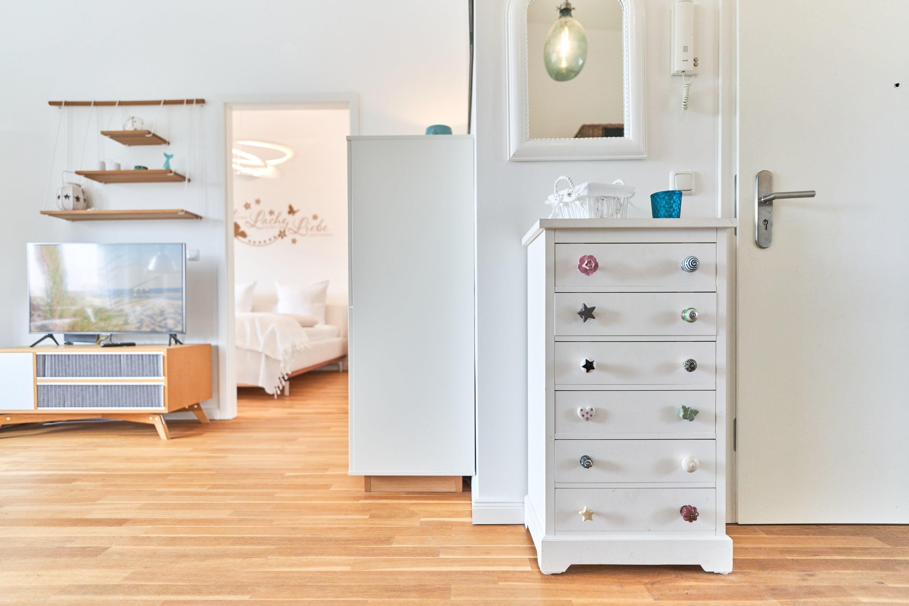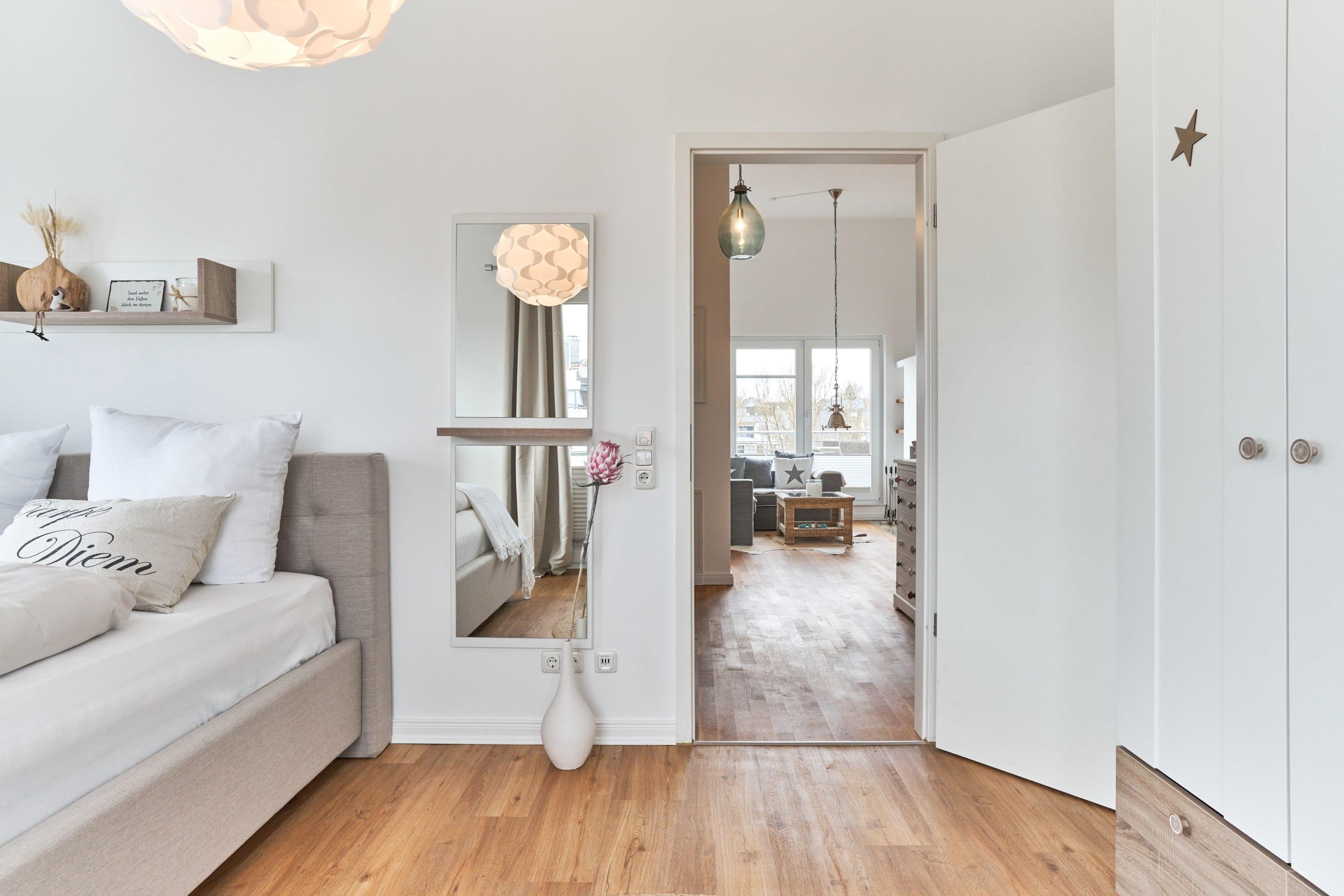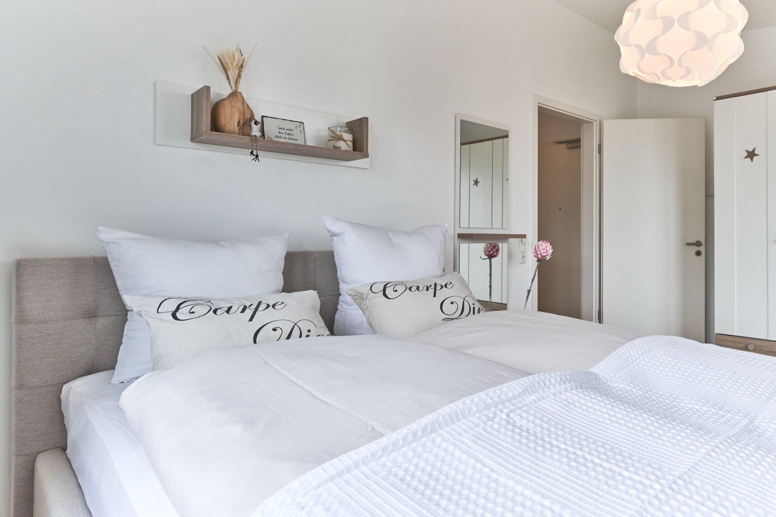Das 1. Schlafzimmer ist mit einem Polsterbett (1,80 x 2,00m) ausgestattet und verfügt über einen Kleiderschrank, 2 Nachttische und einen TV. Im 2. Schlafzimmer stehen Ihnen ein Polsterdoppelbett (1,60 x 2,00m) und ein Kleiderschrank zur Verfügung. Sind Sie es gewohnt, im Dunkeln zu schlafen, kein Problem, die Fenster sind mit Verdunklungsvorhängen ausgestattet. Das Tageslicht-Duschbad in heller Optik mit bodengleicher Dusche und Handtuchheizkörper, Fön, Kosmetikspiegel, Waschmaschine. Die gesamte Wohnung ist mit einer Fußbodenheizung ausgestattet.