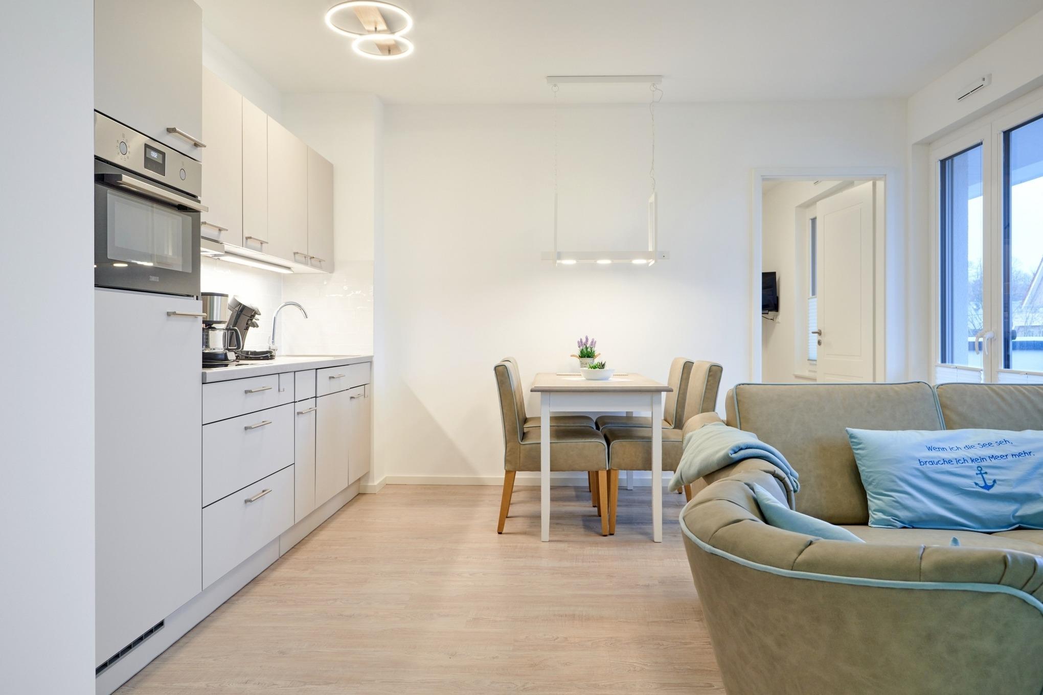 Der Wohn-Essbereich ist mit einer Einbauküche, einem Essbereich sowie einem Wohnbereich mit TV ausgestattet.