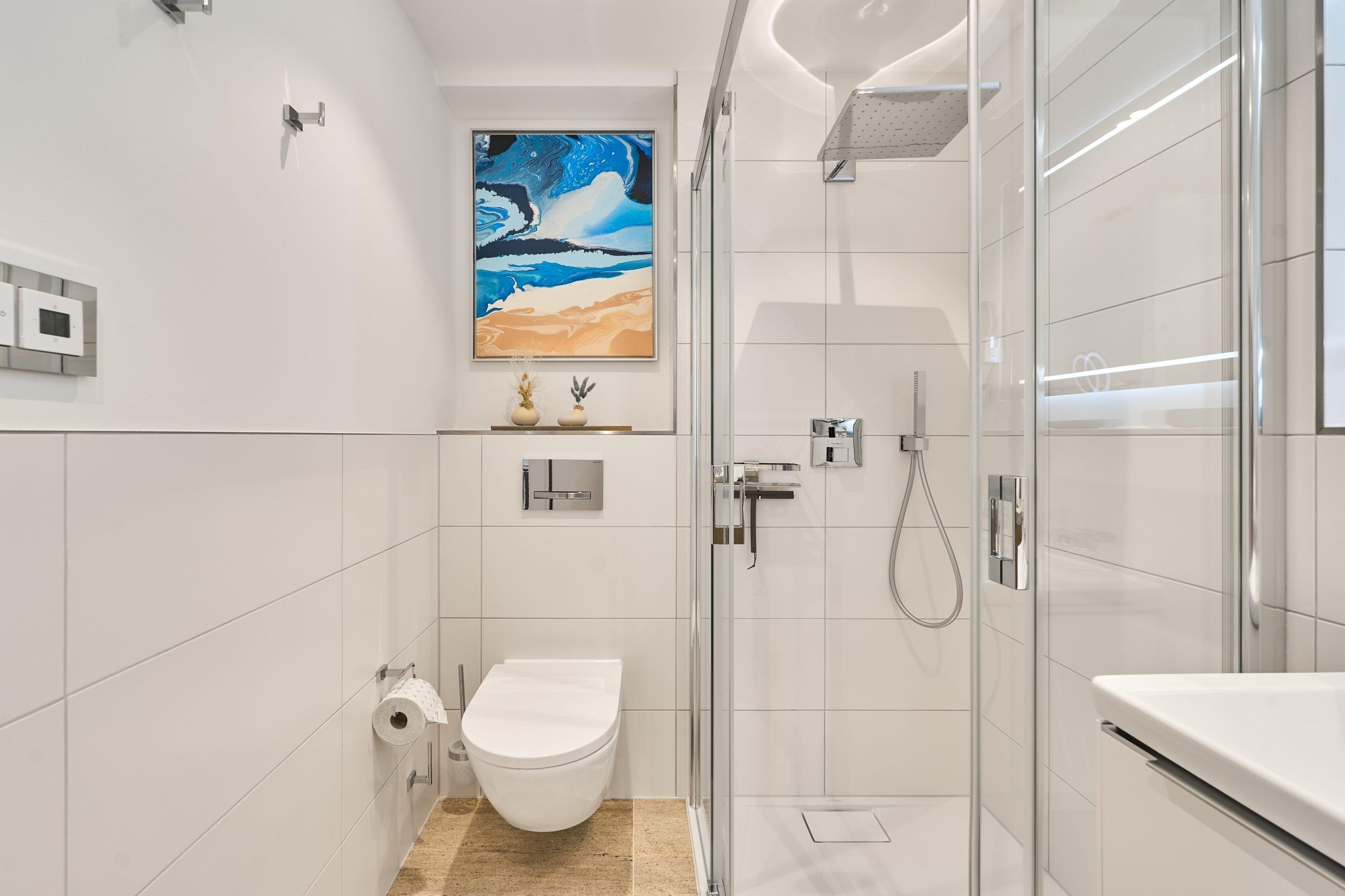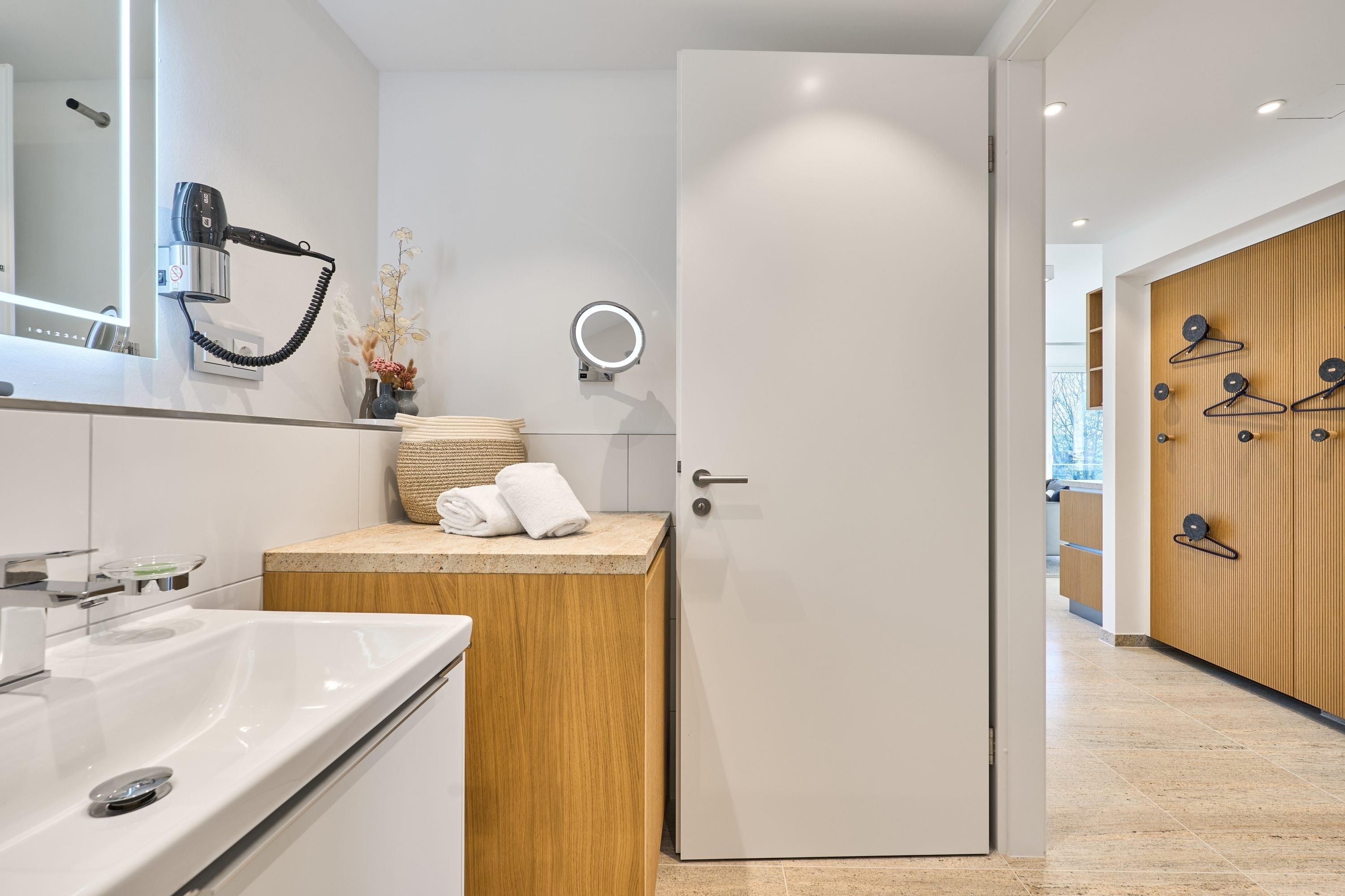 Wellnessbad: In Ihrem mit viel Liebe von Villeroy [&] Boch gestalteten Bad lädt Sie eine Regendusche zum Erfrischen ein. Ein Waschtisch mit Unterschrank, WLAN-Radio, Handtuchheizkörper sowie ein beleuchteter Kosmetikspiegel und Haartrockner runden das Wohlfühlpaket ab. Der integrierte Miele-Waschtrockner liegt schön verborgen hinter einer Echtholztür. Die darüberliegende Granitplatte bietet viel Ablagefläche für Ihre Kosmetikartikel.