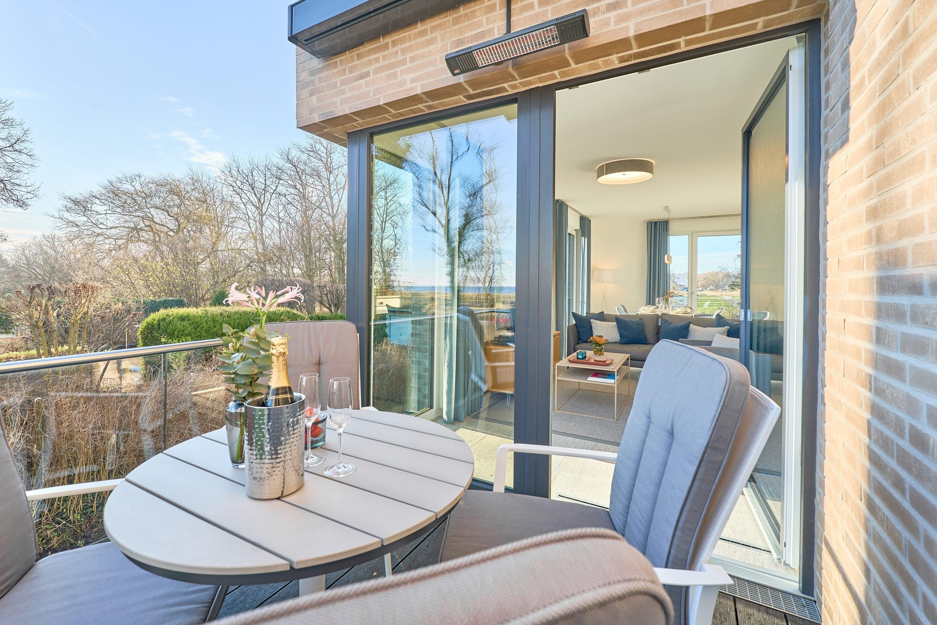 Balkon: Auf Ihrem sonnigen Südostbalkon lädt Sie eine stylische Esstischgruppe ein, den Anblick der Wellen auf sich wirken zu lassen. Auch an etwas kühleren Tagen können Sie hier geschützt durch eine elektrische Markise und gewärmt durch einen Infrarot-Balkonstrahler den Meerblick bewundern.