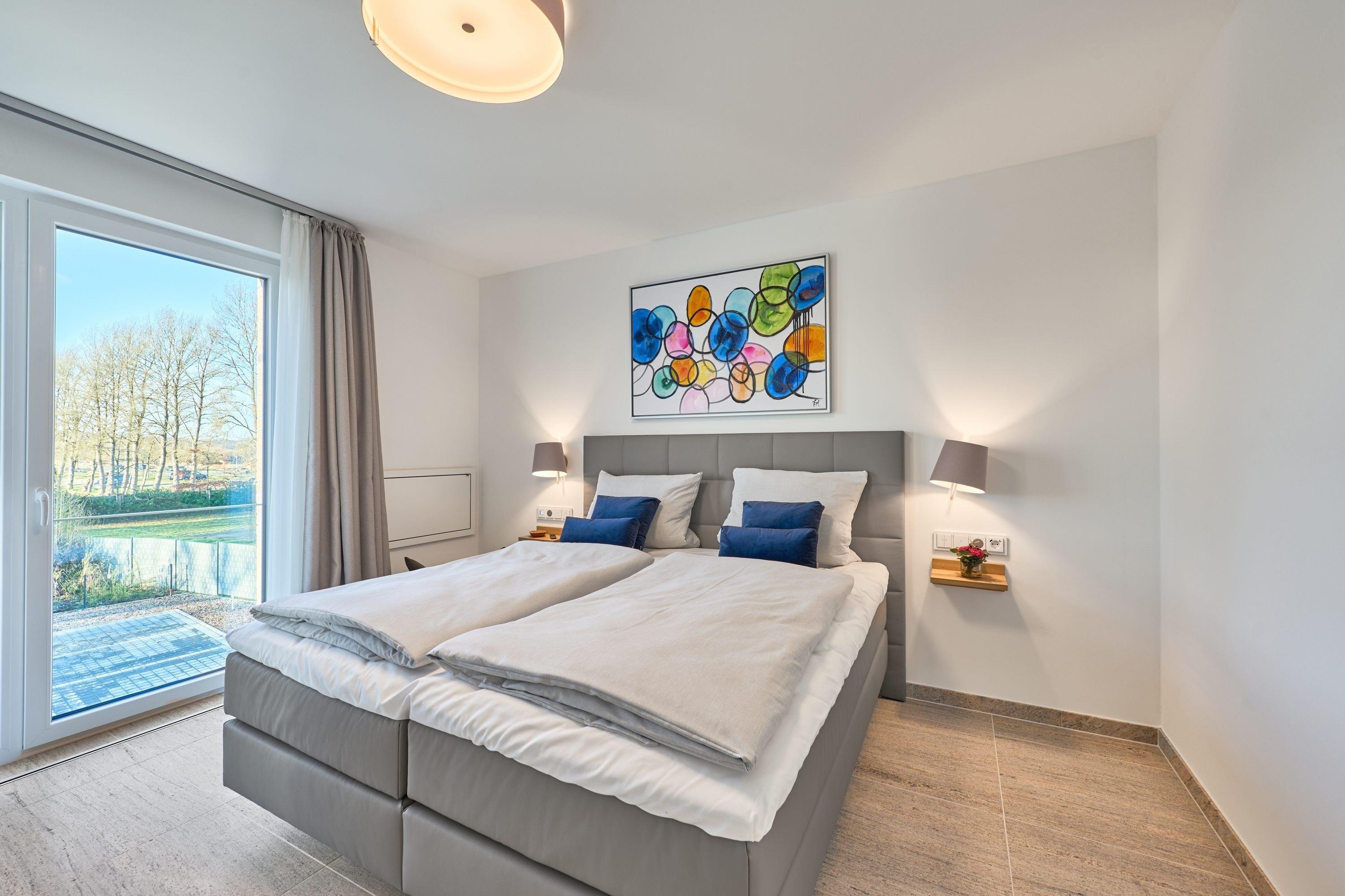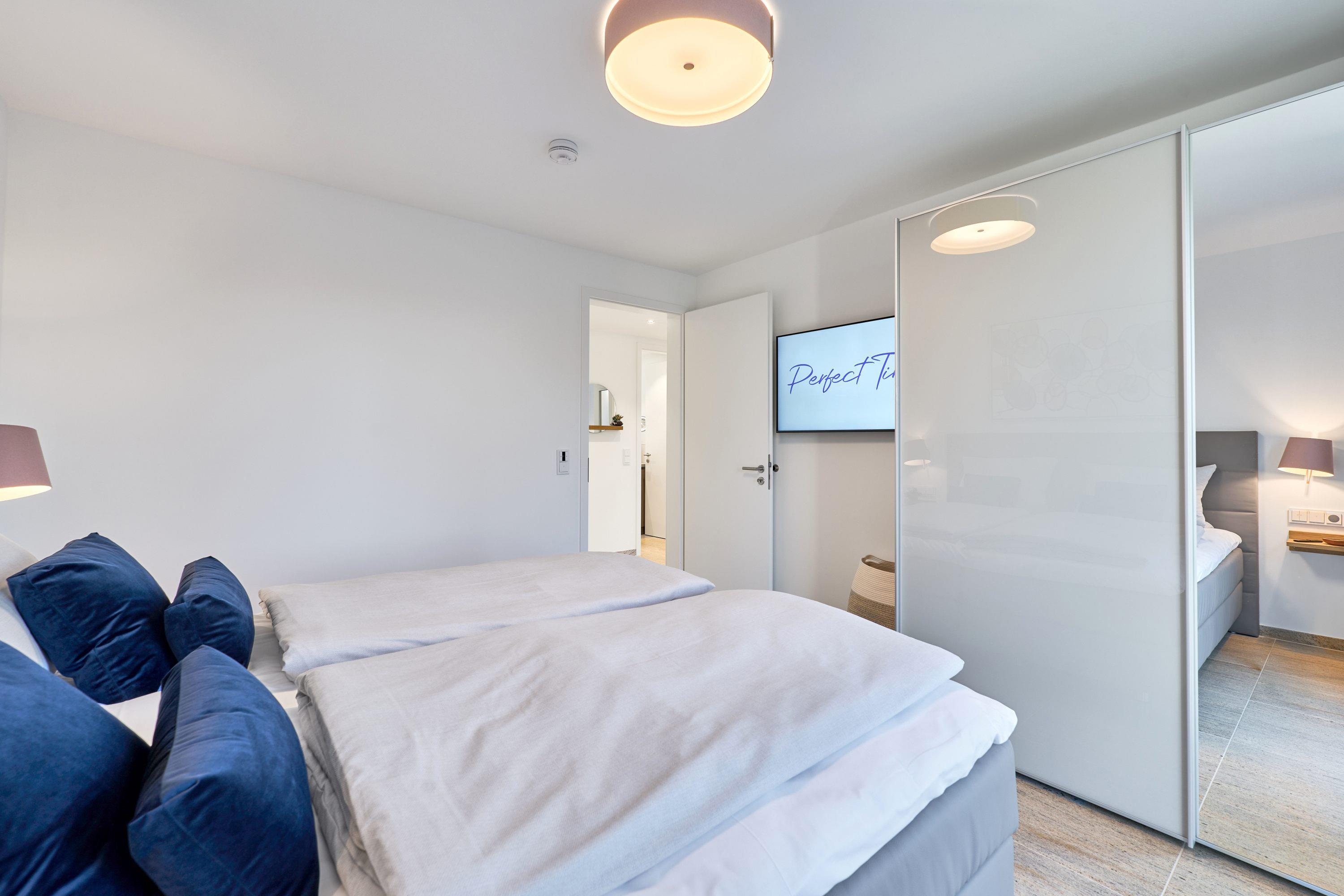 Schlafzimmer 1: In Ihrem großzügigen Schlafzimmer beginnen Sie den Tag mit einem herrlichen Blick ins ruhige Grüne. Für Ihren erholsamen Schlaf erwartet Sie hier ein hochwertiges Boxspringbett (1,80 x 2,00m). Ihre Kleidung findet in dem beleuchteten Schiebetüren-Kleiderschrank mit Spiegel ausreichend Platz. Selbstverständlich stehen Ihnen auch im Schlafzimmer ein Samsung-50"-Smart-TV und ein WLAN-Radio zur Verfügung. Ein ausklappbarer Sekretär mit LAN-Anschluss kann gerne als kleines Home-Office genutzt werden. Spezielle Verdunklungsvorhänge garantieren Ihnen einen ruhigen und gesunden Schlaf.