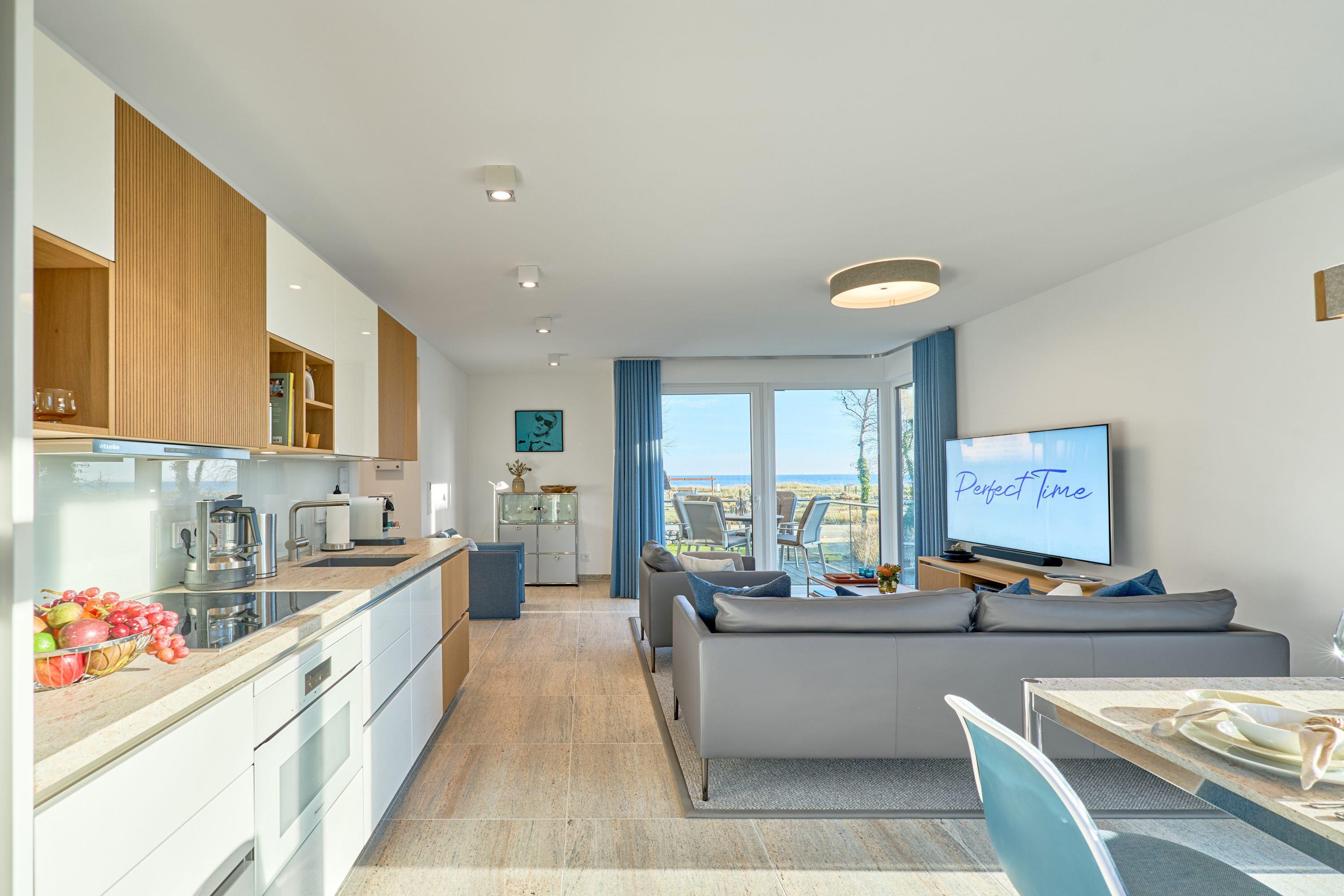 Wohn-Ess-Bereich: Bereiten Sie Ihr Frühstück oder andere kulinarische Spezialitäten in einer hochwertigen Küche mit Echtholz-Akzenten und Miele-Einbaugeräten, einer Komplettausstattung vom Eierlöffel bis zur Knoblauchpresse, einer Nespresso-Maschine sowie stylischem Rosenthal-Porzellan vor. Bewundern Sie den herrlichen Meerblick ganz entspannt vom Ledersofa oder Esstisch aus. Dafür stehen Ihnen Design-Klassiker von USM Haller (Esstisch und Vitrine) und COR (Ledersofa und Sessel) sowie Esstisch-Stühle der Designmarke VITRA bereit. Ein Samsung 65?-Smart-TV inkl. Soundbar, ein BOSE-Wave-Soundsystem für Radio und CD und ein kostenfreies und unbegrenztes Highspeed-WLAN sorgen für uneingeschränktes Entertainment und digitale Erlebnisse.
